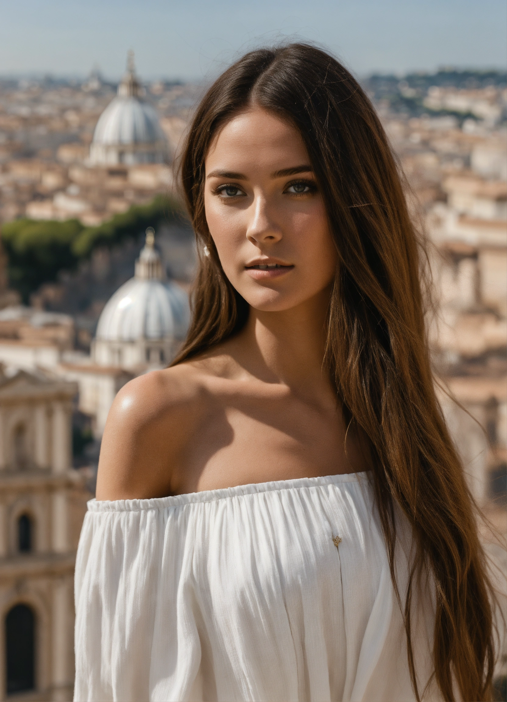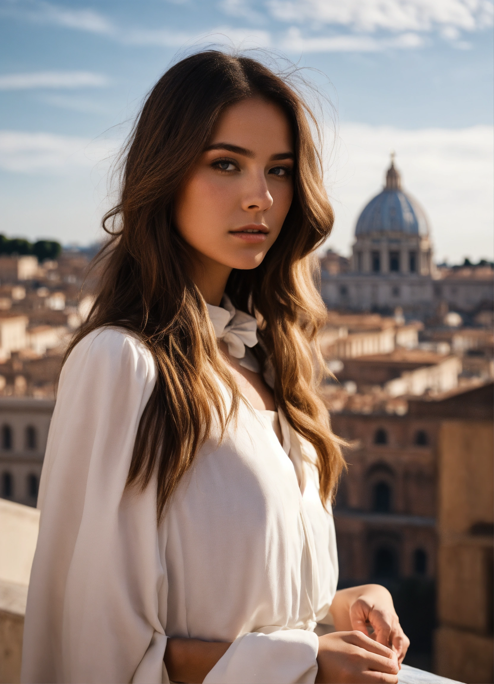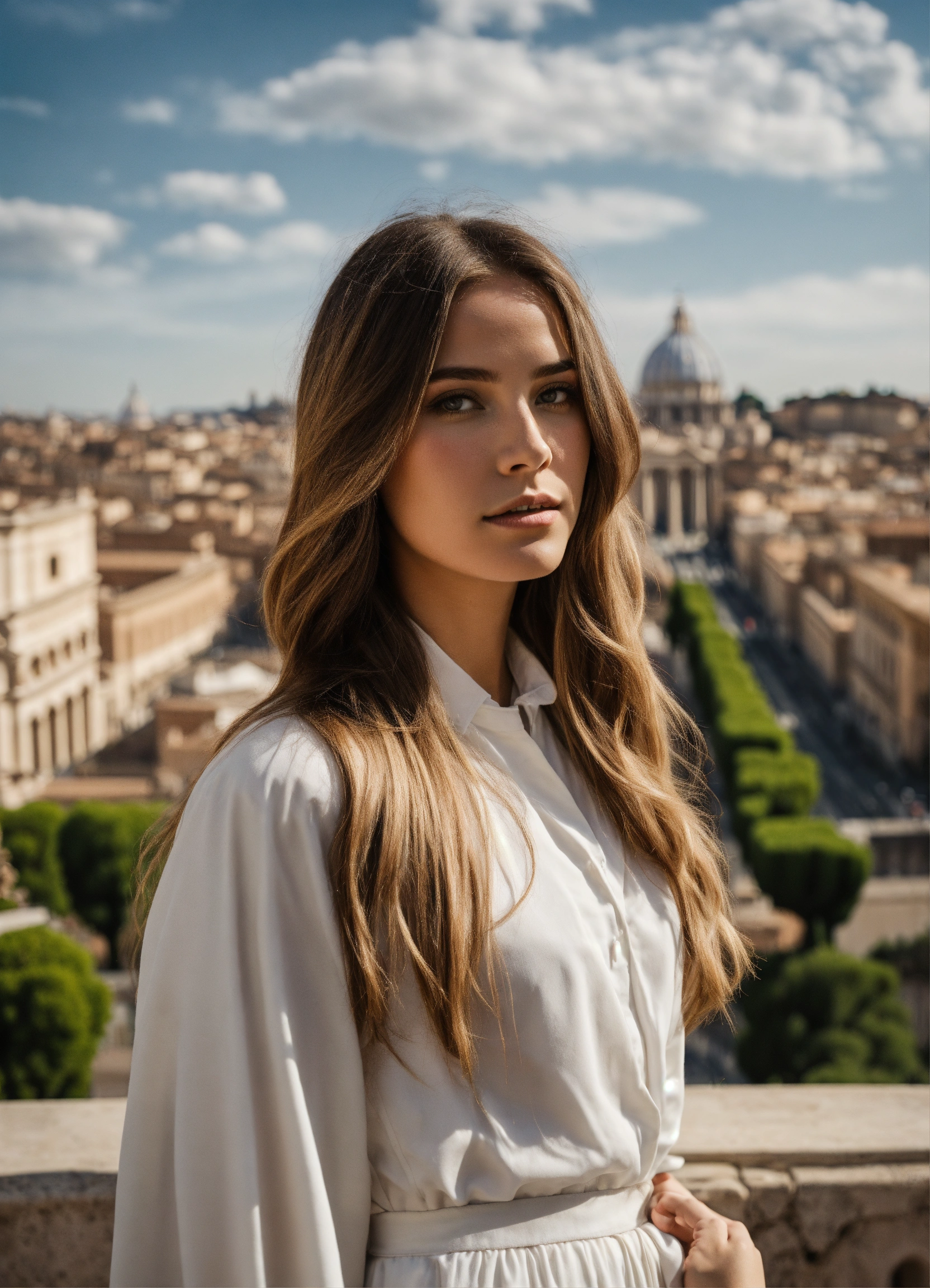 Photo of skyline of rome at day with a female model and the vatican, looking into the the camera; long hair, clothes in white color, photo in white color, innocence, perfect hands