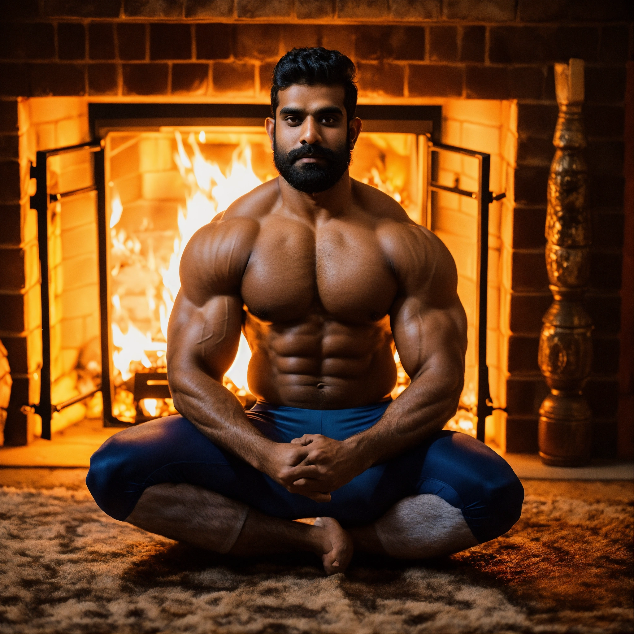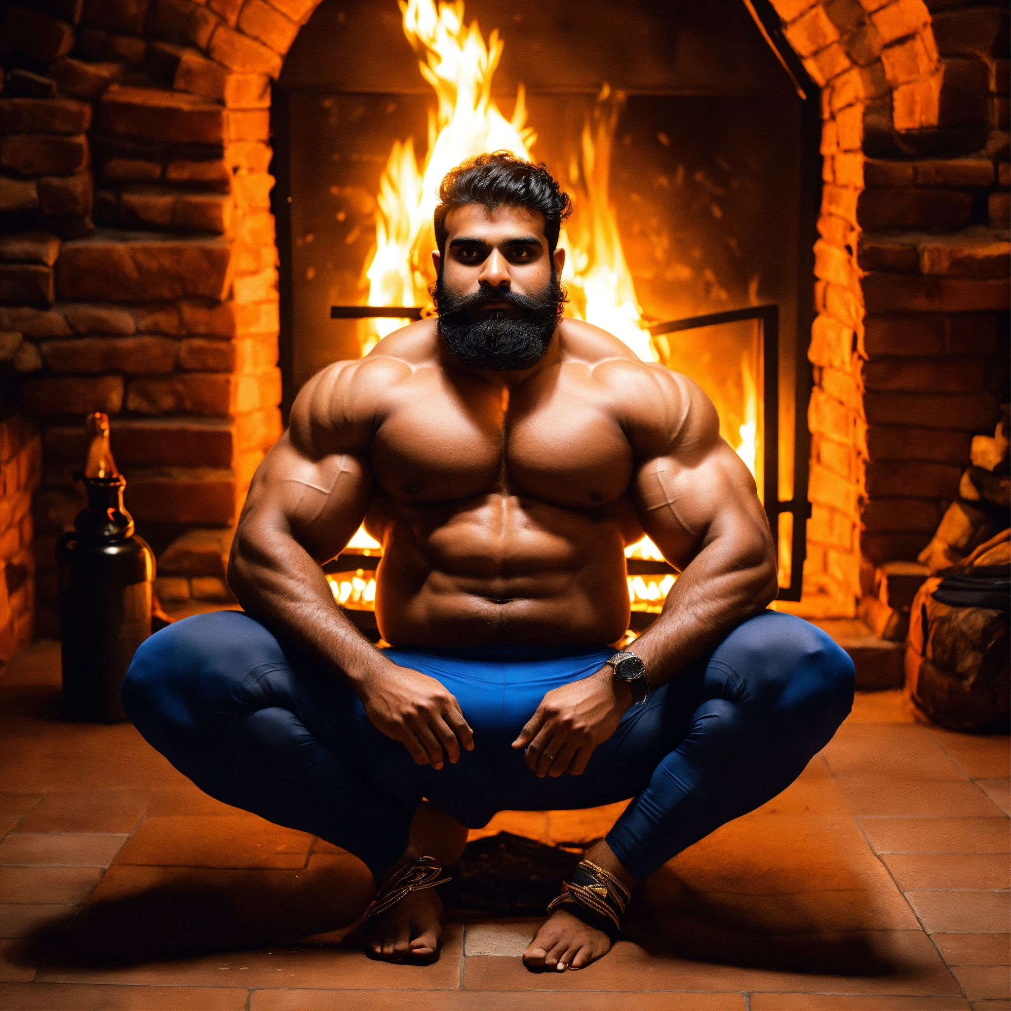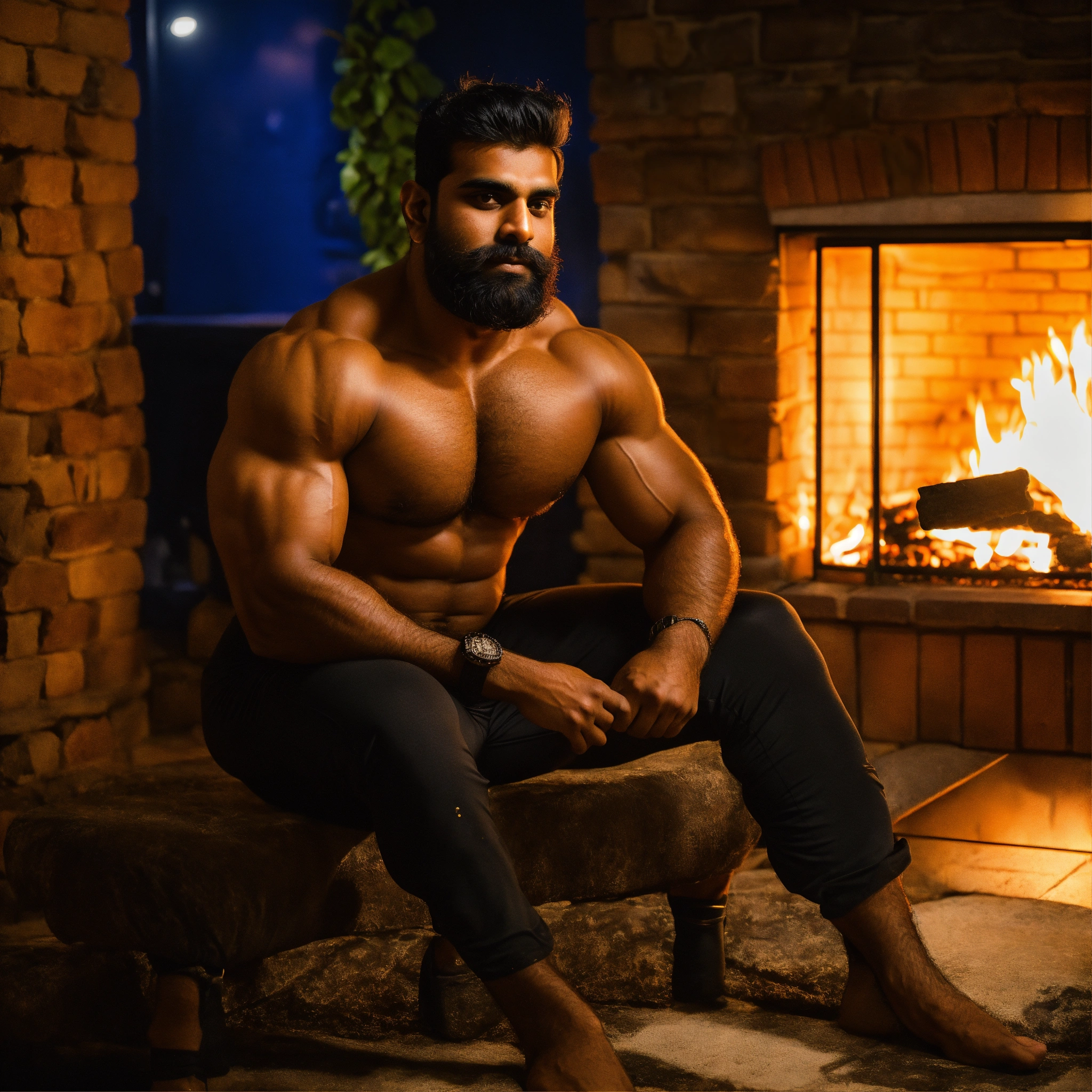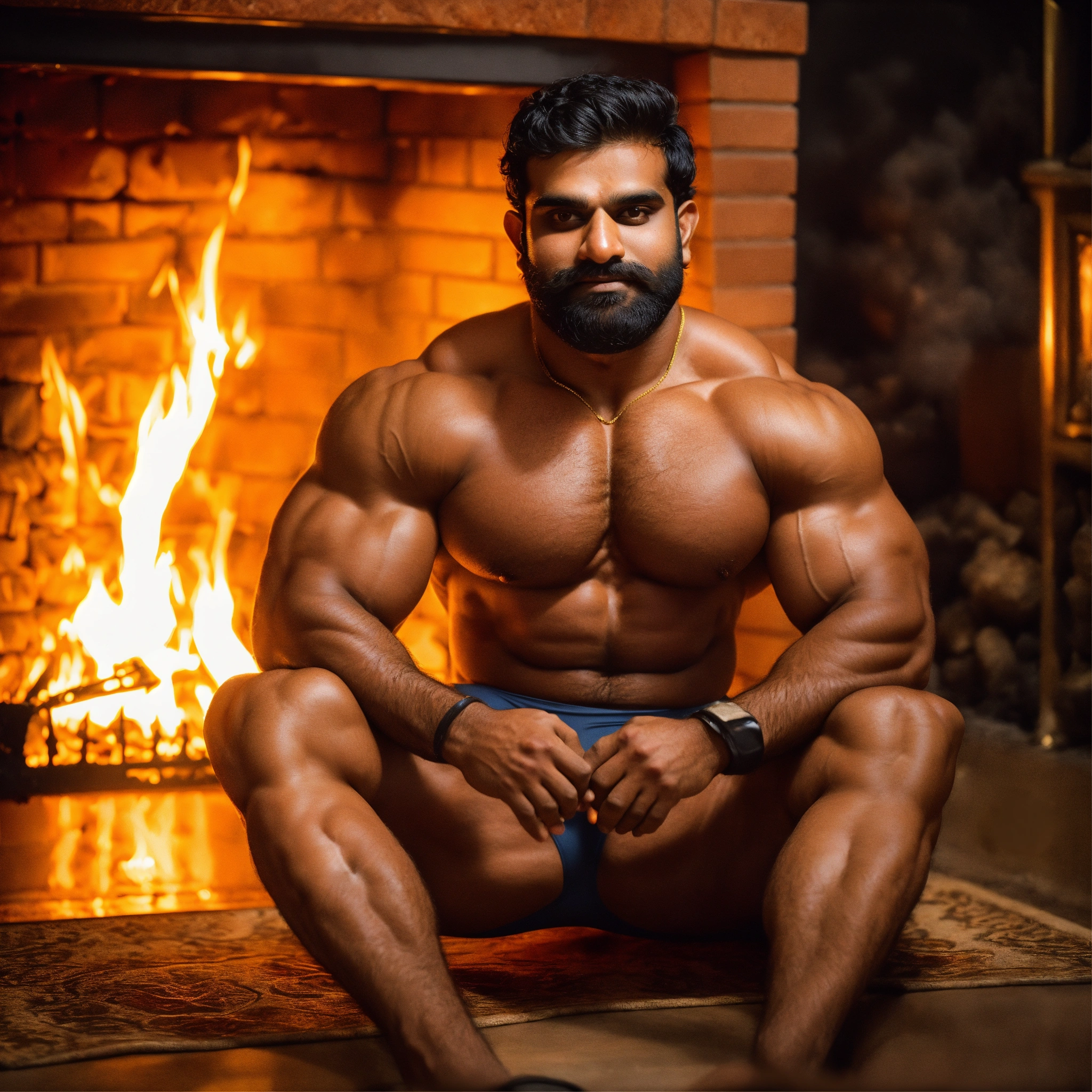 30-year-old hairy indian man with big muscles, big bodybuilder, body like a wrestler, sitting in front of a fireplace at midnight