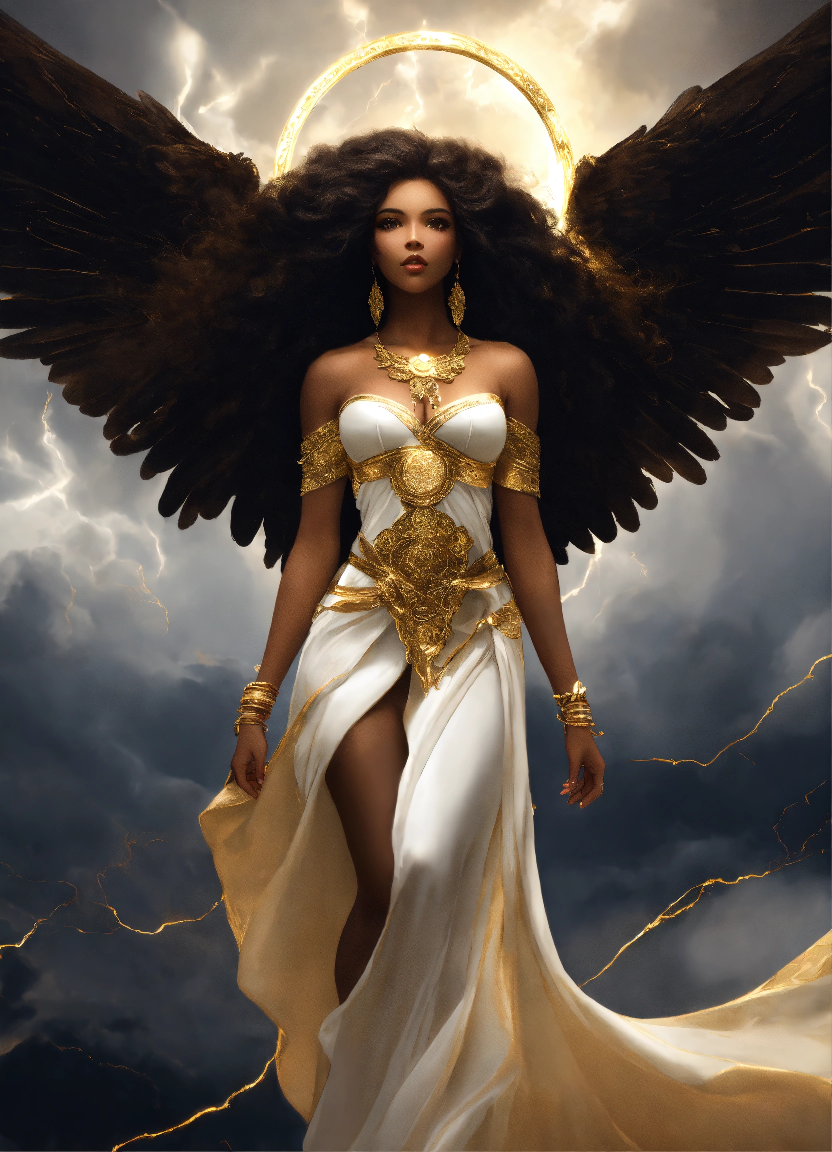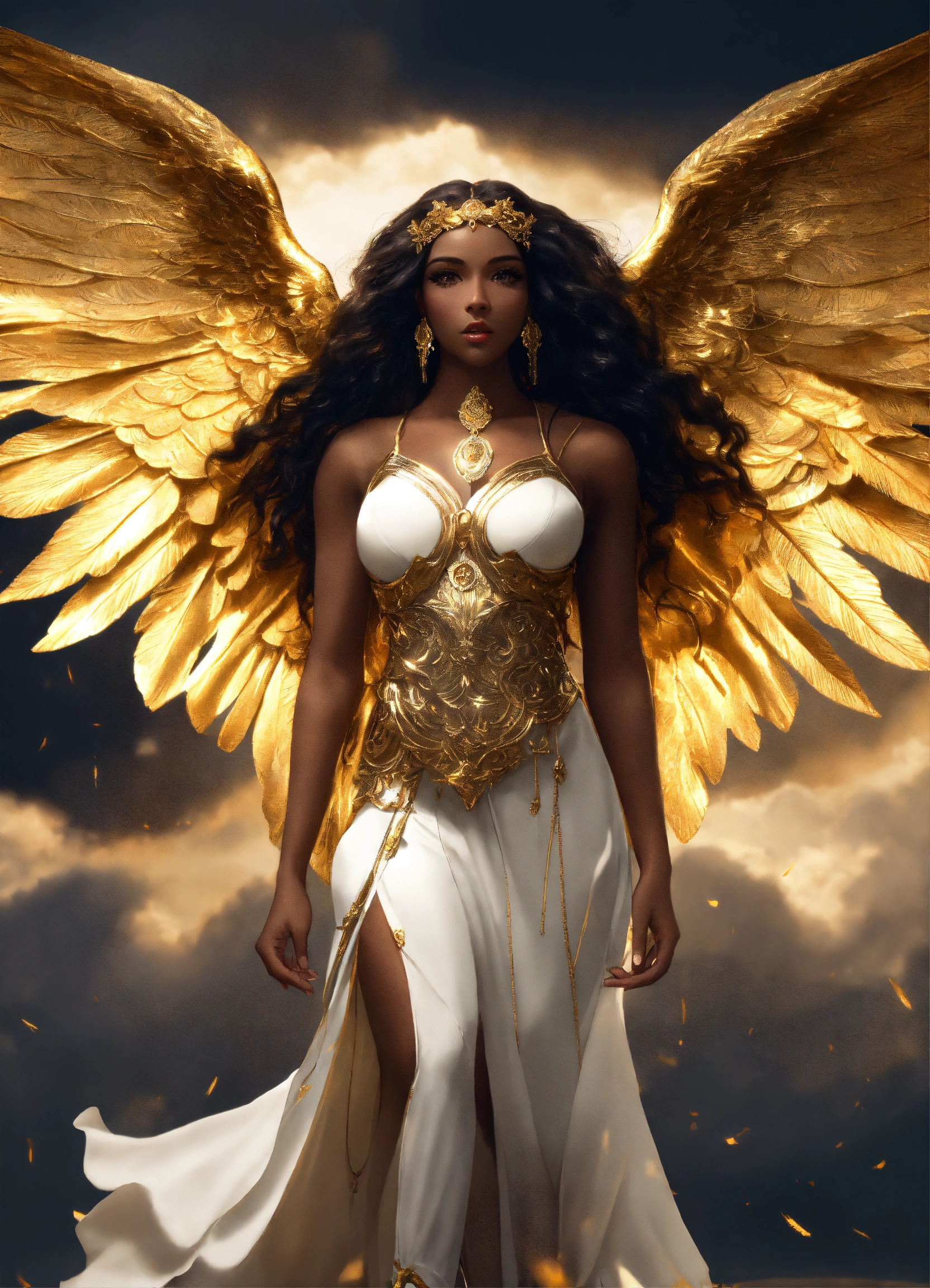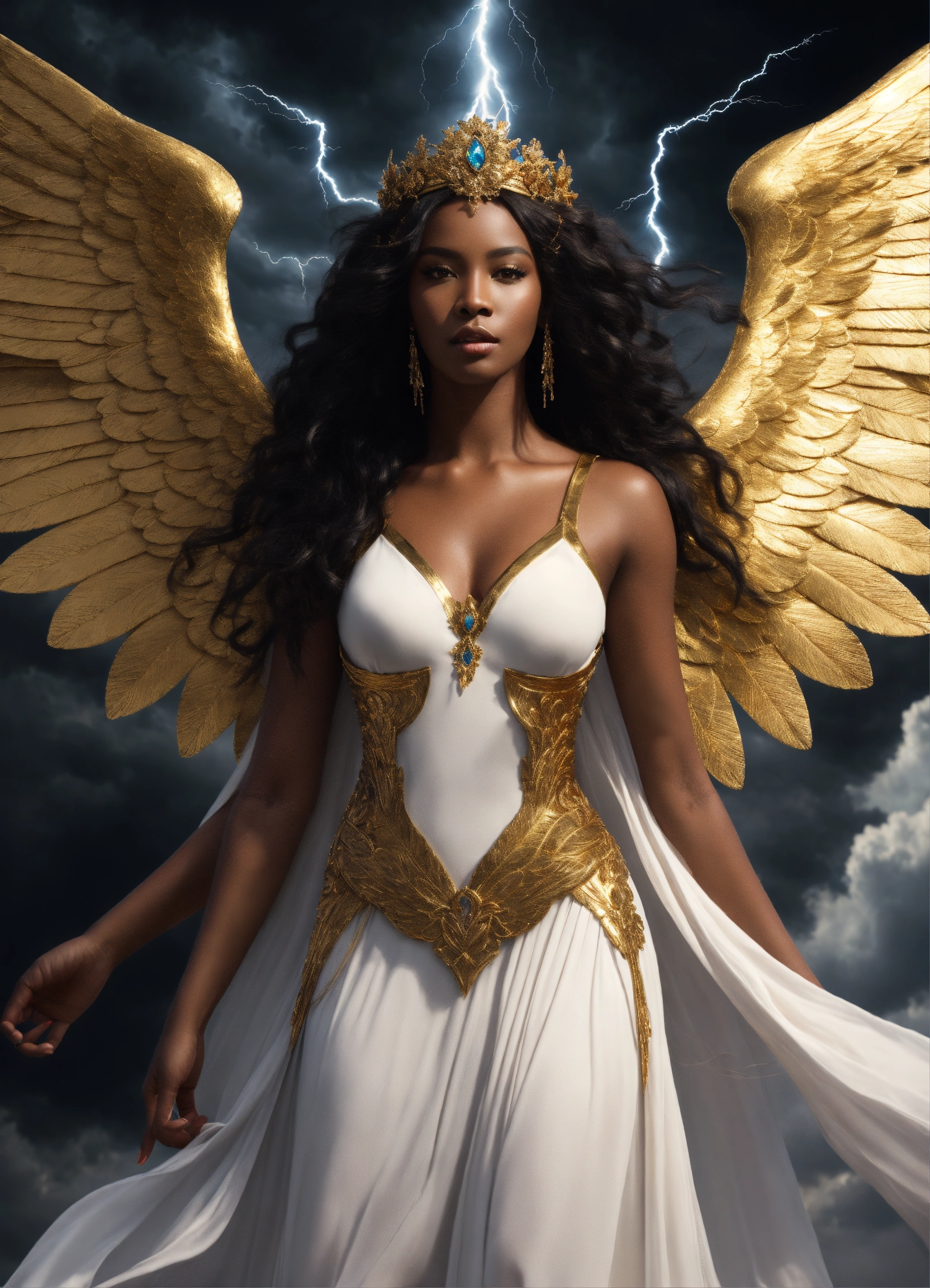 Full body beautiful black goddess angel with wings, beautiful black warrior angel woman with dark brown skin, beautiful perfect face, shapely hour-glass figure long flowing hair, fully clothed flowing white dress and gold accessories, she's floating in the sky with gold lightning dark clouds behind her, fantasy, high detail, realistic photo, high detail, digital painting, cinematic, stunning, hyper-realistic, sharp focus, high resolution 8k, insanely detailed