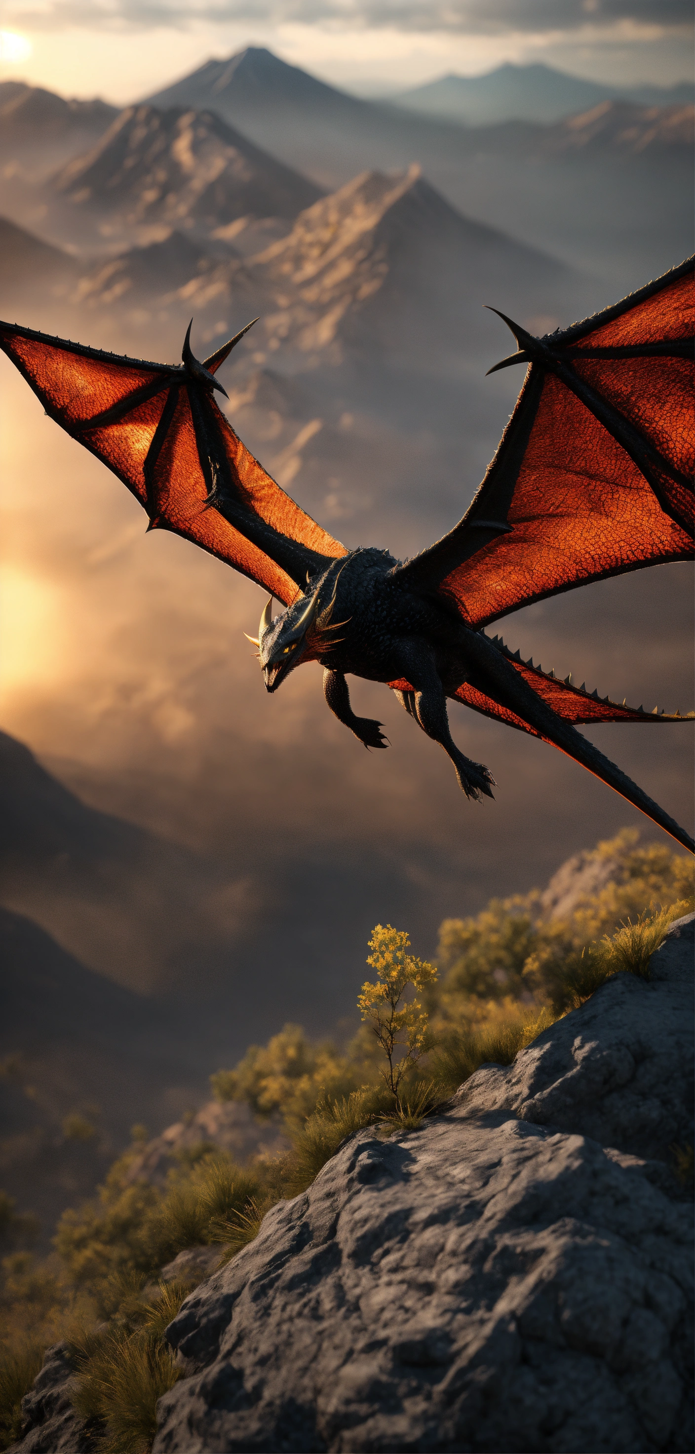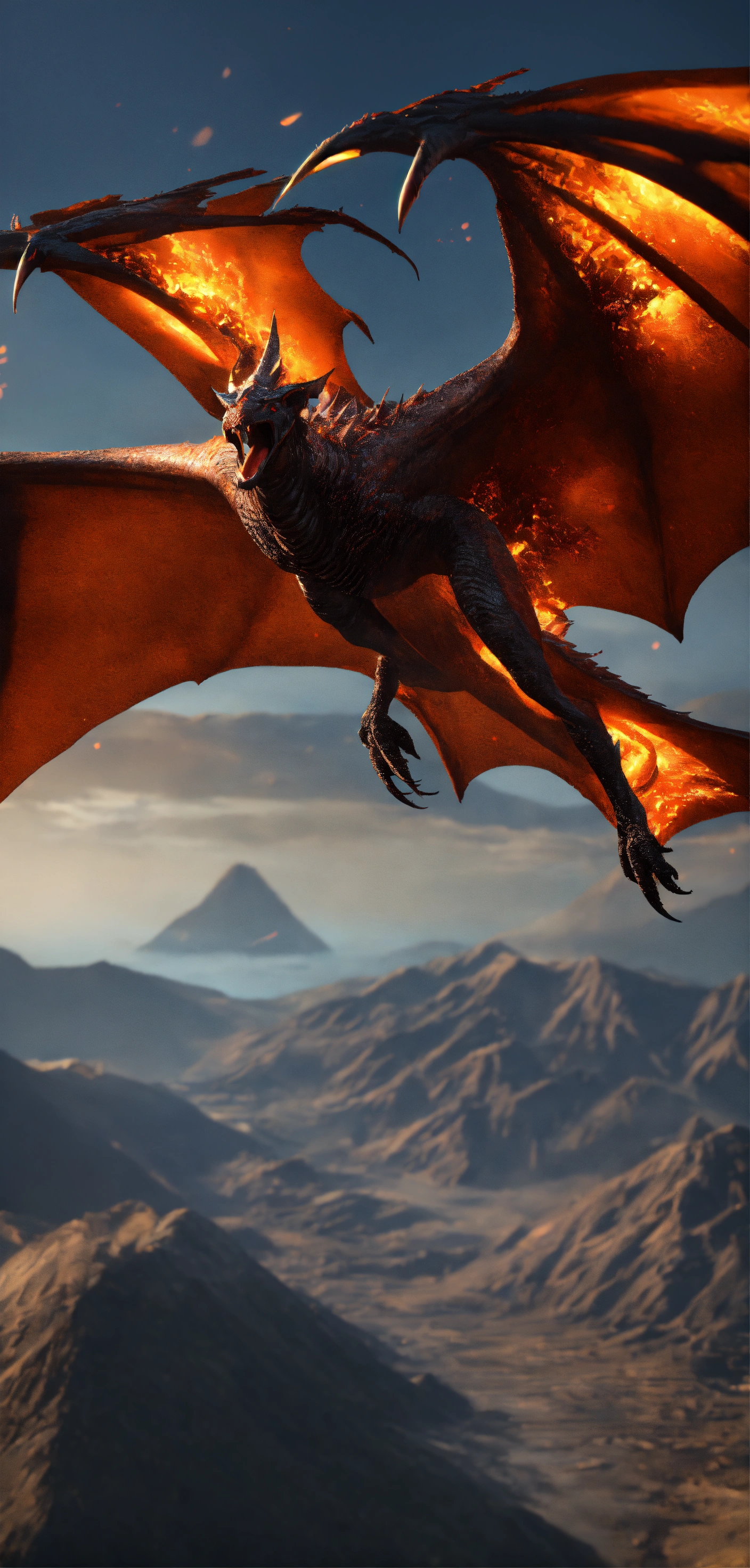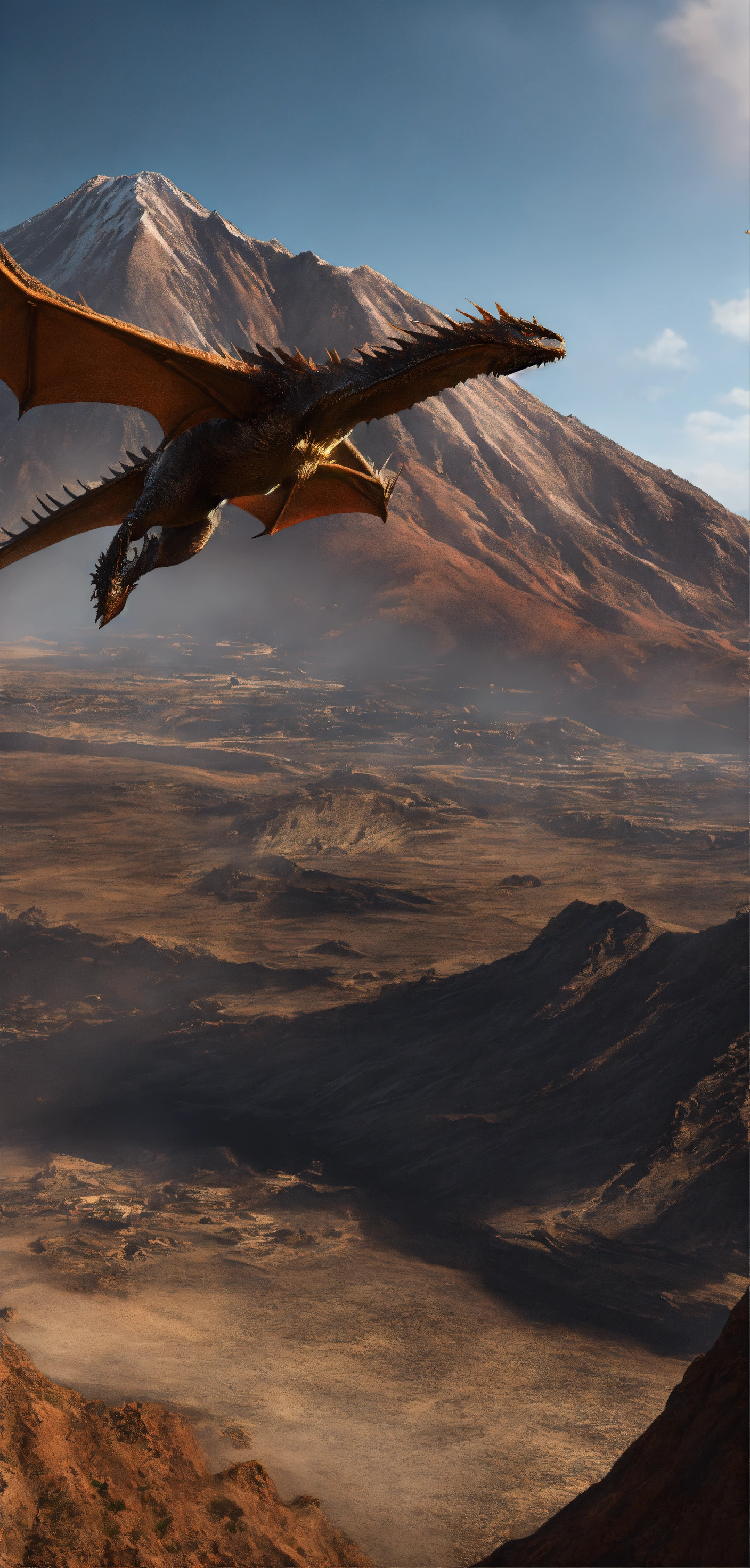 Wyvern flying above dormant vulcano, 8 k, ultra-realistic, view on back, smooth, sharp focus, cinematic composition, detailed face, detailed, detailed skin, highest detail quality, ultra-detailed, ultra-realistic, photography lighting, reflection mapping, movie quality rendering, octane rendering, sharp focus, depth of field, real shadow, vfx post-production, rtx ray tracing lighting