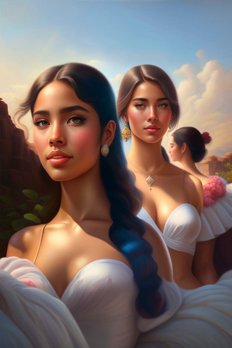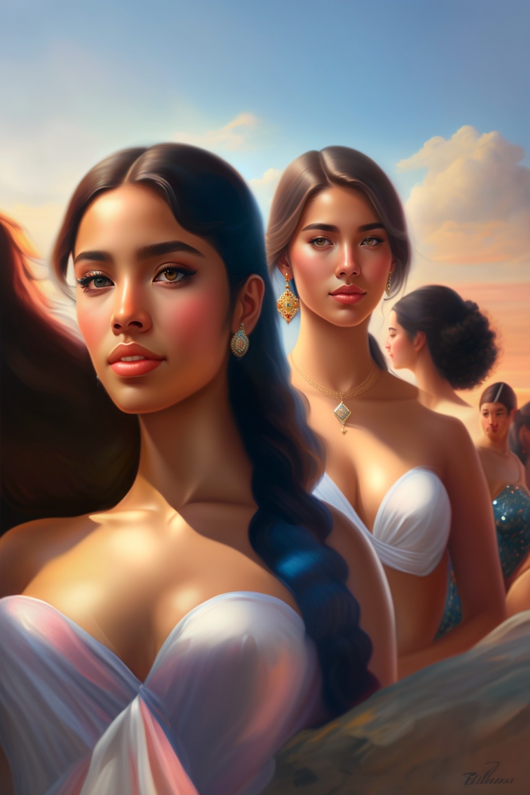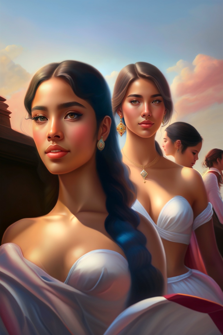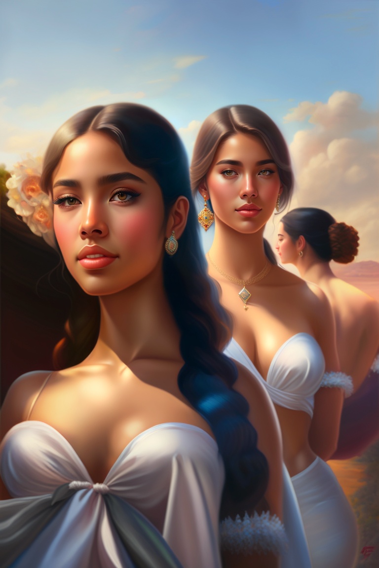 A group of four young half-naked mexican women, not a portrait, intrincated details, oil on canvas, masterpiece, trending on artstation, featured on pixiv, cinematic composition, dramatic pose, beautiful lighting, sharp, details, hyper-detailed, hd, hdr, 4k, 8k