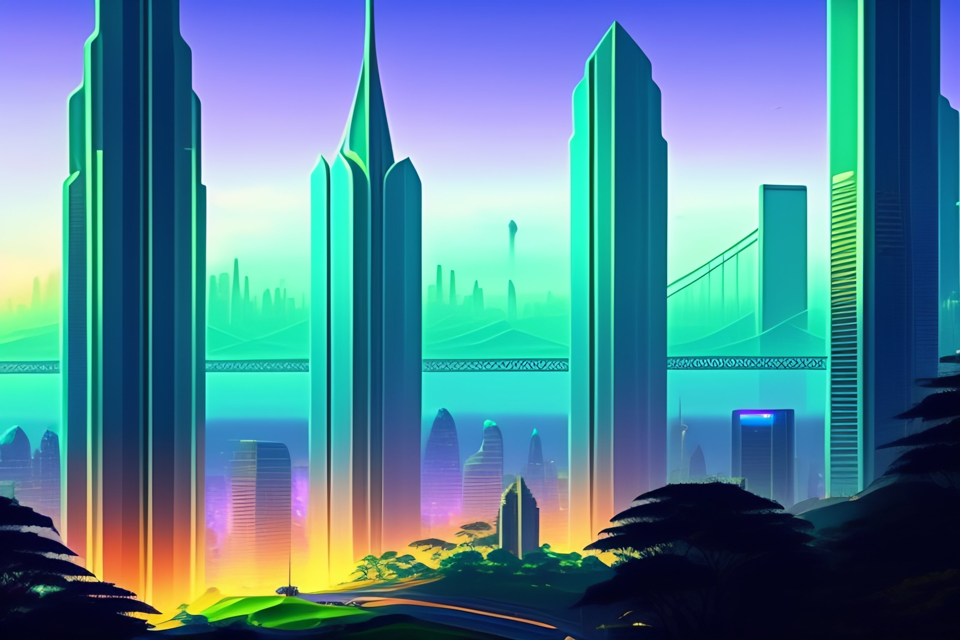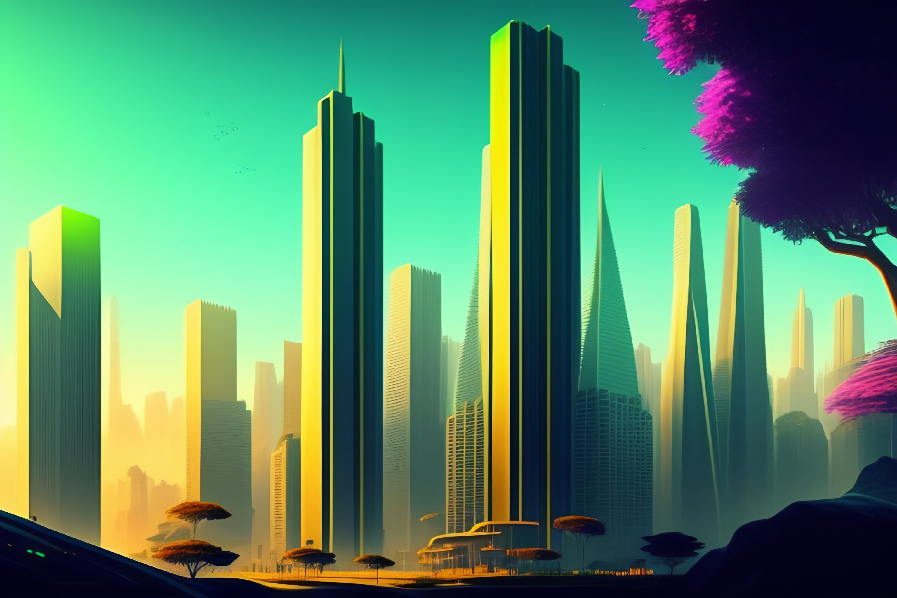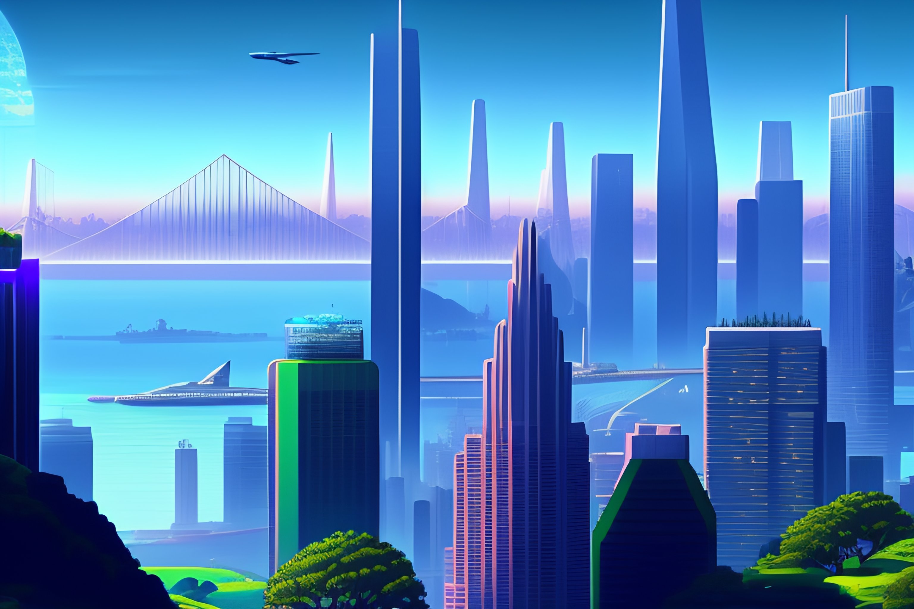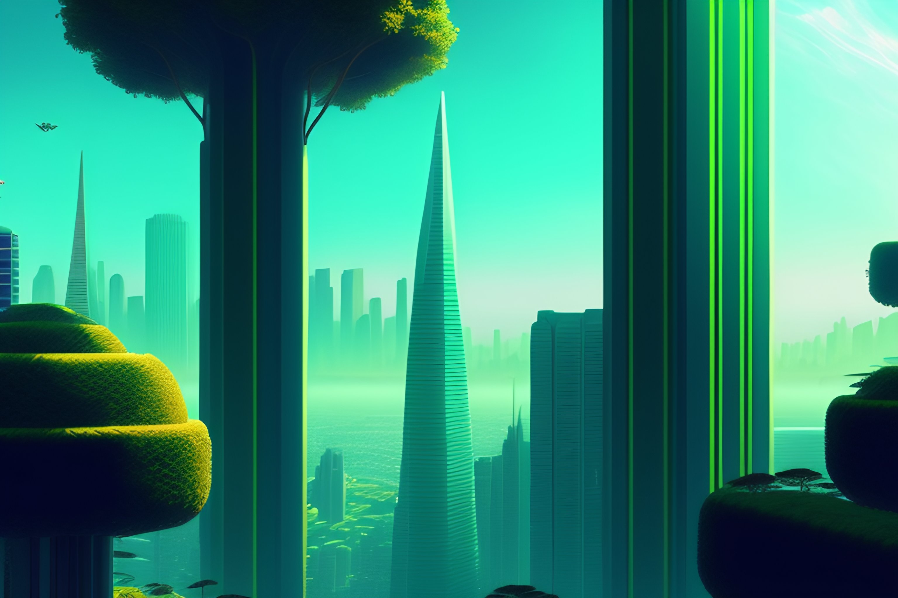 San francisco in 2050, green hues, lots of trees everywhere, skyscrapers, retrofuturism, synthwave, cityscape, 2 d game art