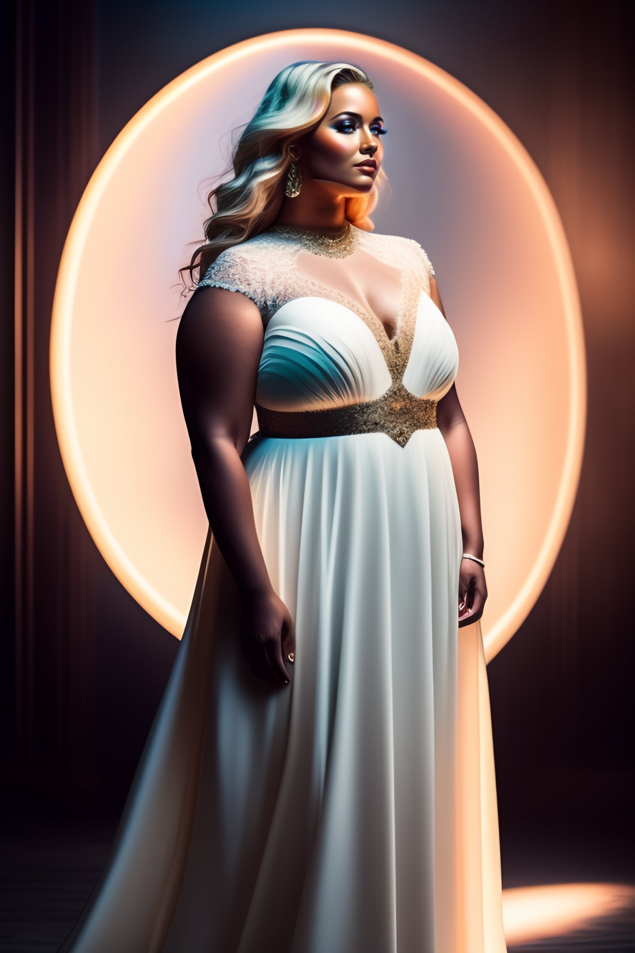 Full body plus size blonde goddess stands proud and strong amidst rays of gentle iridescent light in a billowing gown