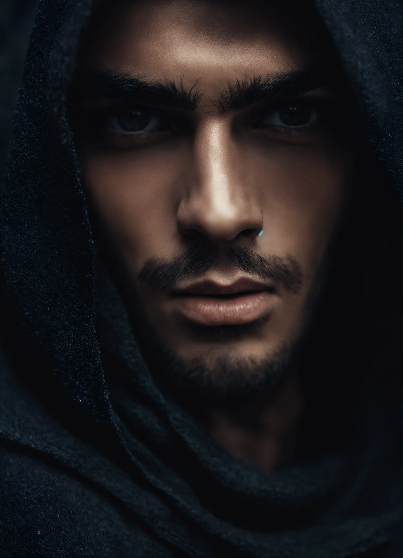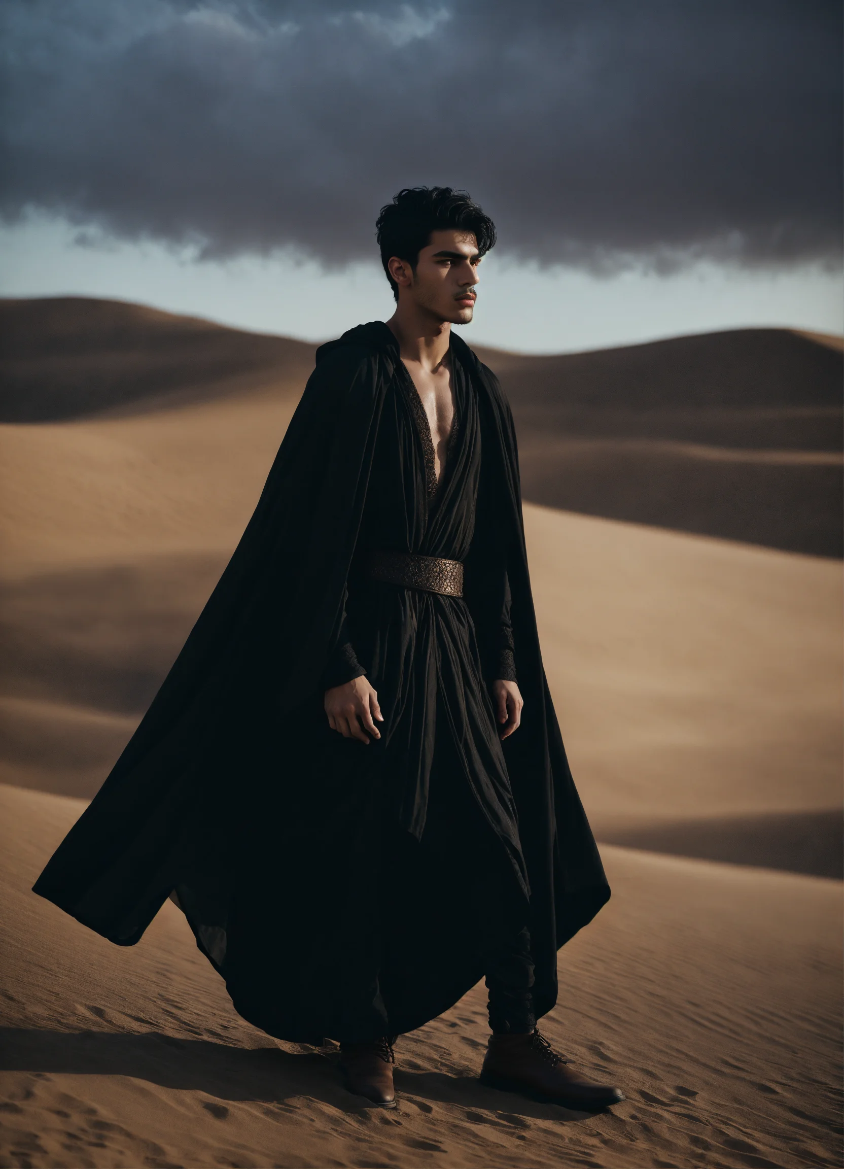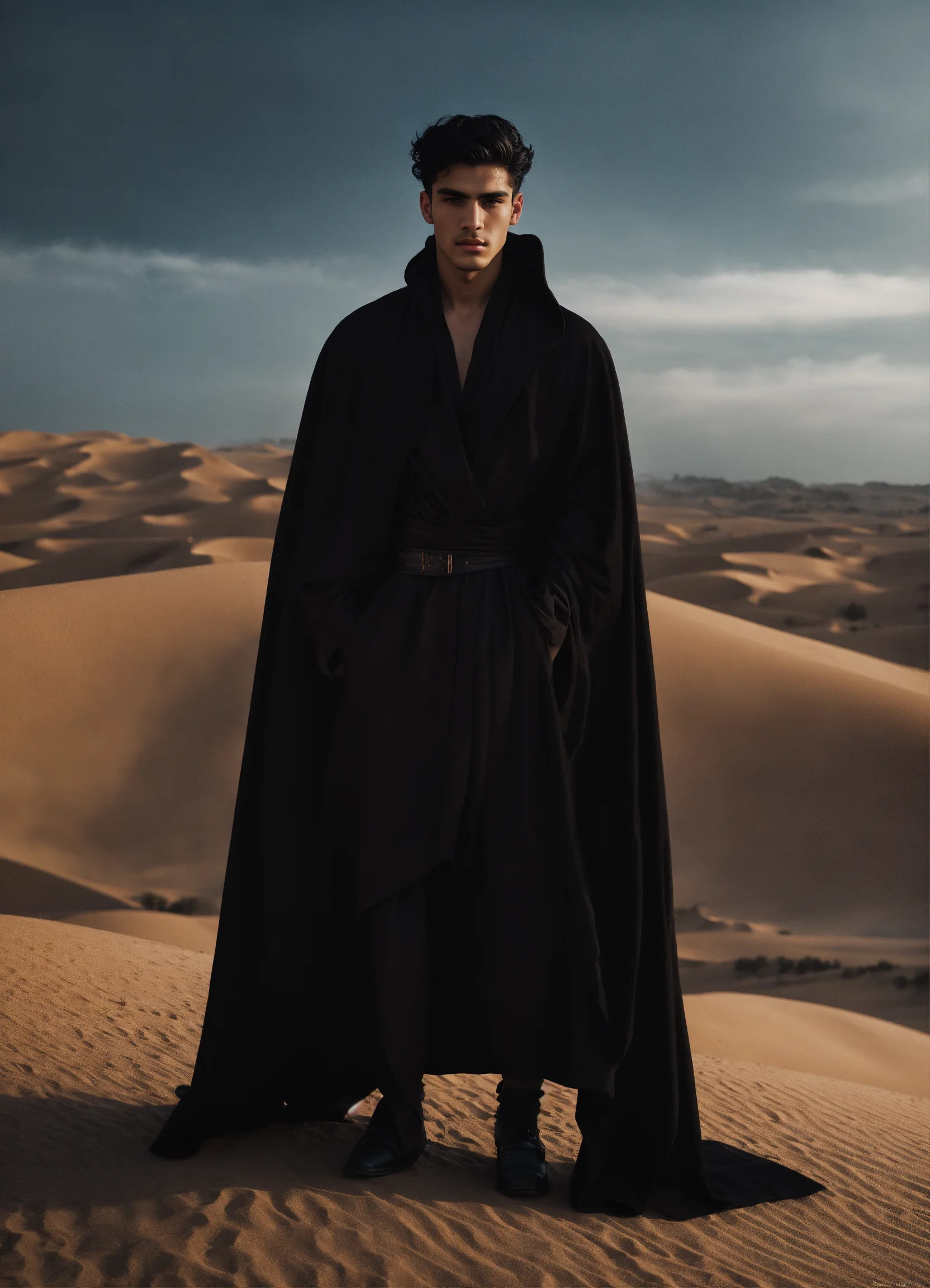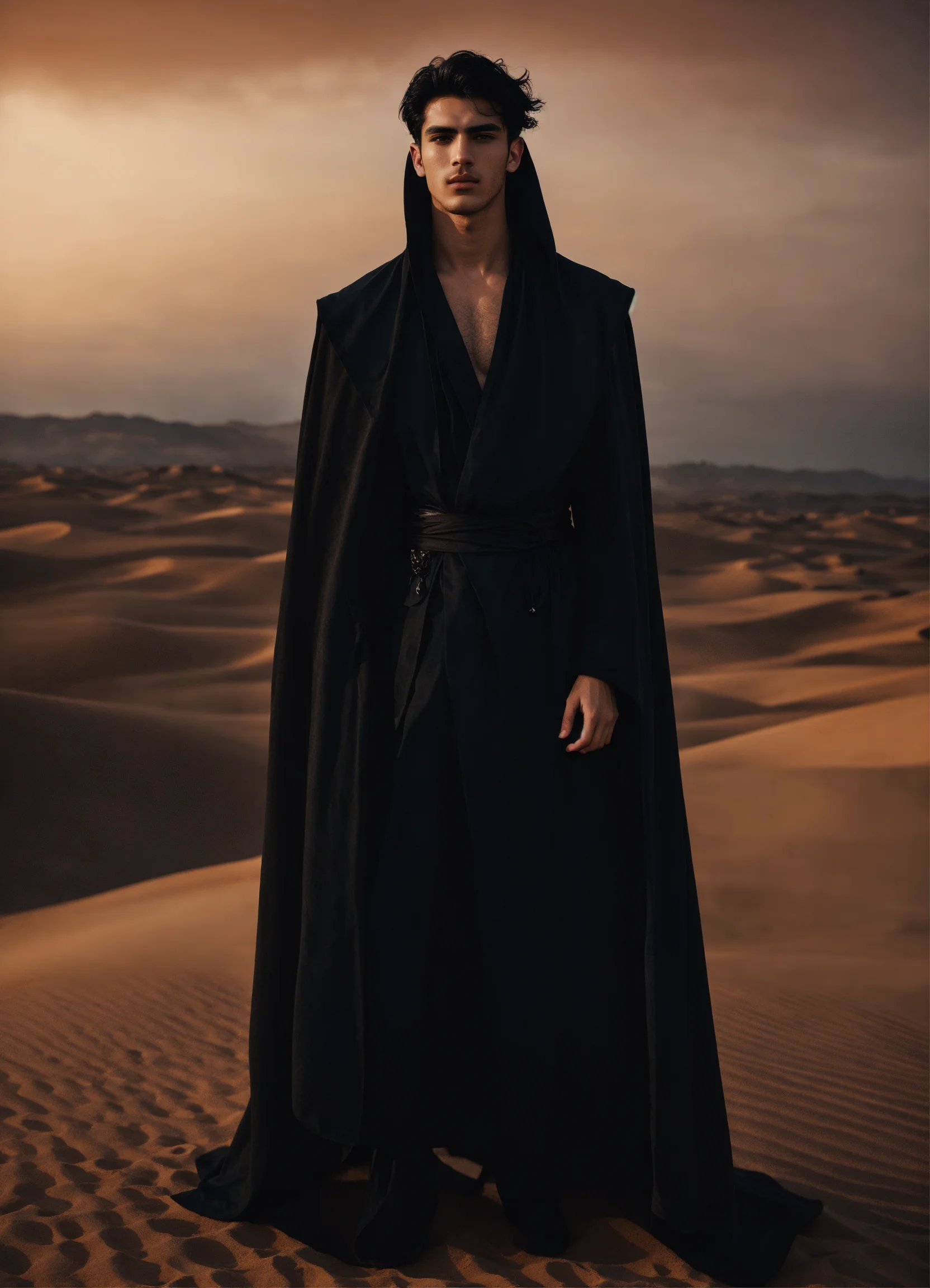 Close-up fantasy-inspired portrait of haute couture hauntingly handsome 19 year old persian male fashion model looking directly into camera, warm brown eyes, roguish black hair, wearing black assassin robes and billowing black cape, background is desert at night, ethereal dreamy foggy, photoshoot by alessio albi, editorial fashion magazine photoshoot, fashion poses, . kinfolk magazine. film grain.