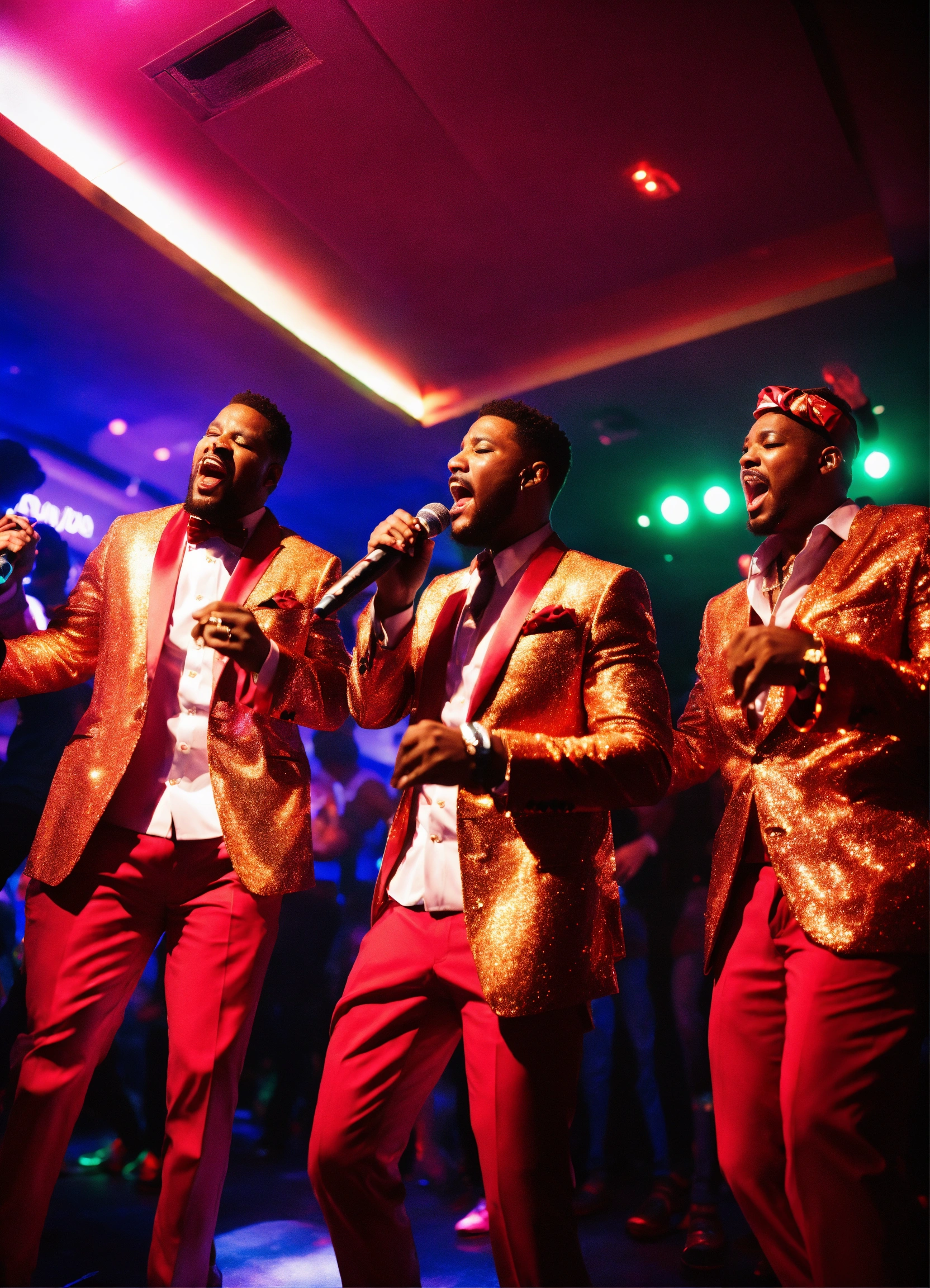 A low angle shot of cape verdeans dressing in nightclub attire singing and dancing inside a las vegas styles night club