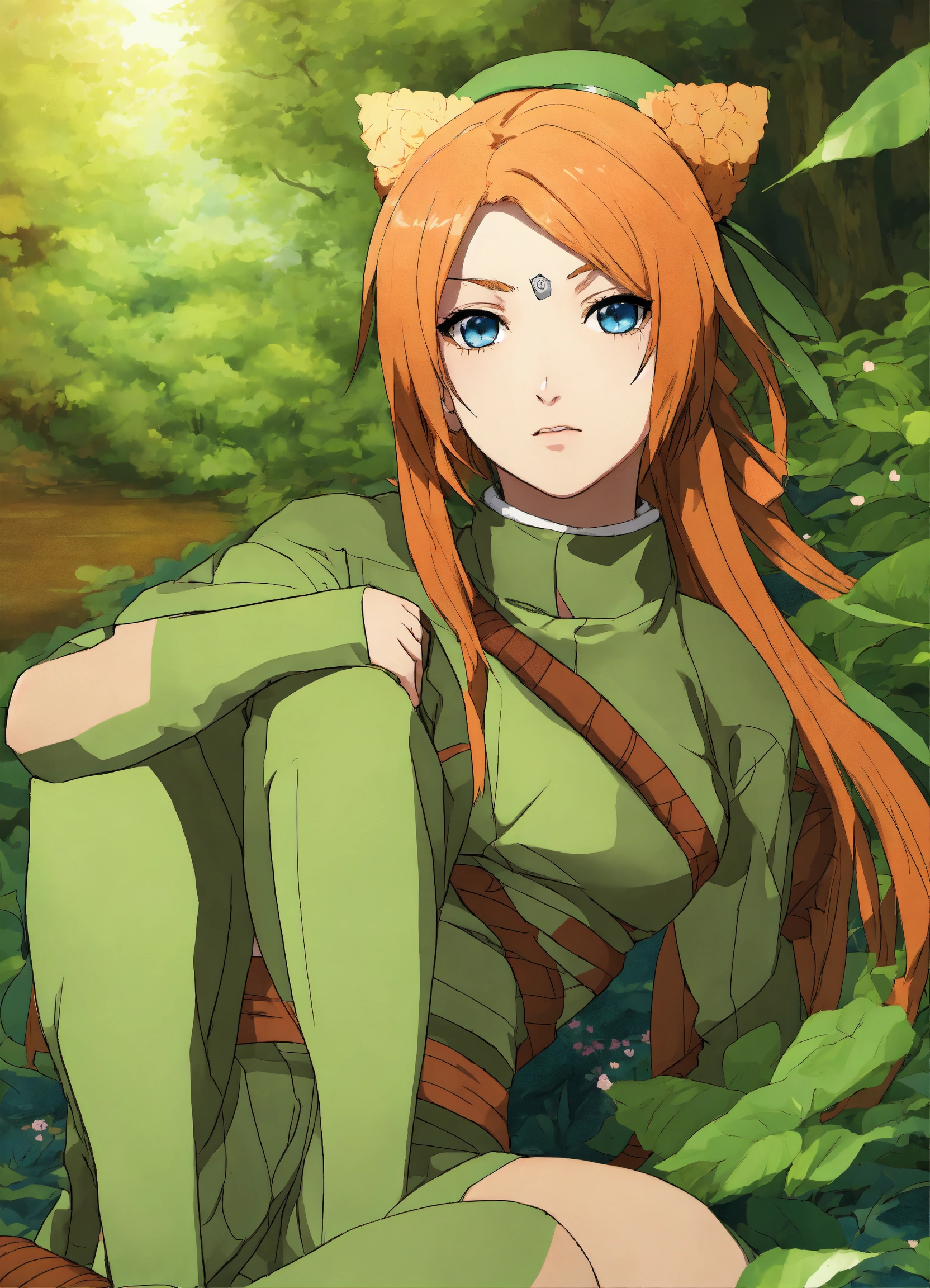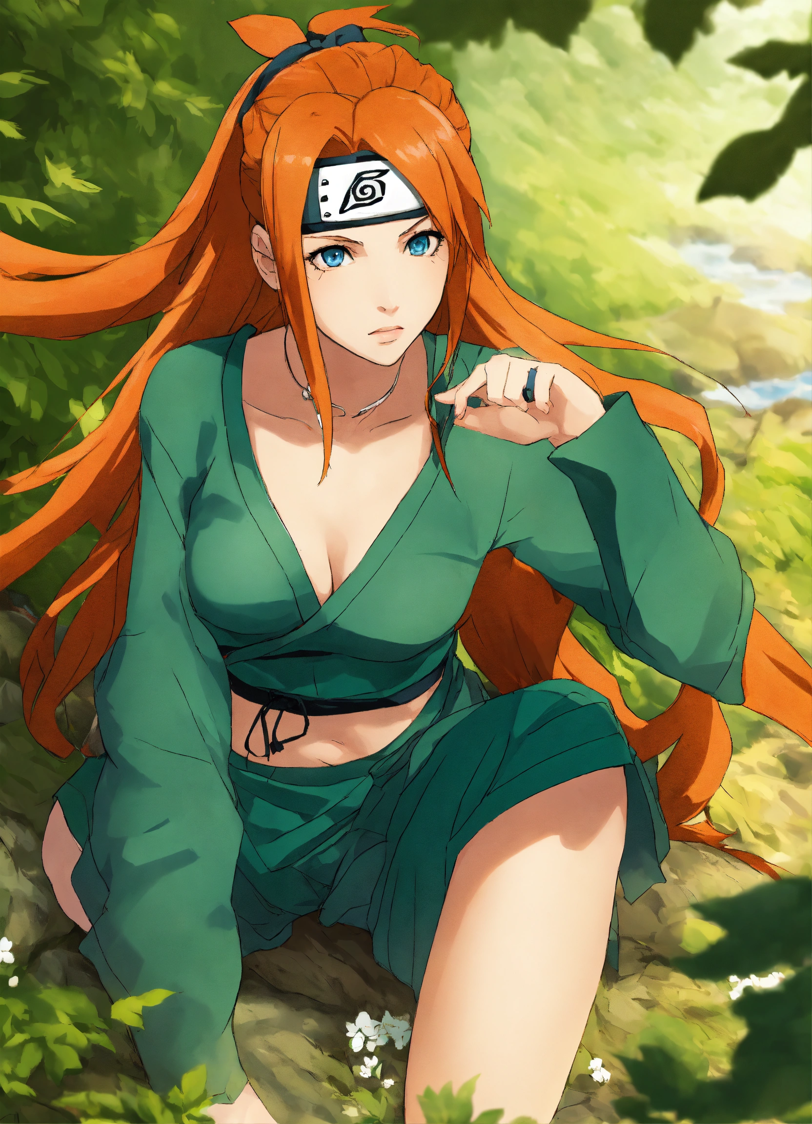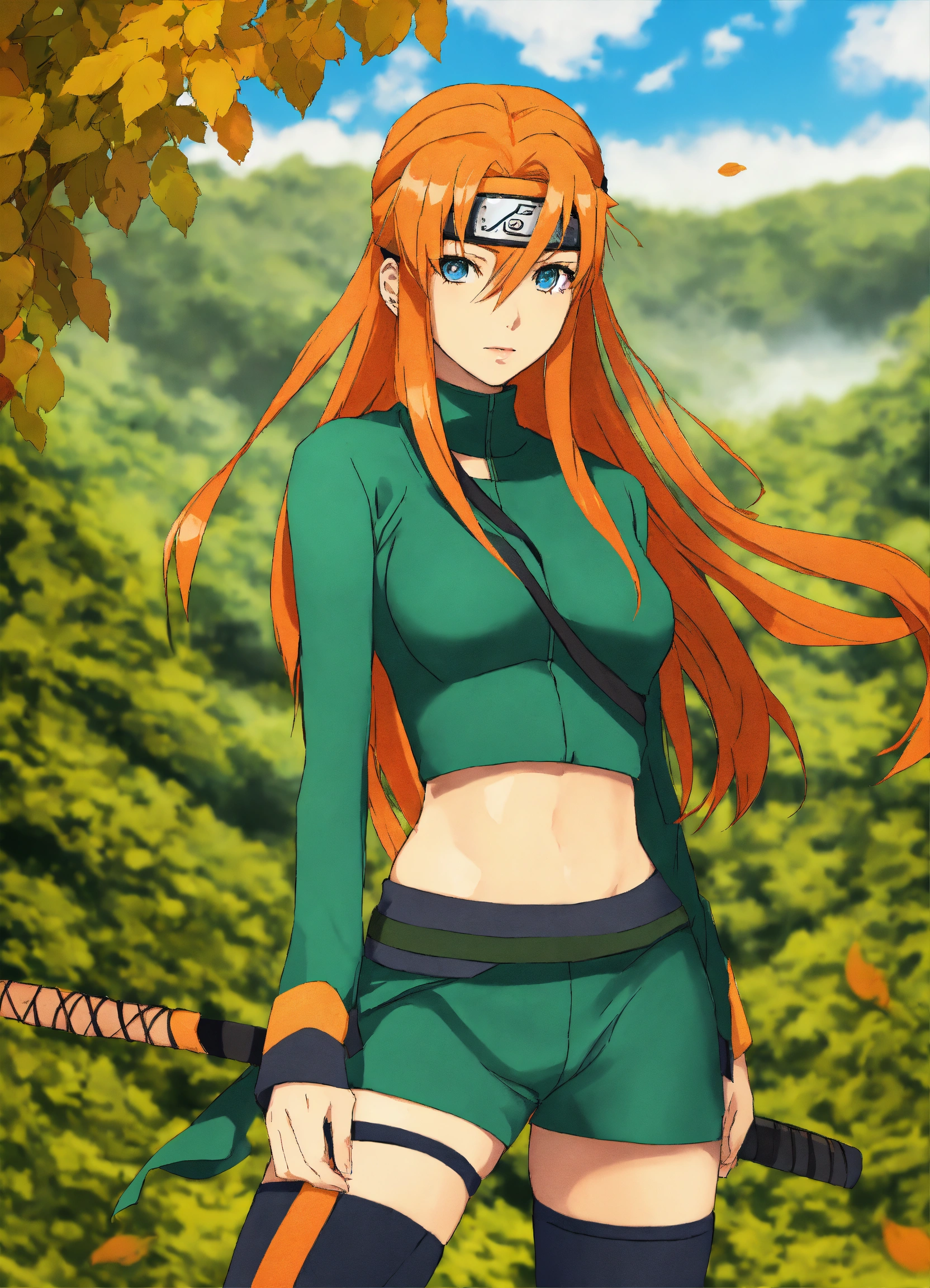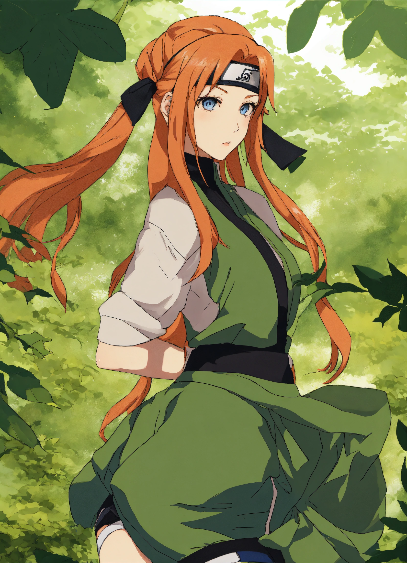 Naruto-style art, masashi kishimoto art, anime, naruto manga, naruto anime, original character, ginger hair, blue eyes, pretty woman, kunoichi, shinobi, konoha, ginger long hair, ginger hair, blue eyes, beautiful girl, beautiful young woman in naruto style art, feminine, fishnets, village hidden in the leaves headband, fishnets, green kunoichi attire, feminine kunoichi attire, naruto headband, fishnets tights on legs, flattering kunoichi fishnets with green outfit, long hair down and flowing, full body, older woman, jonin, jonin kunoichi, stylish outfit