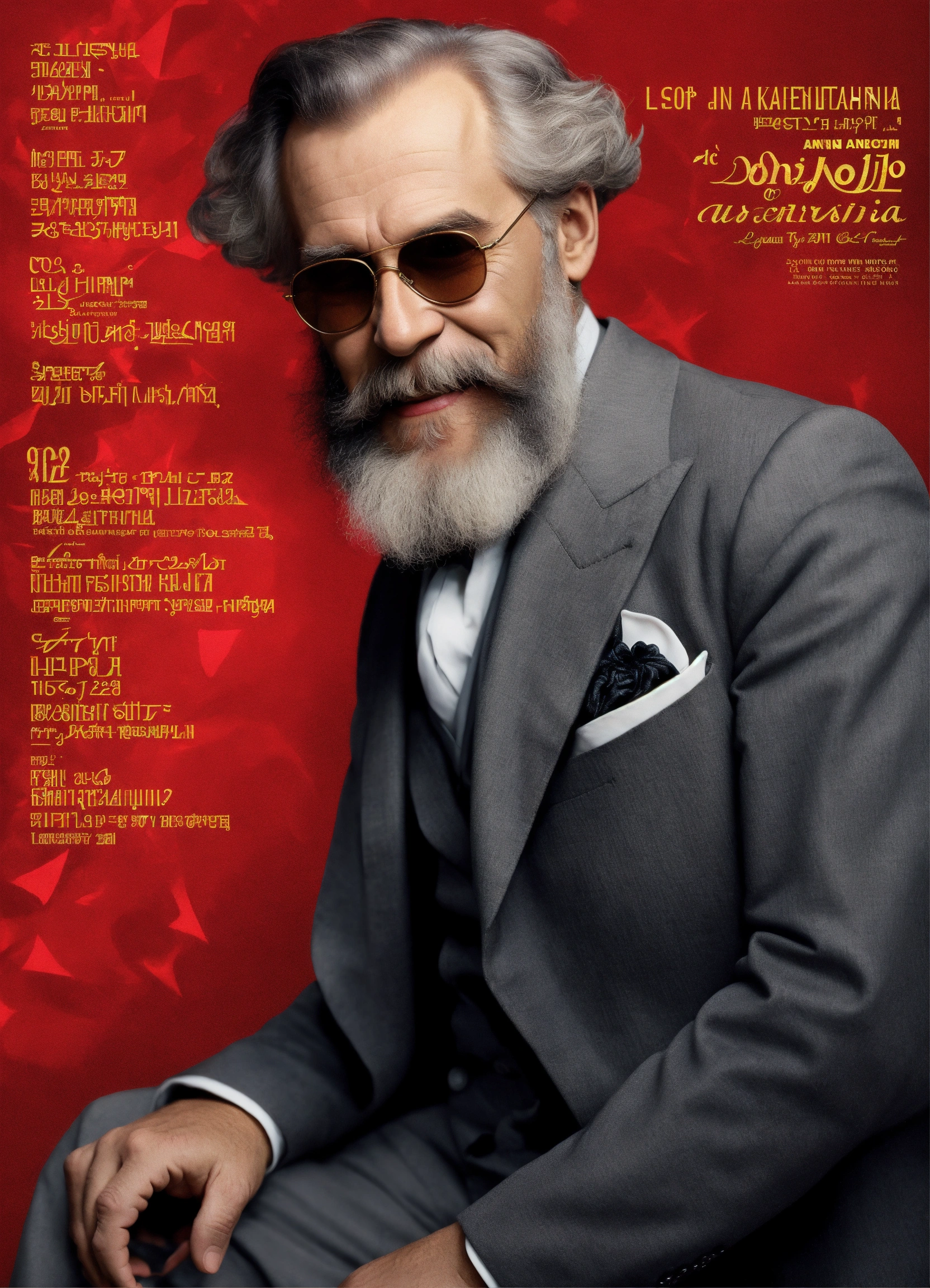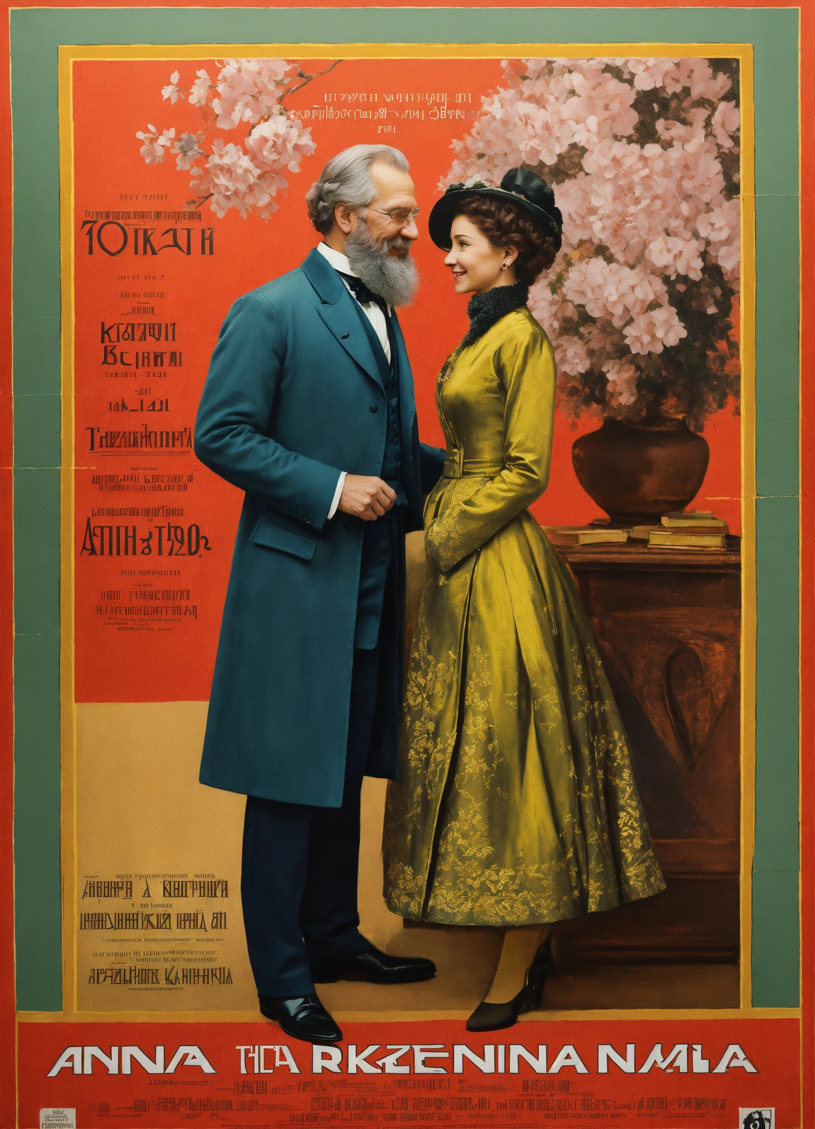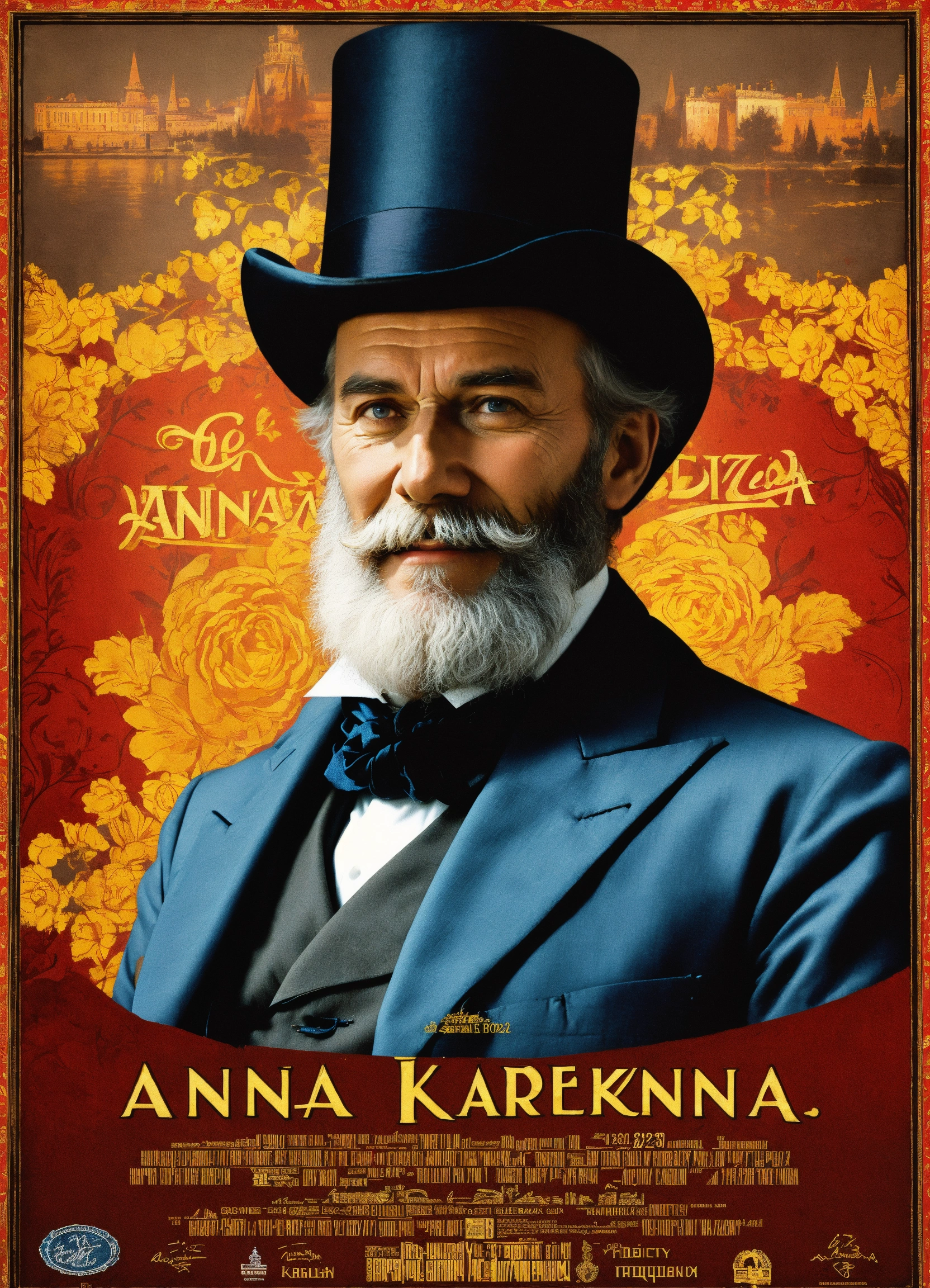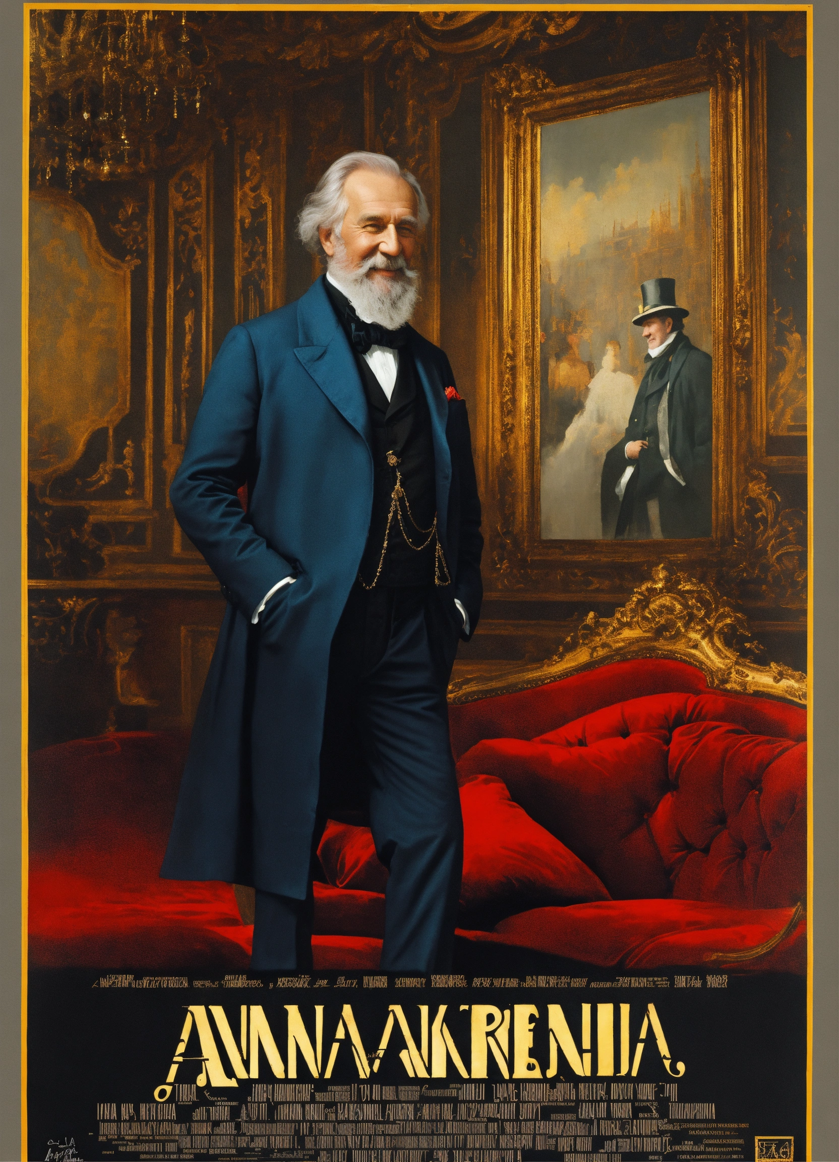 Advertising a very beautiful poster of the film "anna karenina", a very beautiful bright and color advertising photo in full growth of the smiling great russian writer leo tolstoy with a gray beard in the style of a fashionable expensive modern suit in the fashion of the sample of 2023, at the bottom is the signature in large letters "anna karenina" the background is gray, style - pop art