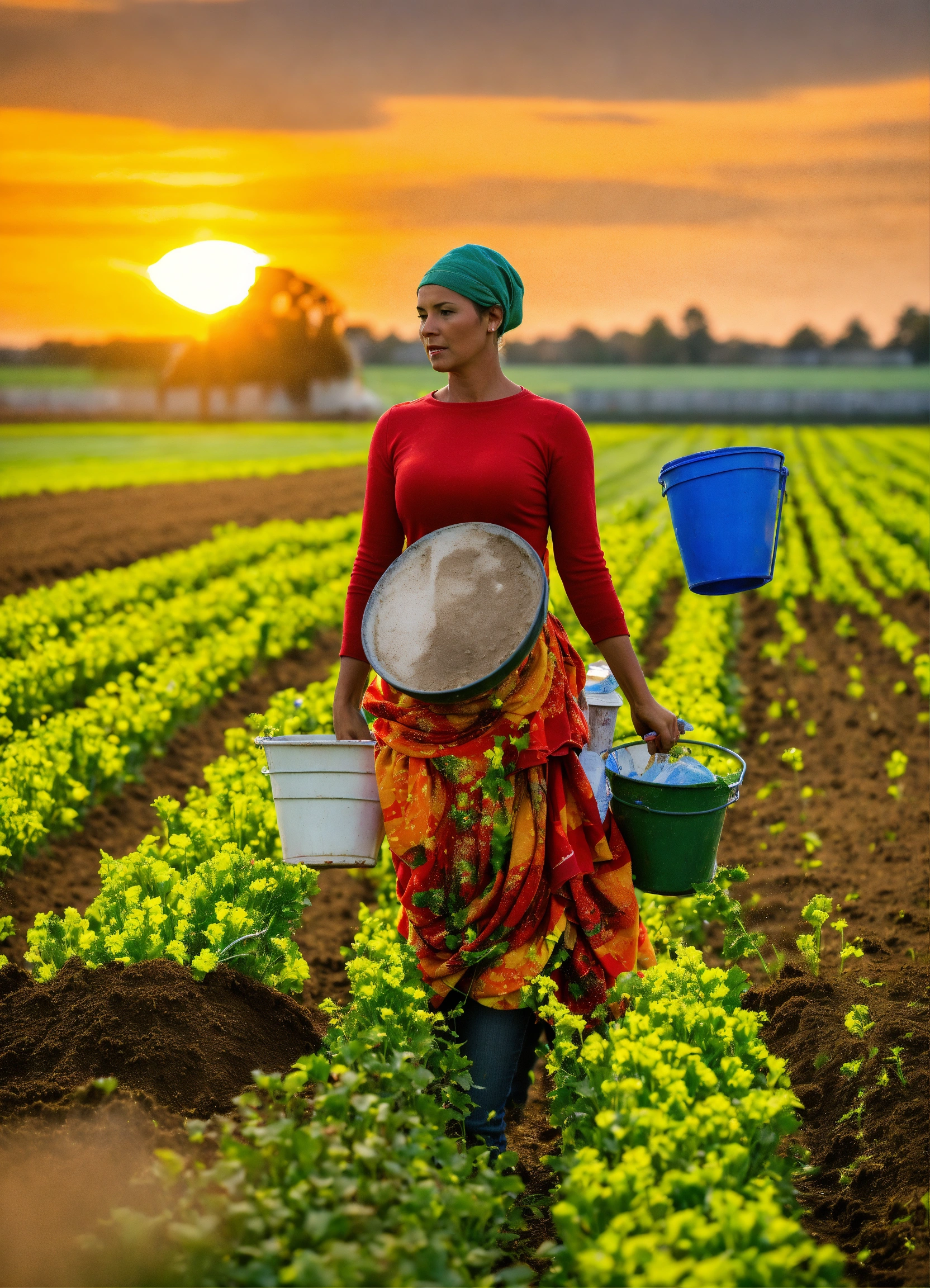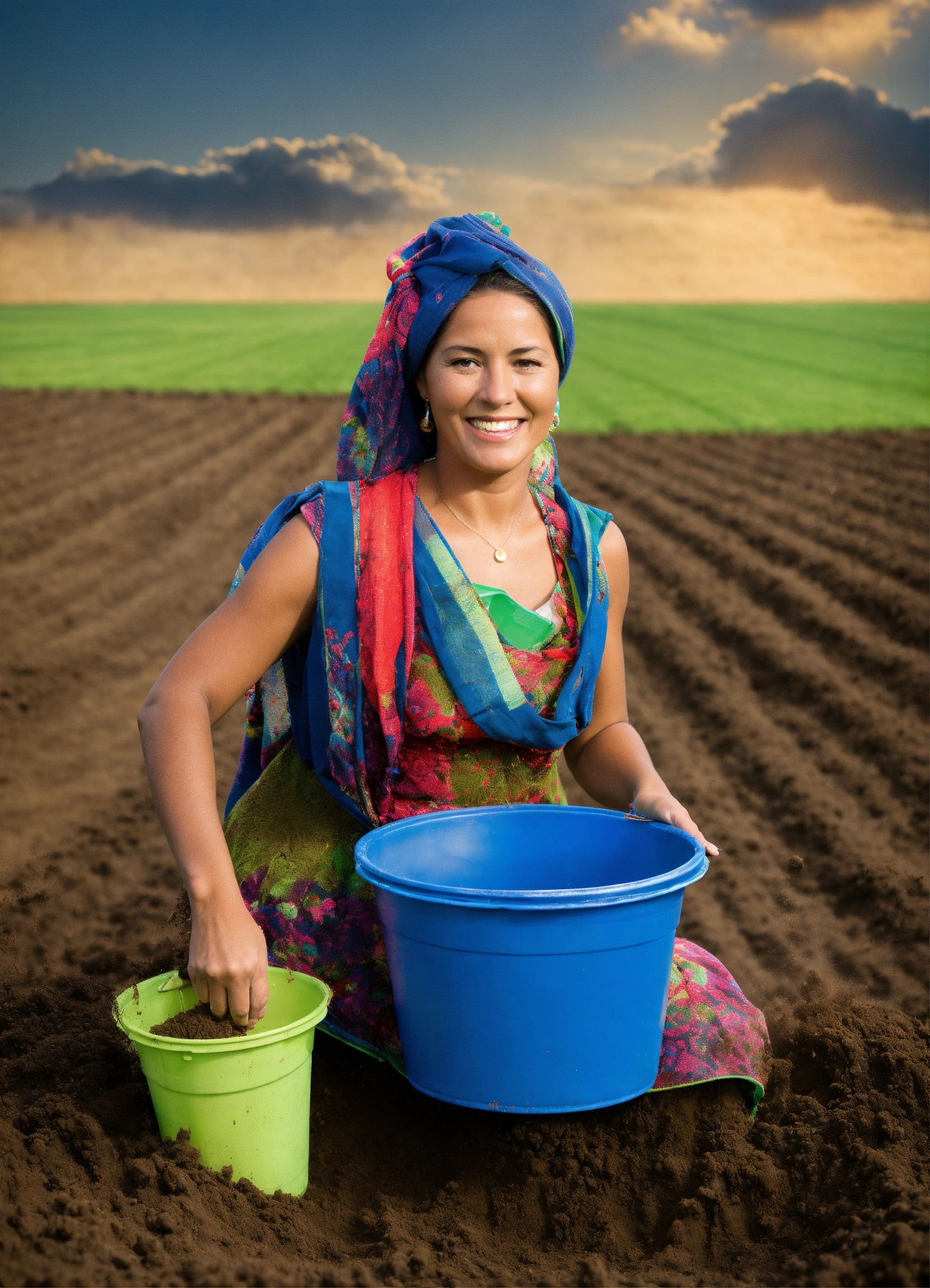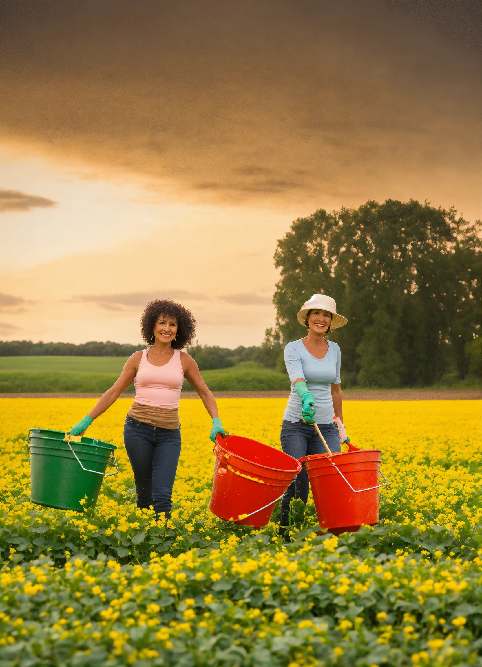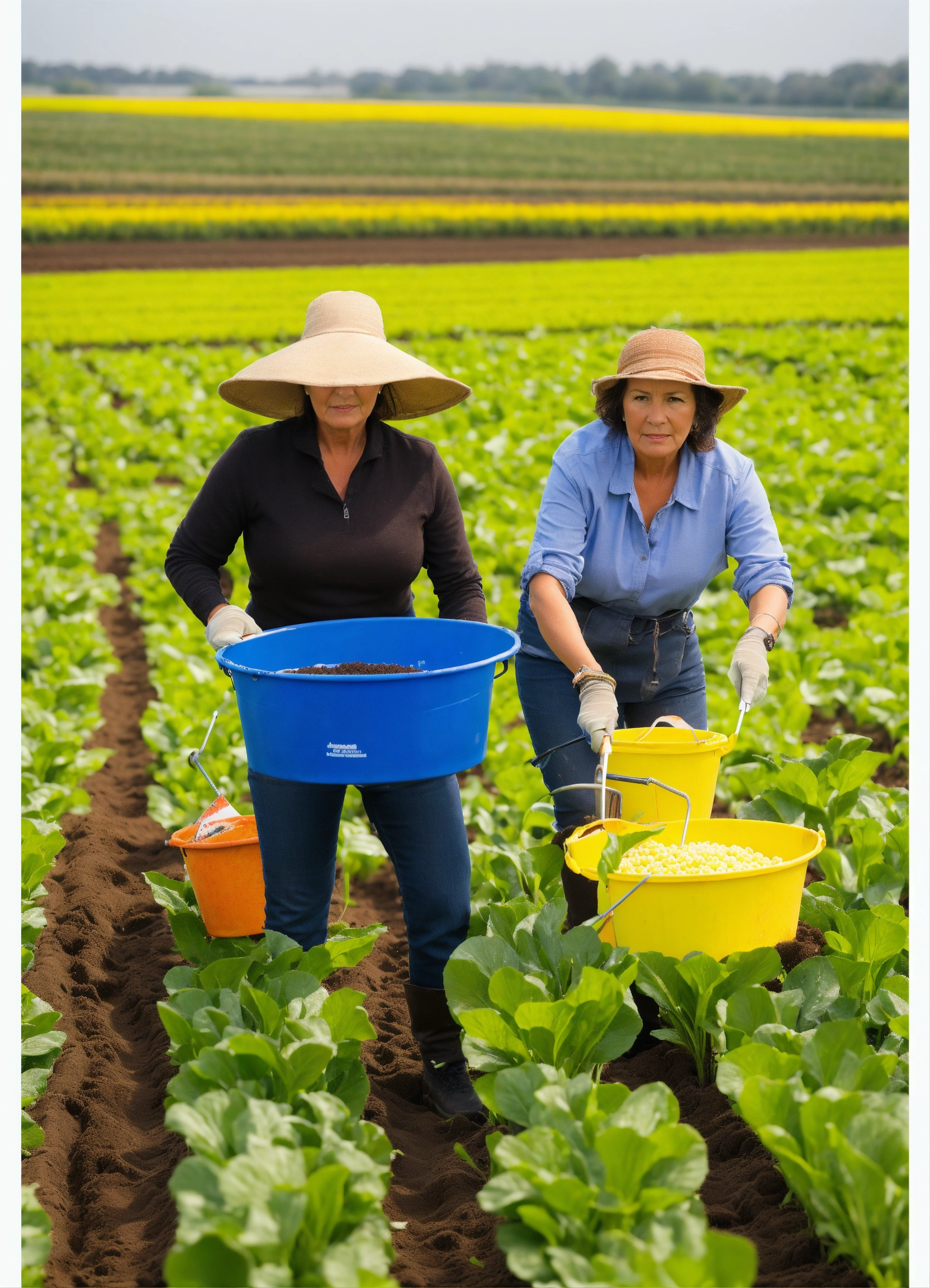 Many womans of 25 years of a different ethnicity spreader over the field with a small buckets of fertilizers