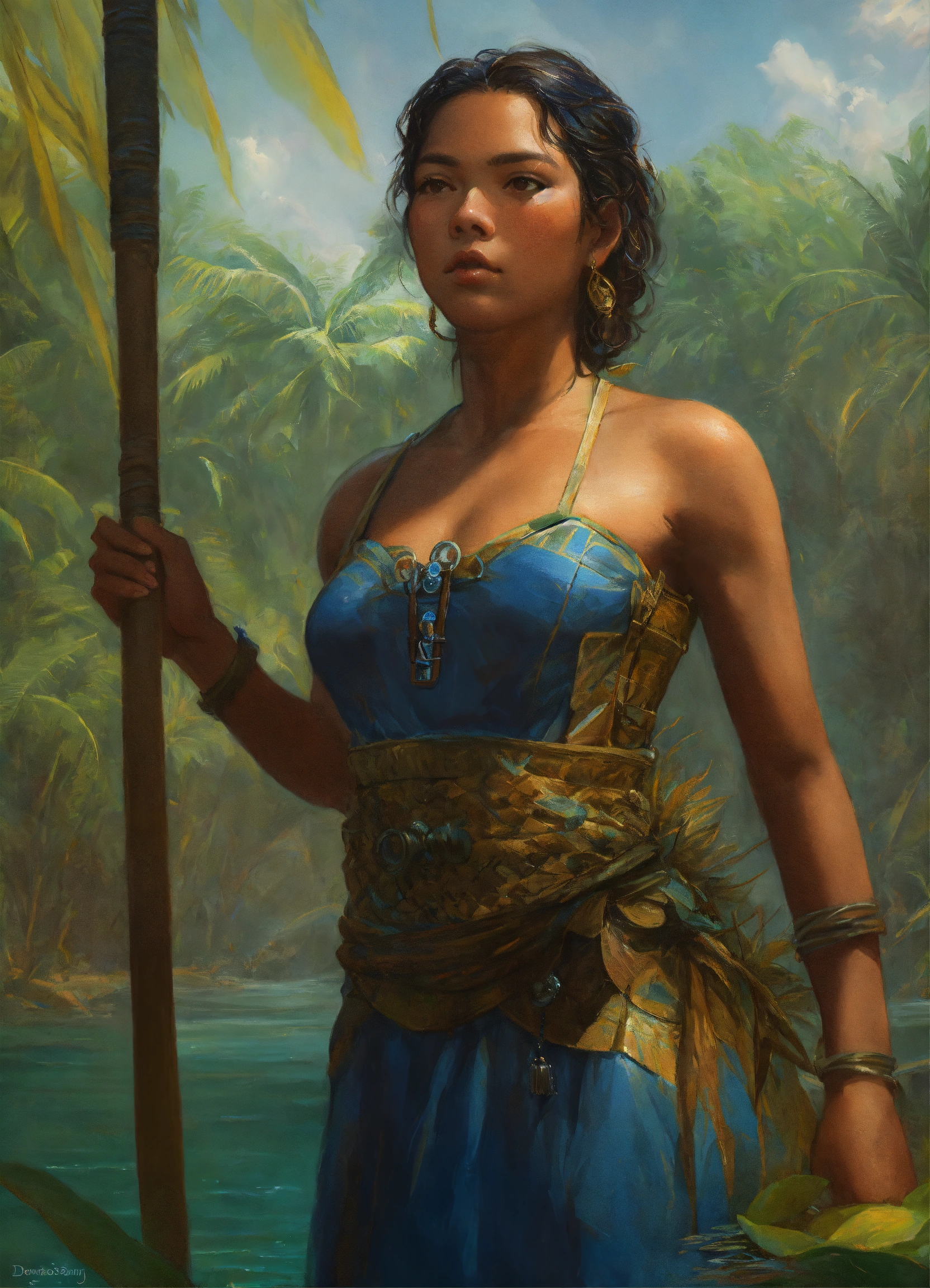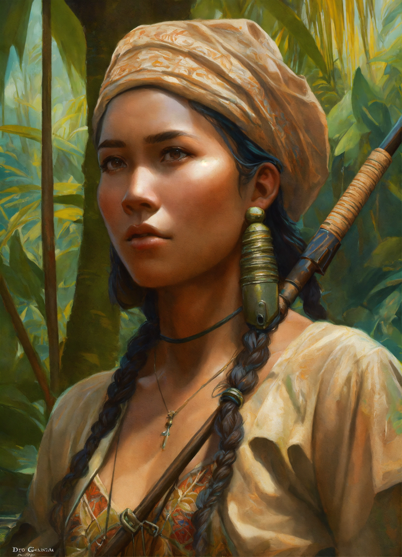 Close up, male filipino fisherwoman standing up on the jungle, epic, dramatic, intrincate, bahamas, 16th century, colonial, highly detailed, art by donato giancola and james gurney, digital art, trending on artstation, pinterest.
