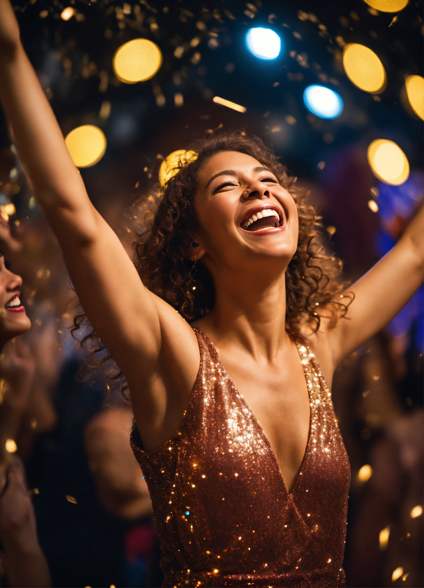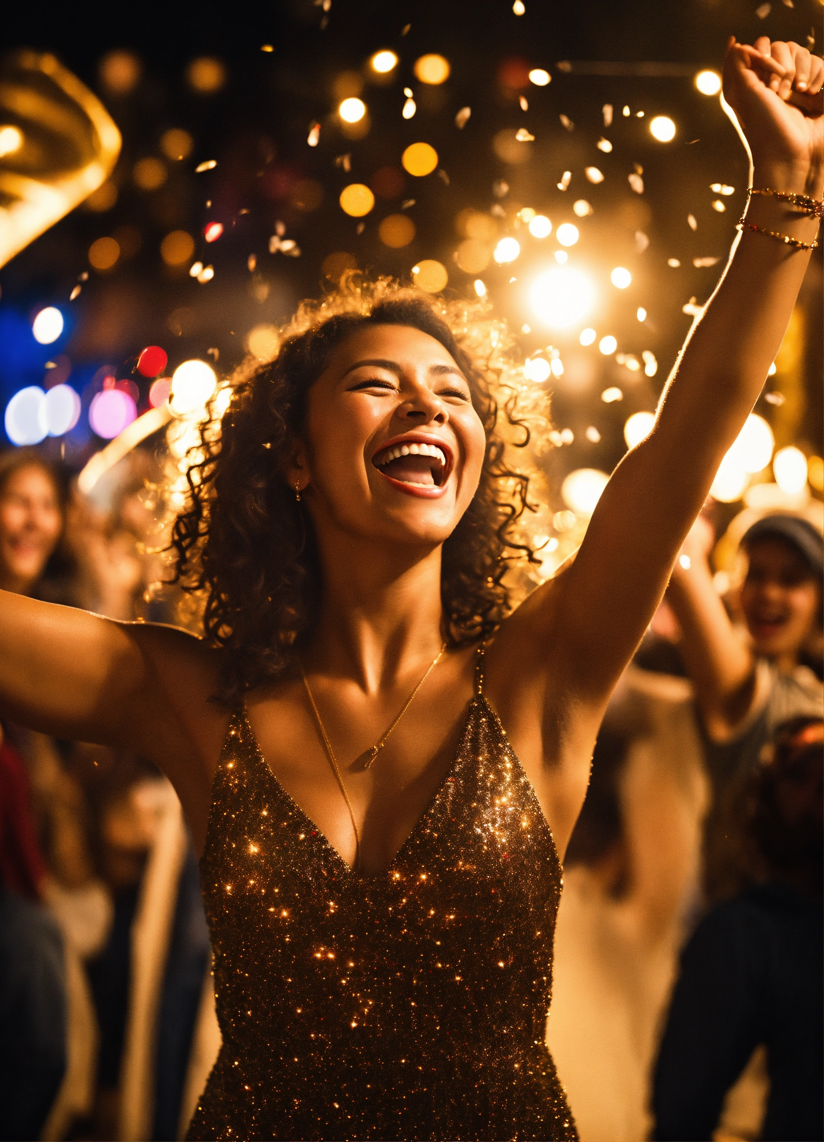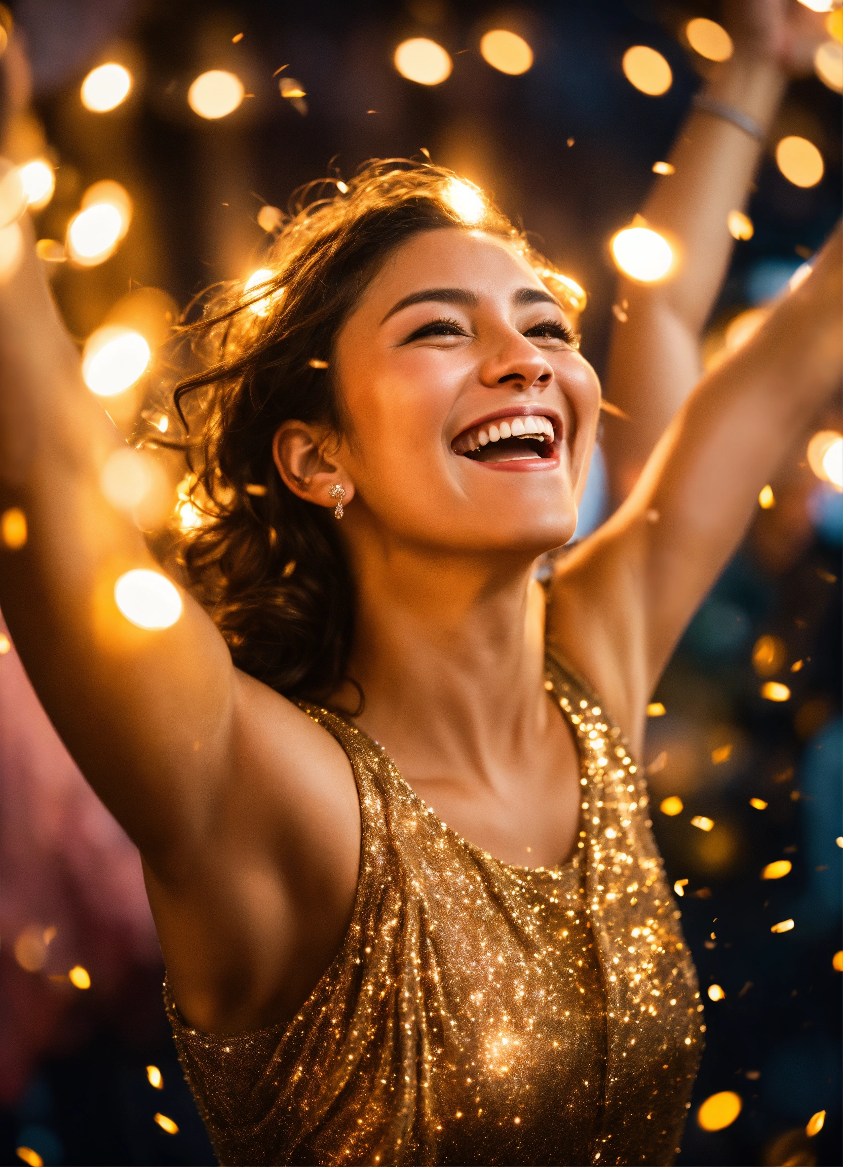 "joyous elevation woman celebrating her triumphant moment", jubilant expression, raised arms, nikon z9, sparkling festive lighting, photorealistic capture of pure elation.