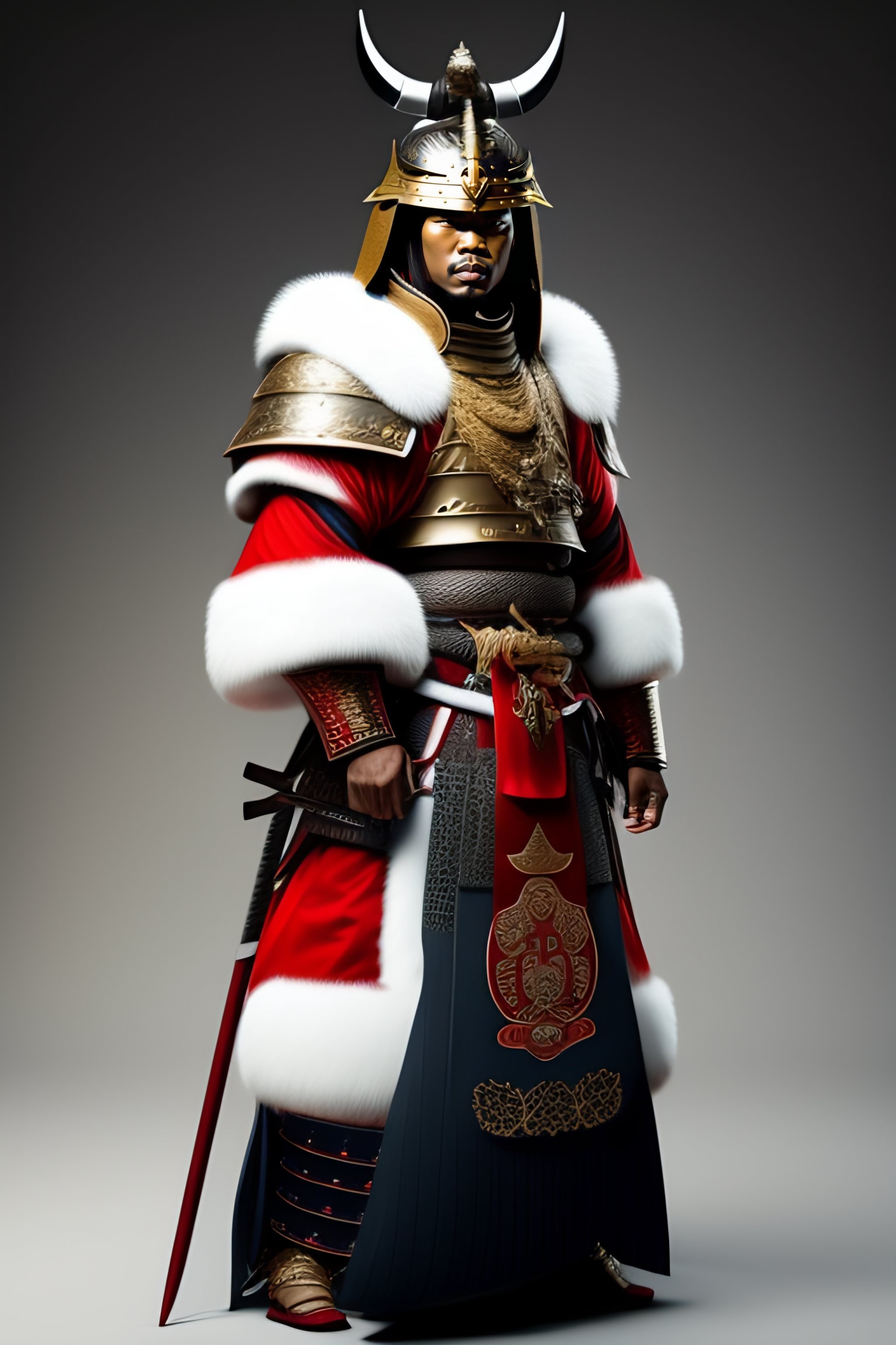 Full body shot of a samurai wearing authentic historical armor and a devilish samurai helmet with majestic, imposing white fur.
