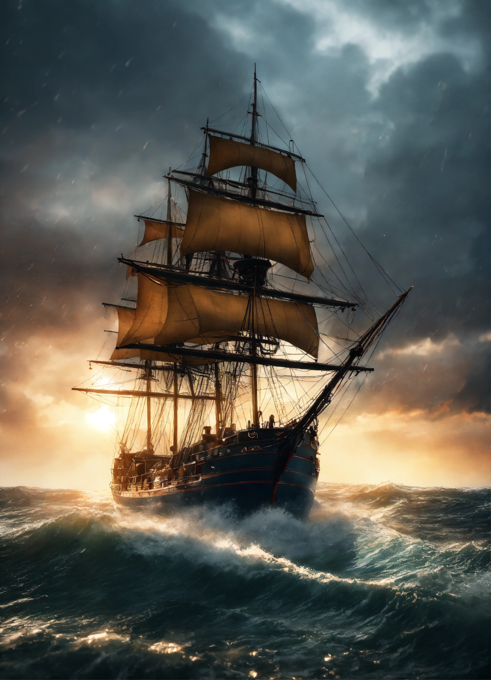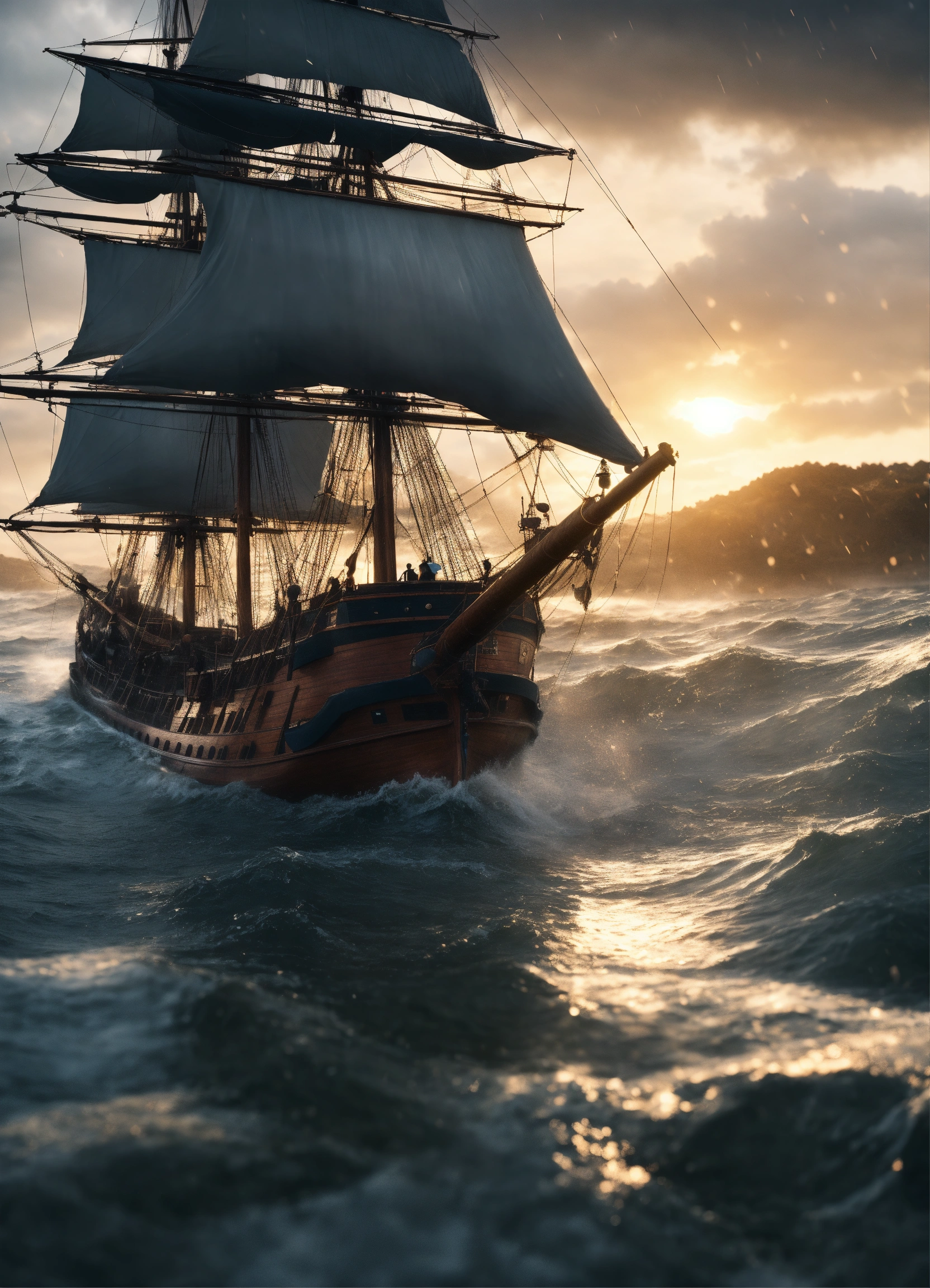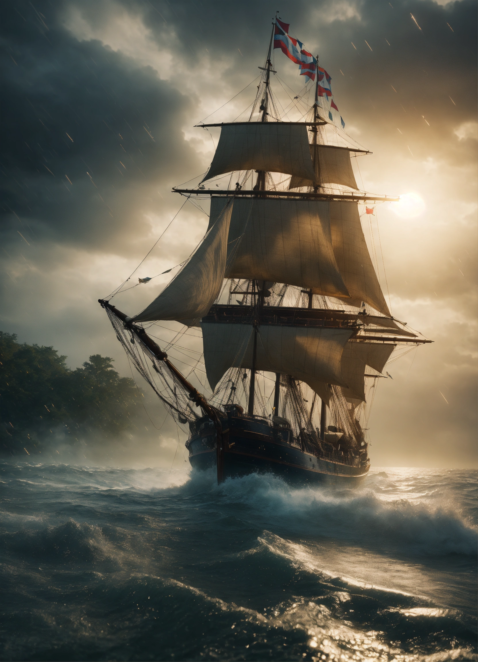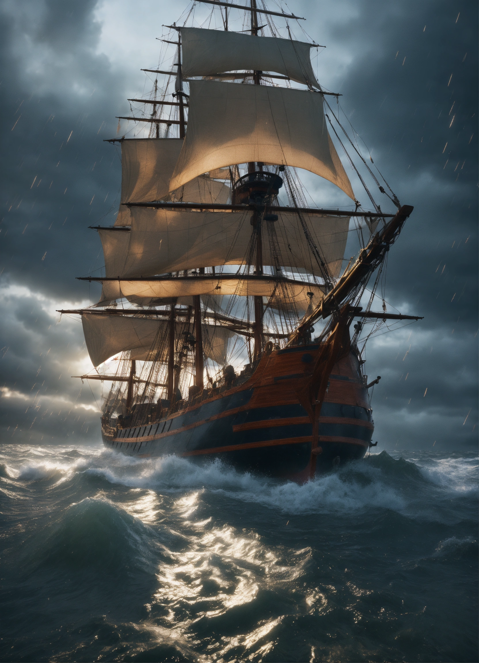 Deluge scene with sailing ship, cinematic style, blurred background, high detail, hr, realistic physics, photorealistic, ray tracing, unreal engine, hdr, 8k