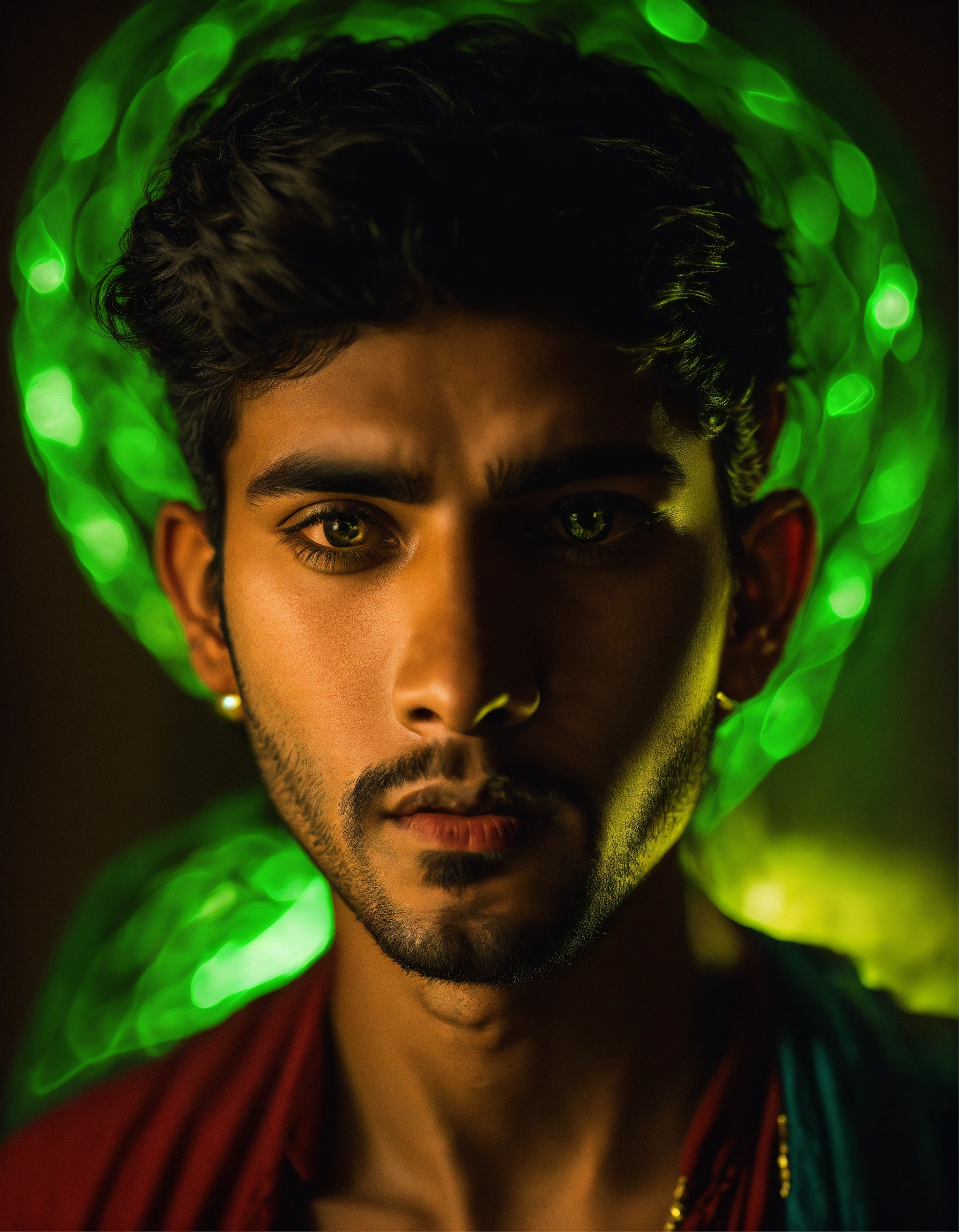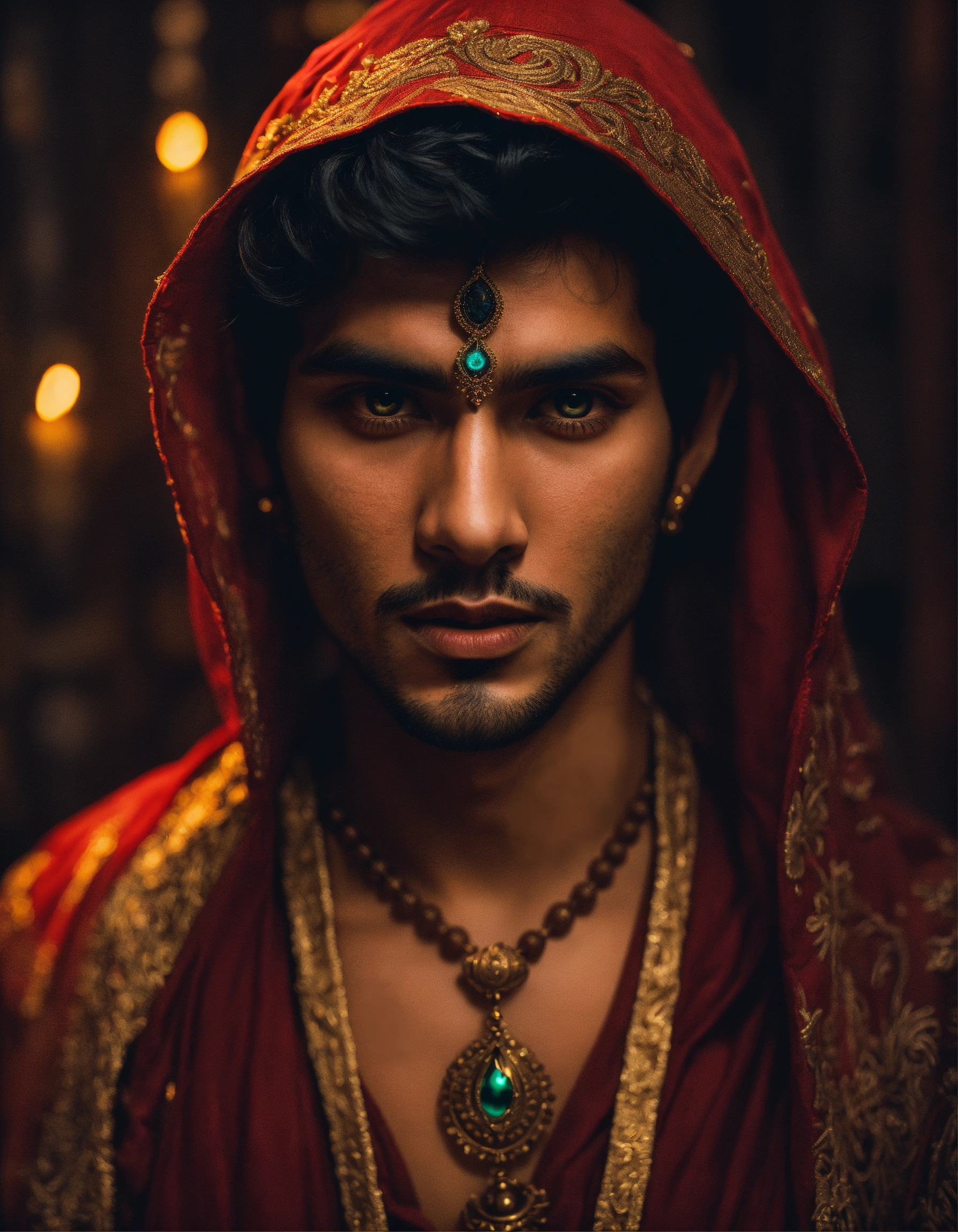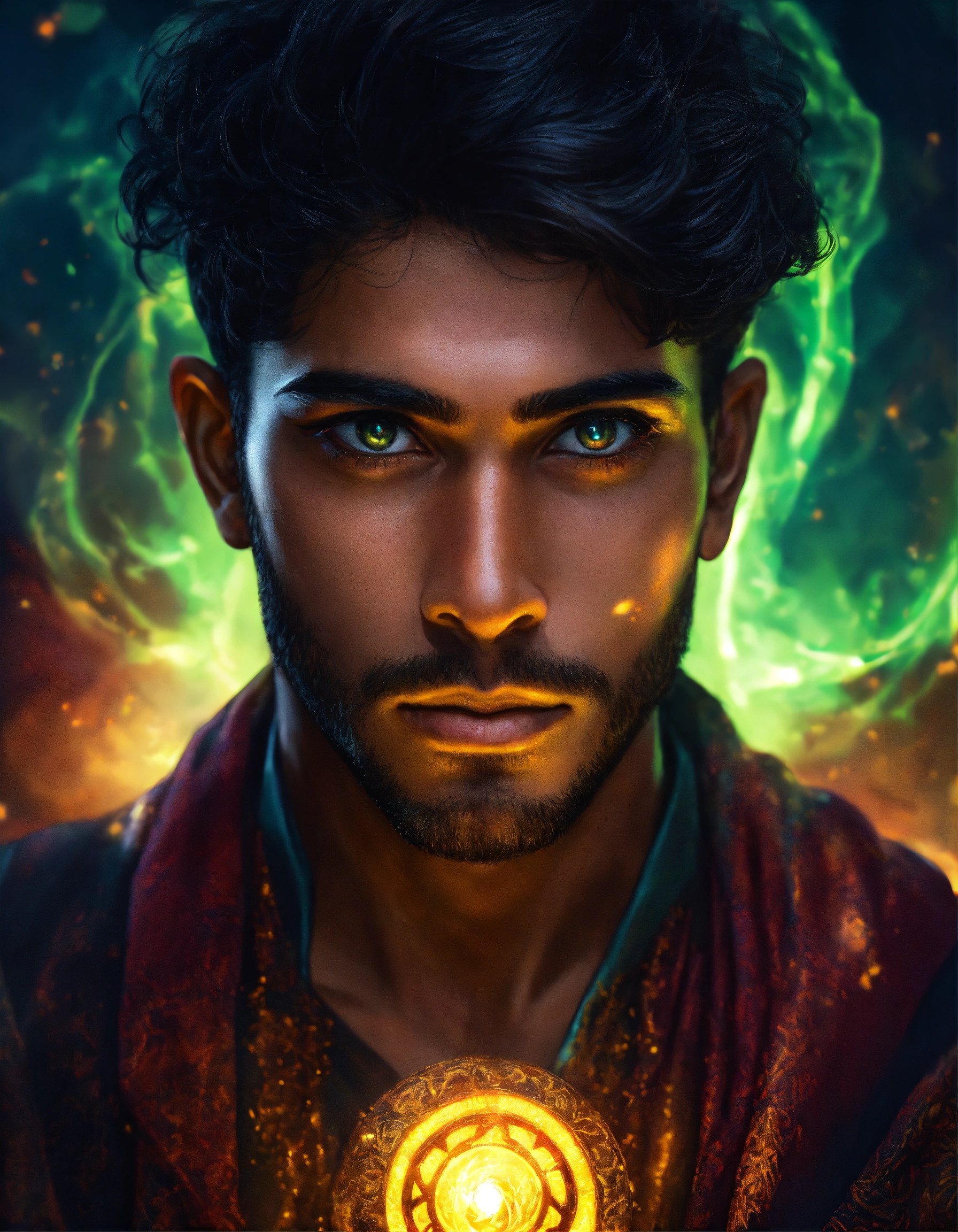 Dramatic headshot of a young handsome wicked south asian sorcerer with glowing hypnotic eyes, mysterious, enigmatic.