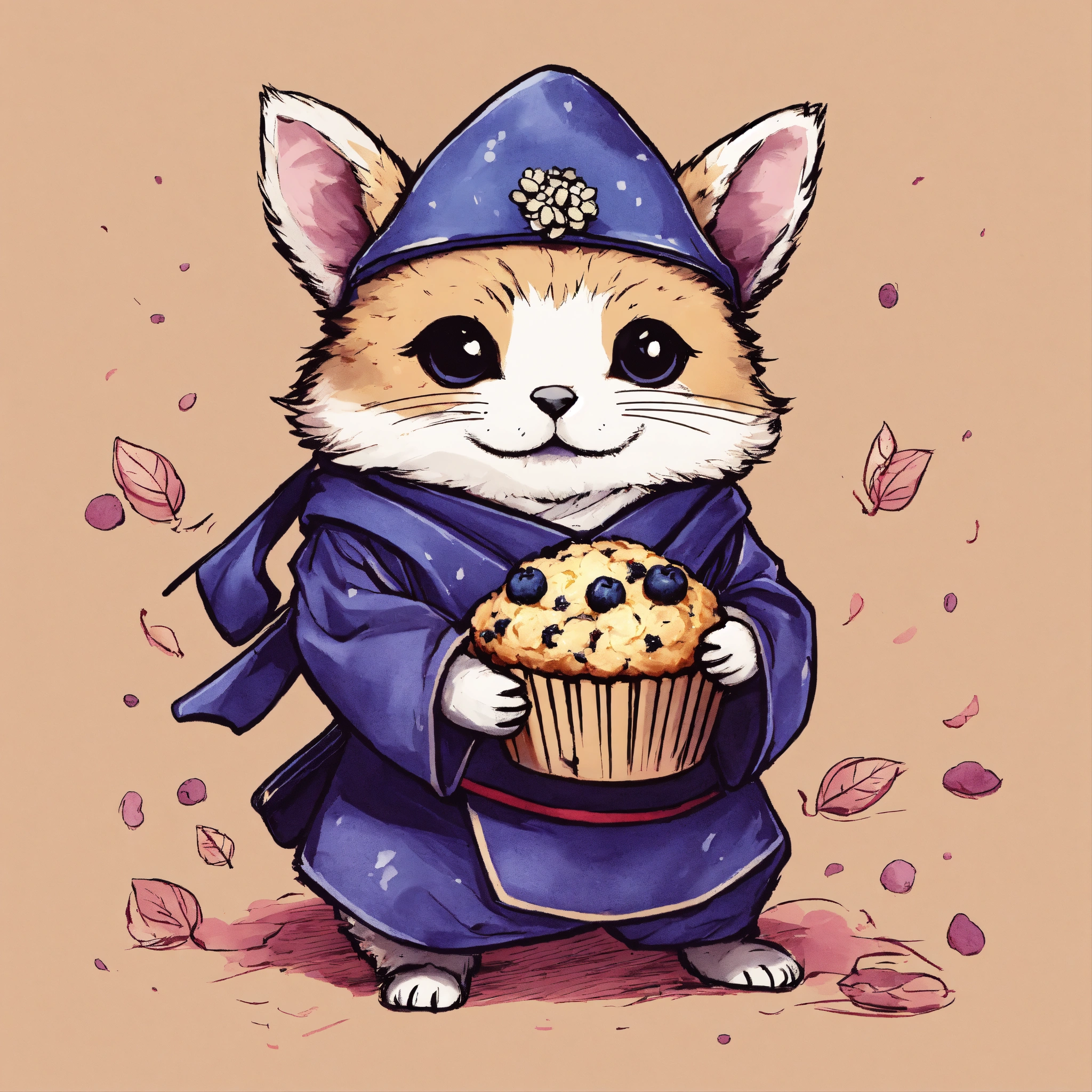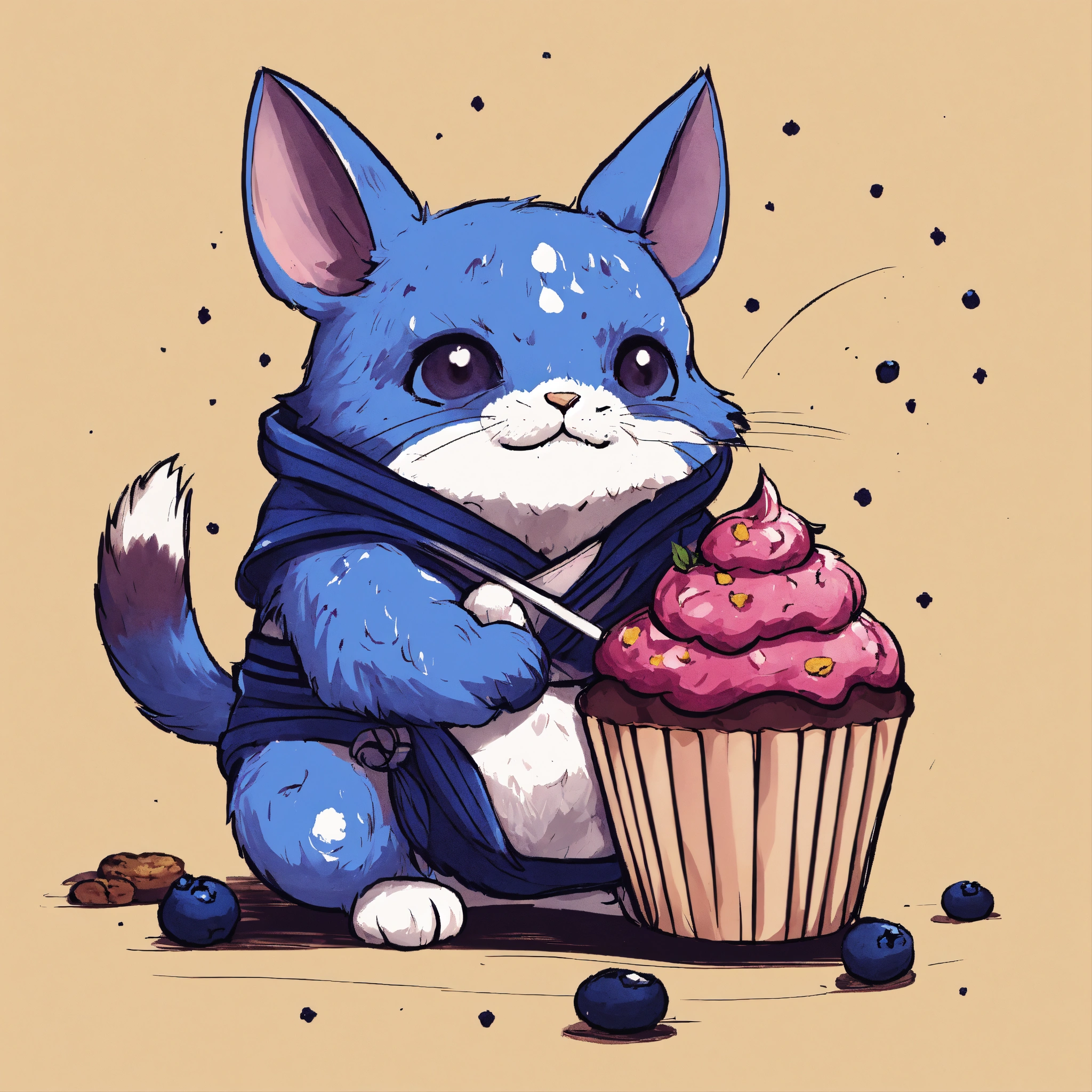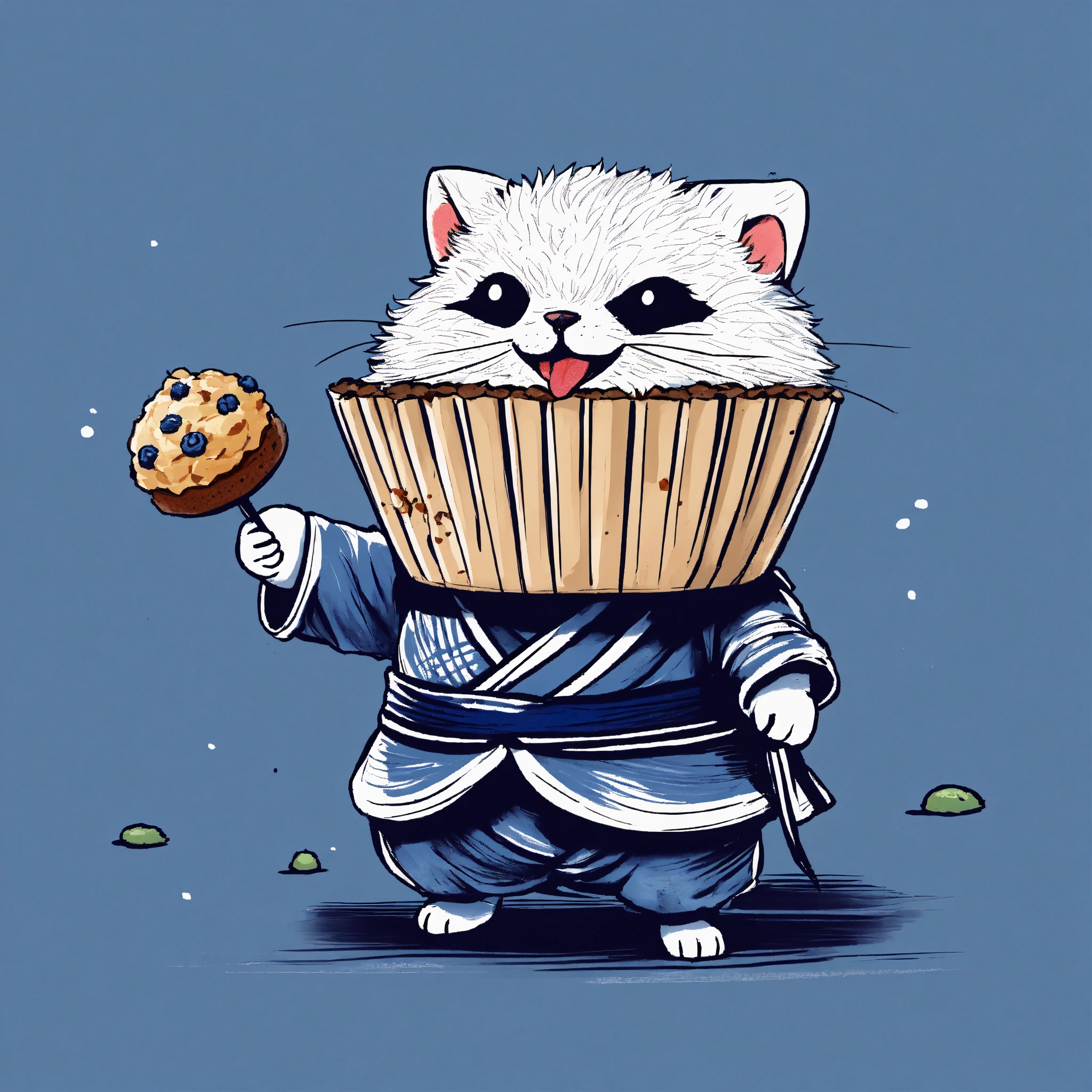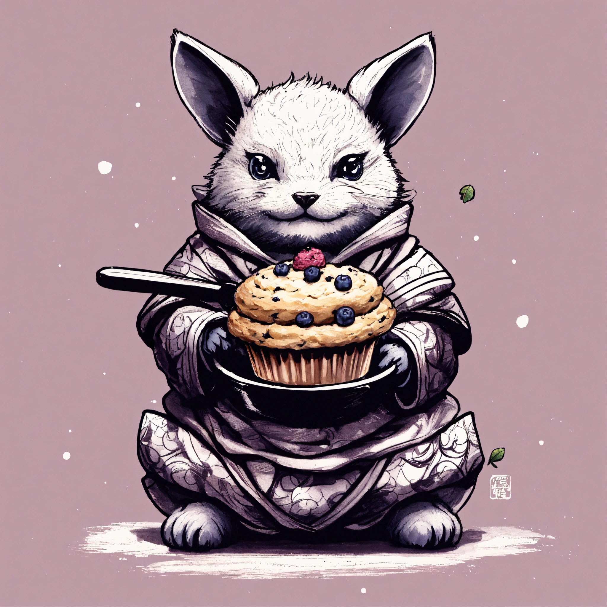 A small samurai holding a piece of a blueberry muffin with its tiny paws, taking little bites, eyes closed in delight, cute ink sketch style illustration