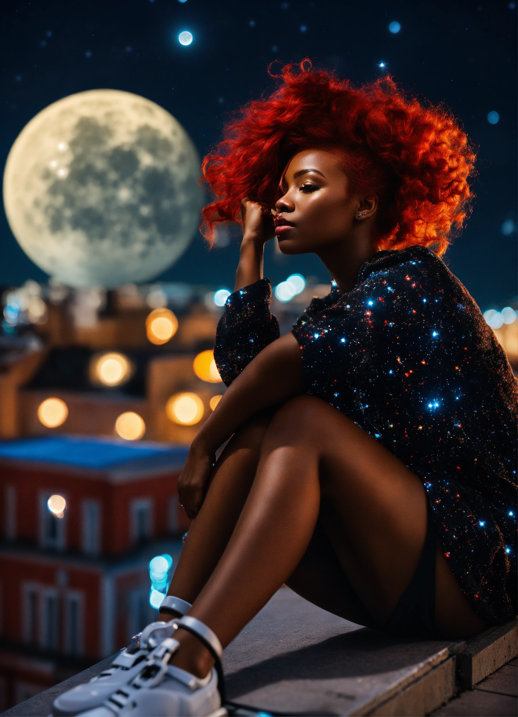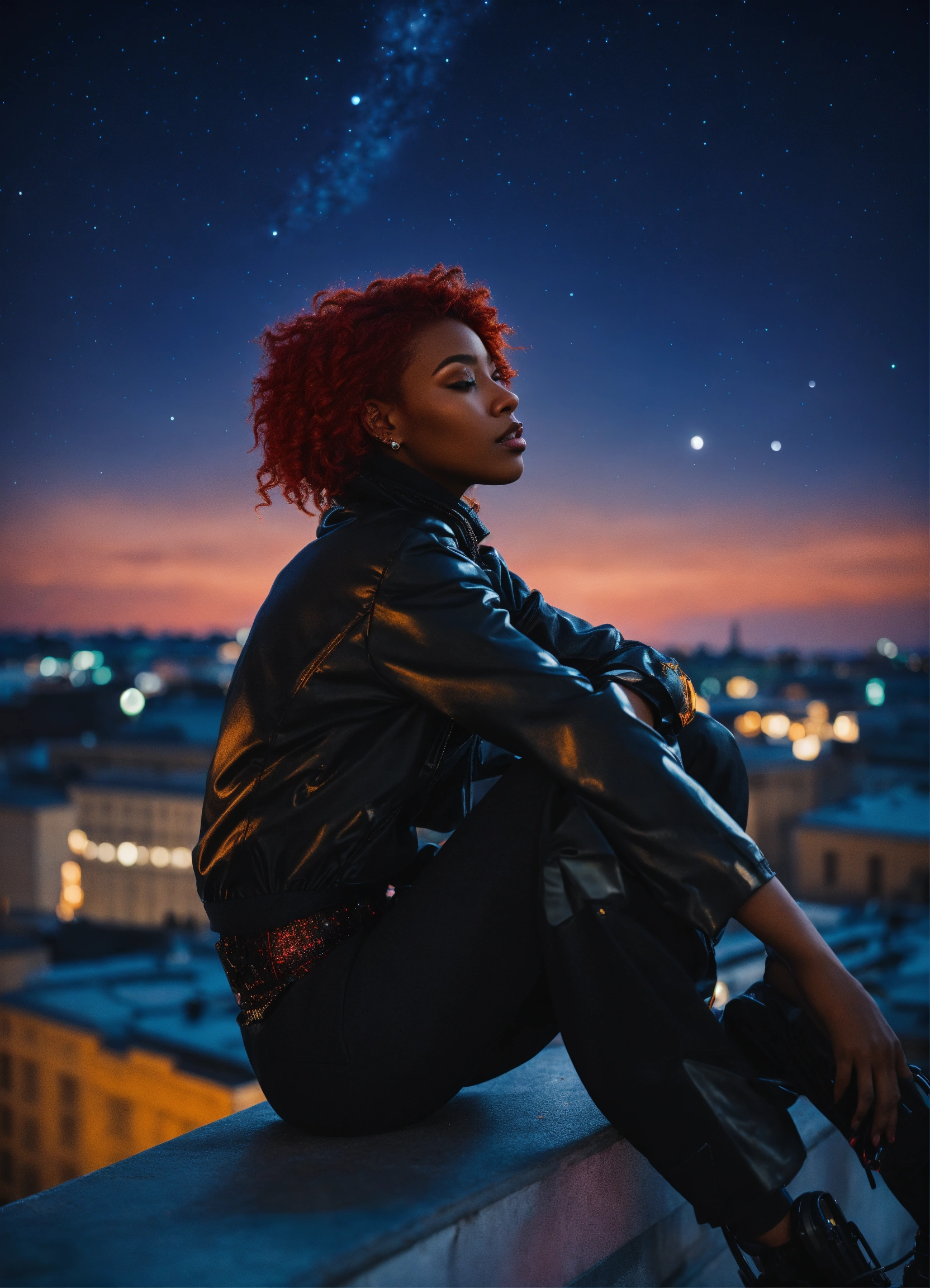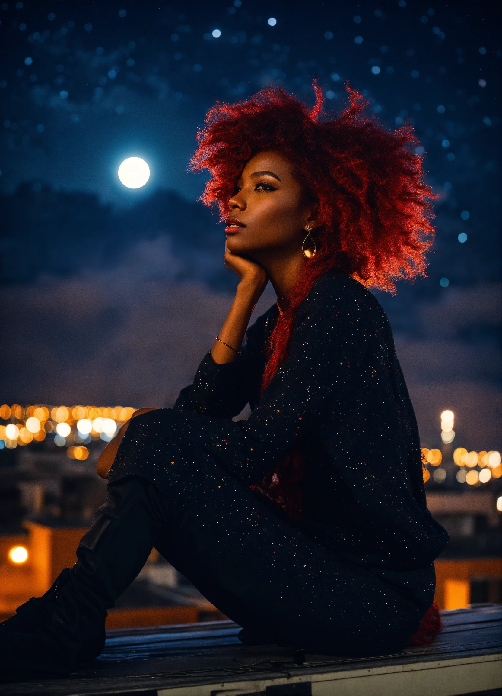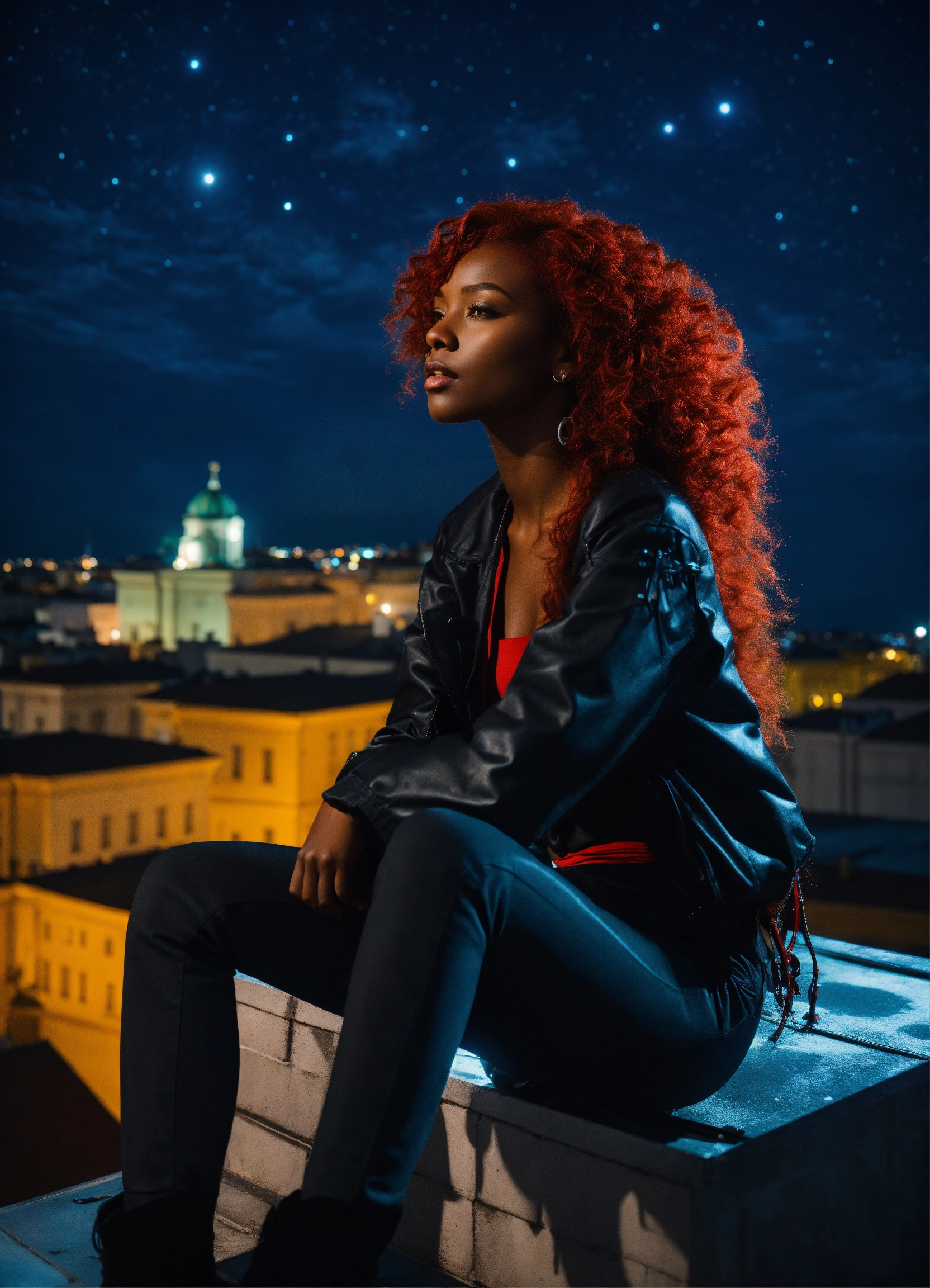 Black woman with red hair in robotic fashion, sitting on a rooftop in st. petersburg, moonlit starry sky, daydreaming