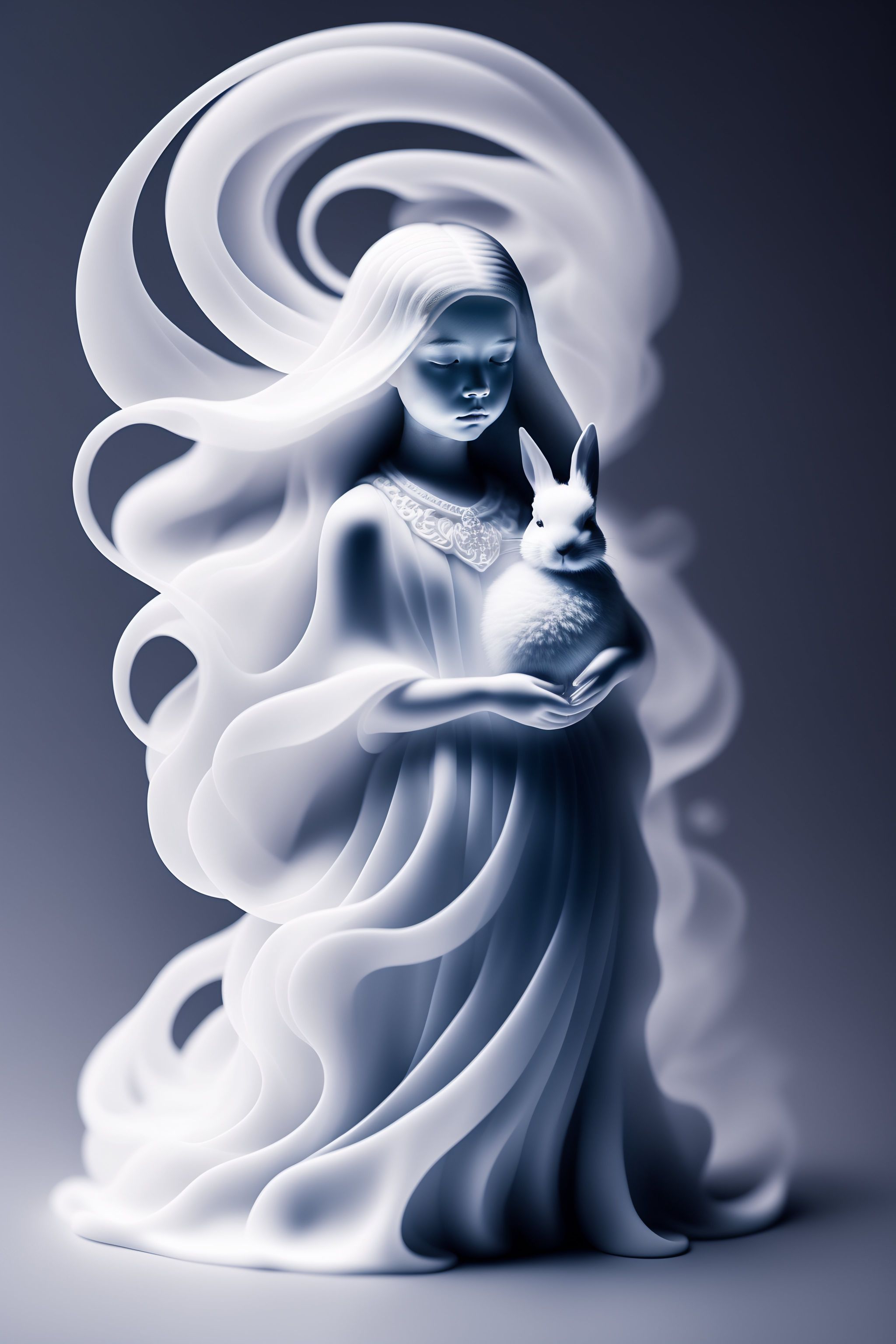 Young ghostly girl holding a rabbit, full form angle, depth data, by kazuki takamatsu, monochromatic, ghostly, fractal, smoke, art nouveau, ultra detailed