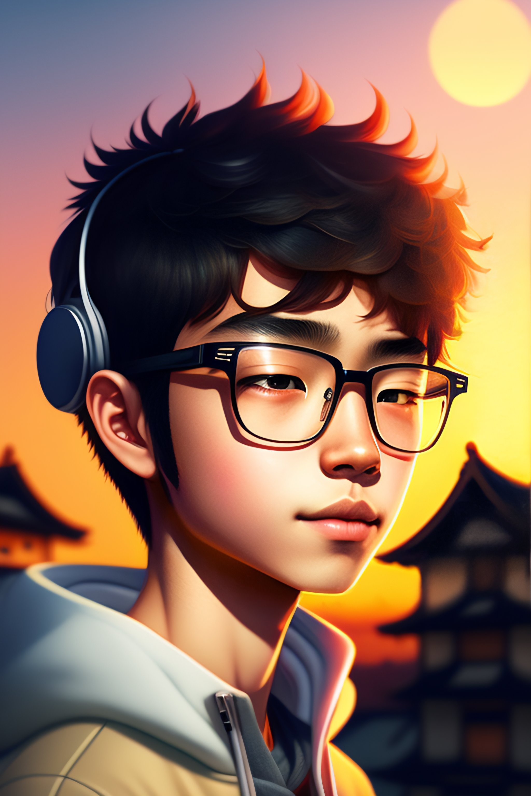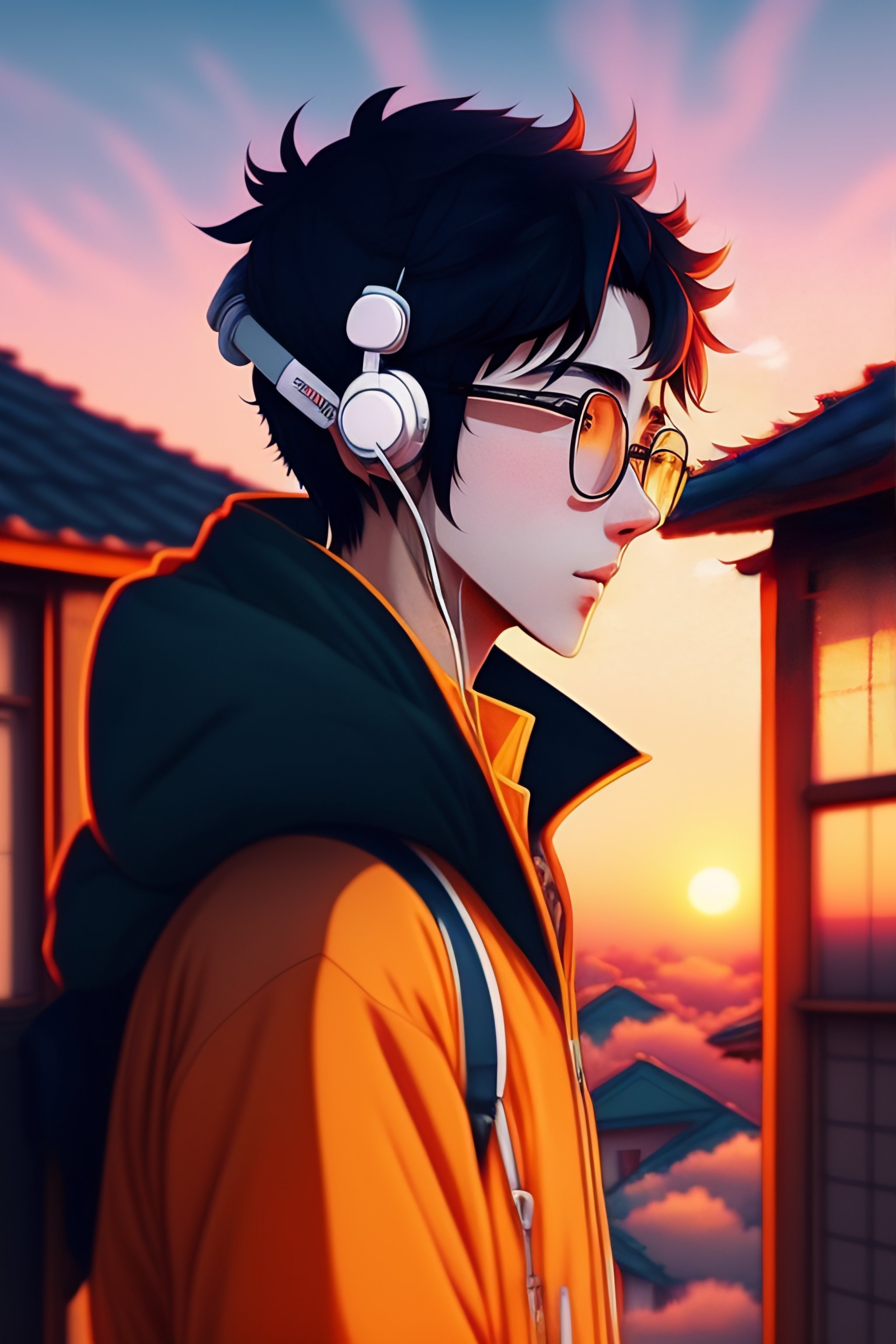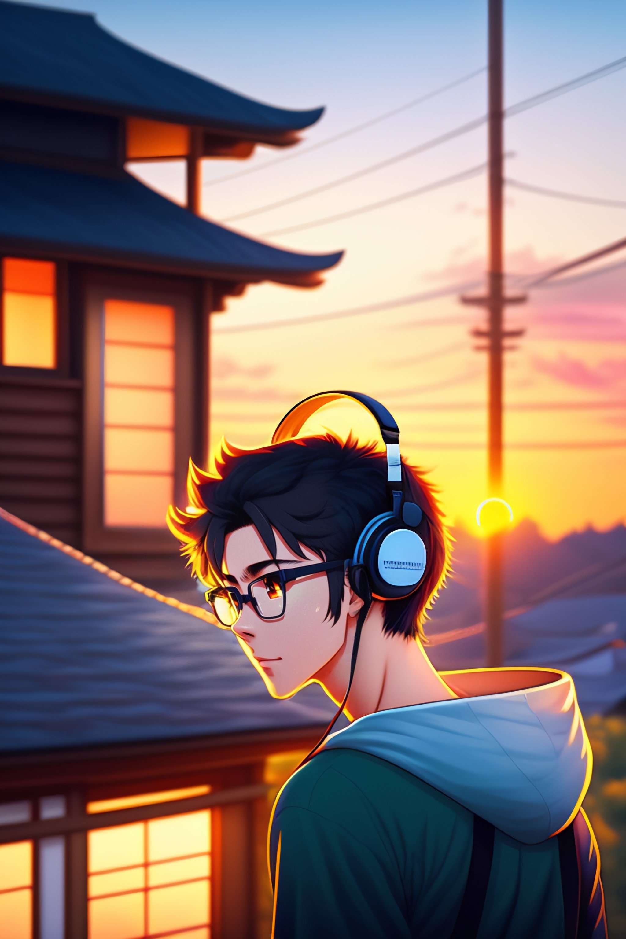 Skinny anime boy, glasses, listening to music with headphone in roof of house in rural japaneses city, wide angle, anime boy, sunset, relaxed