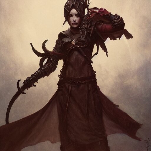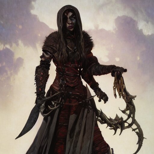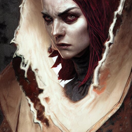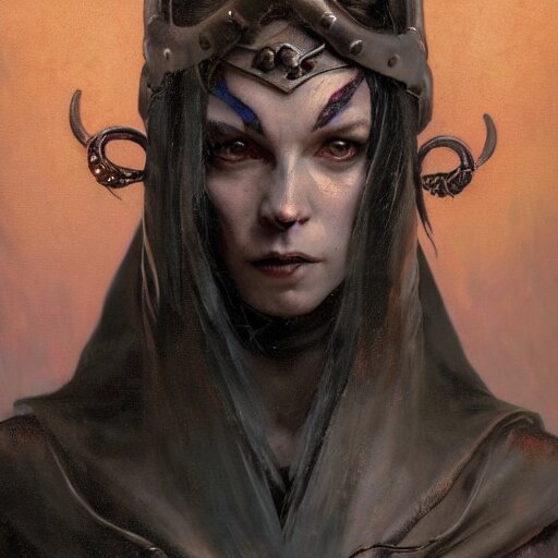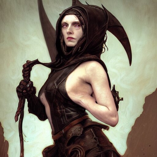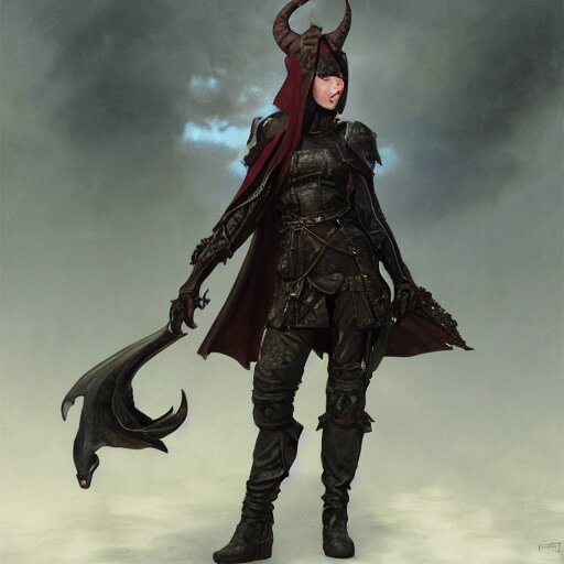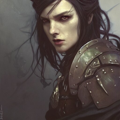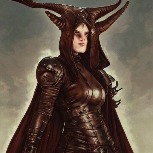 Portrait of a surly and resentful female tiefling thief with grit and small horns clothed in leather armor and a cloak, angry expression, by greg rutkowski and john collier and krenz cushart and artem demura and alphonse mucha and albert aublet, as seen on artstation, 4k, dungeons and dragons, very aesthetic, very detailed, intricate, unreal, fantasy, dramatic, painterly, artstation, sharp focus, smooth