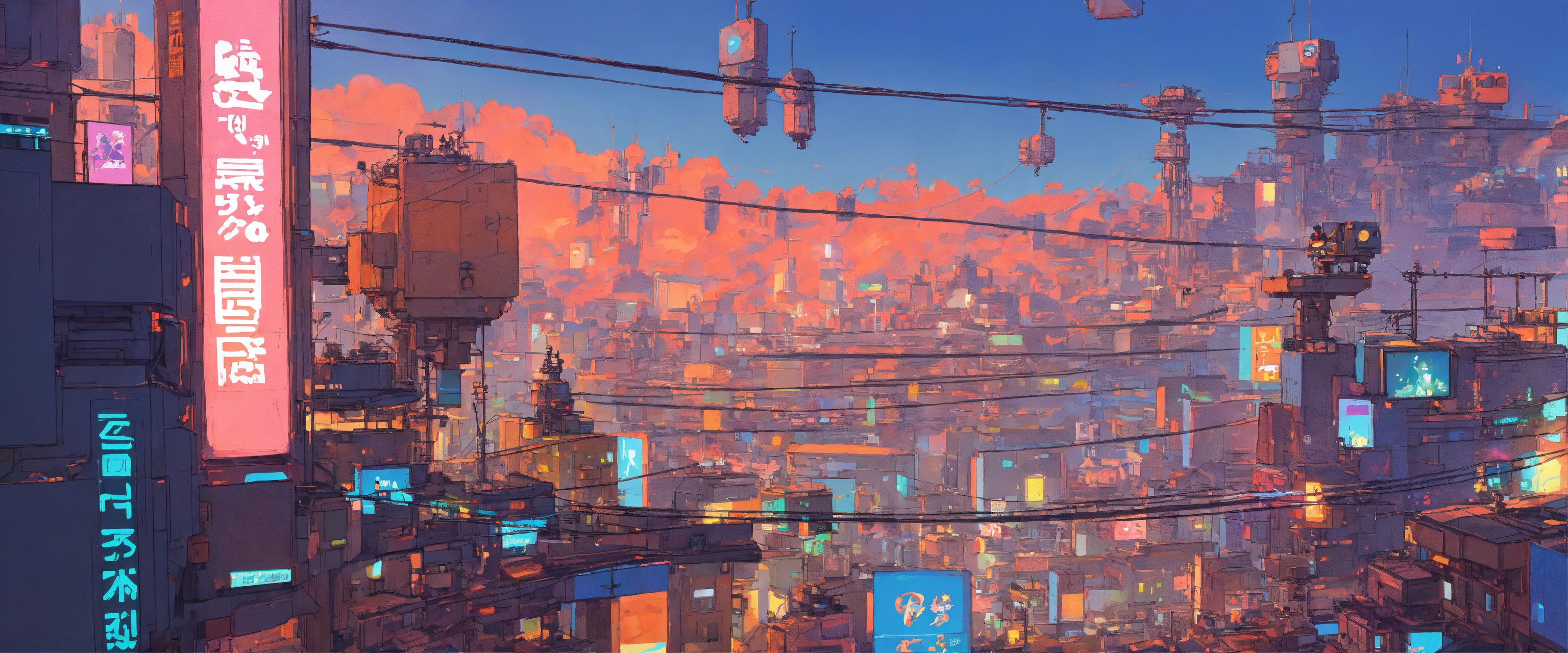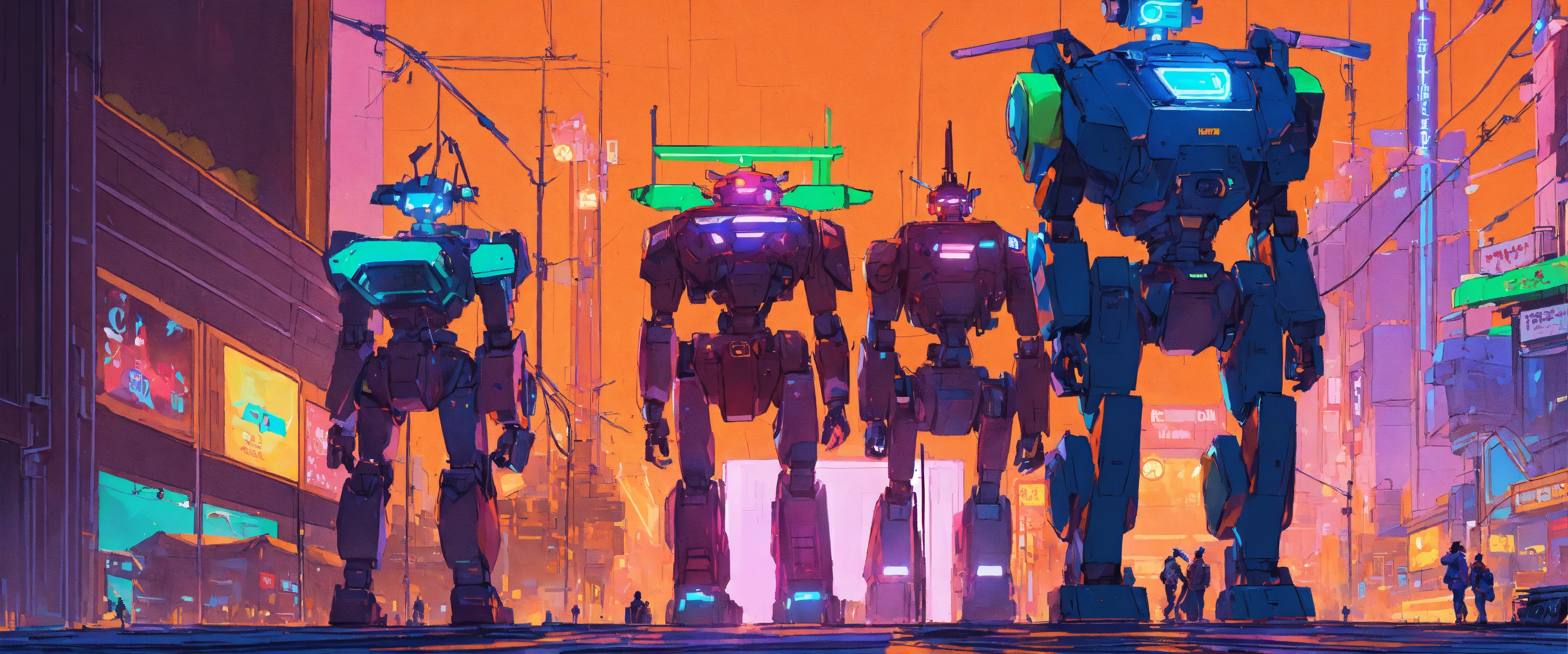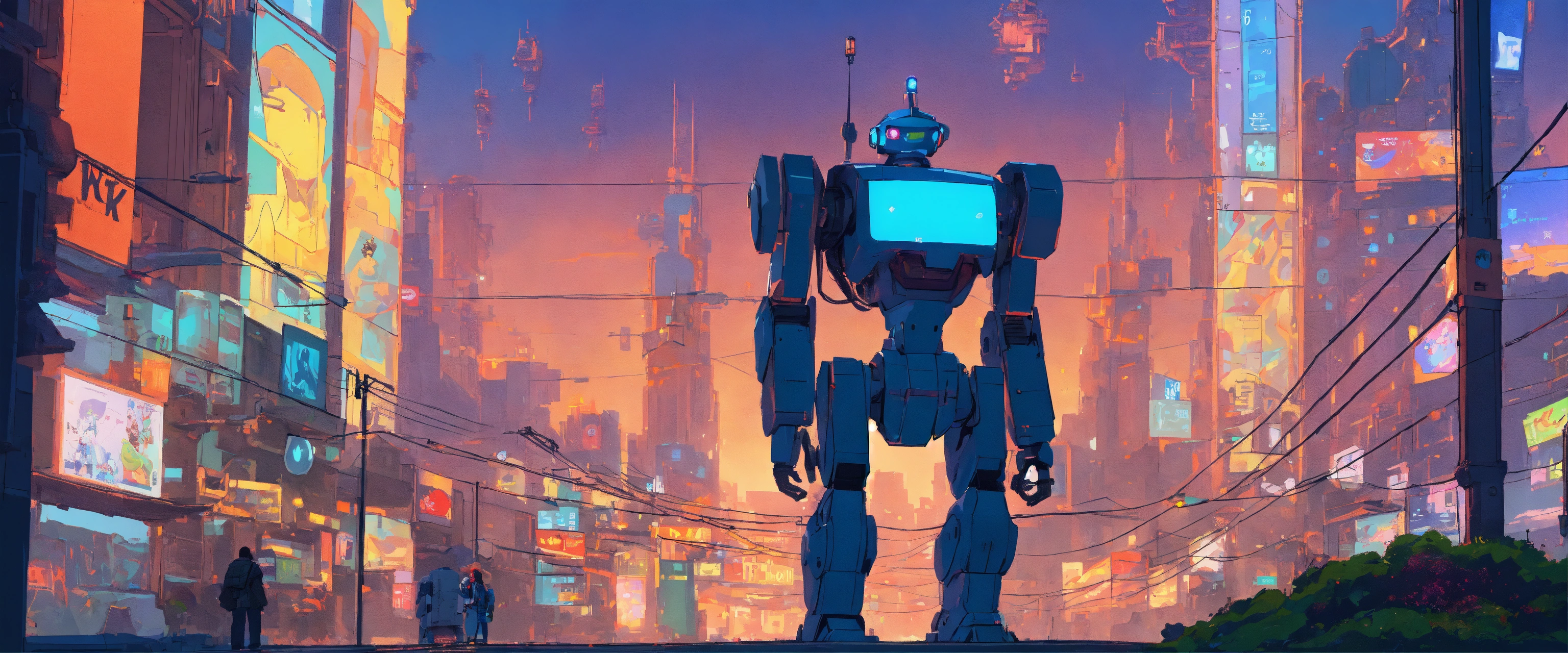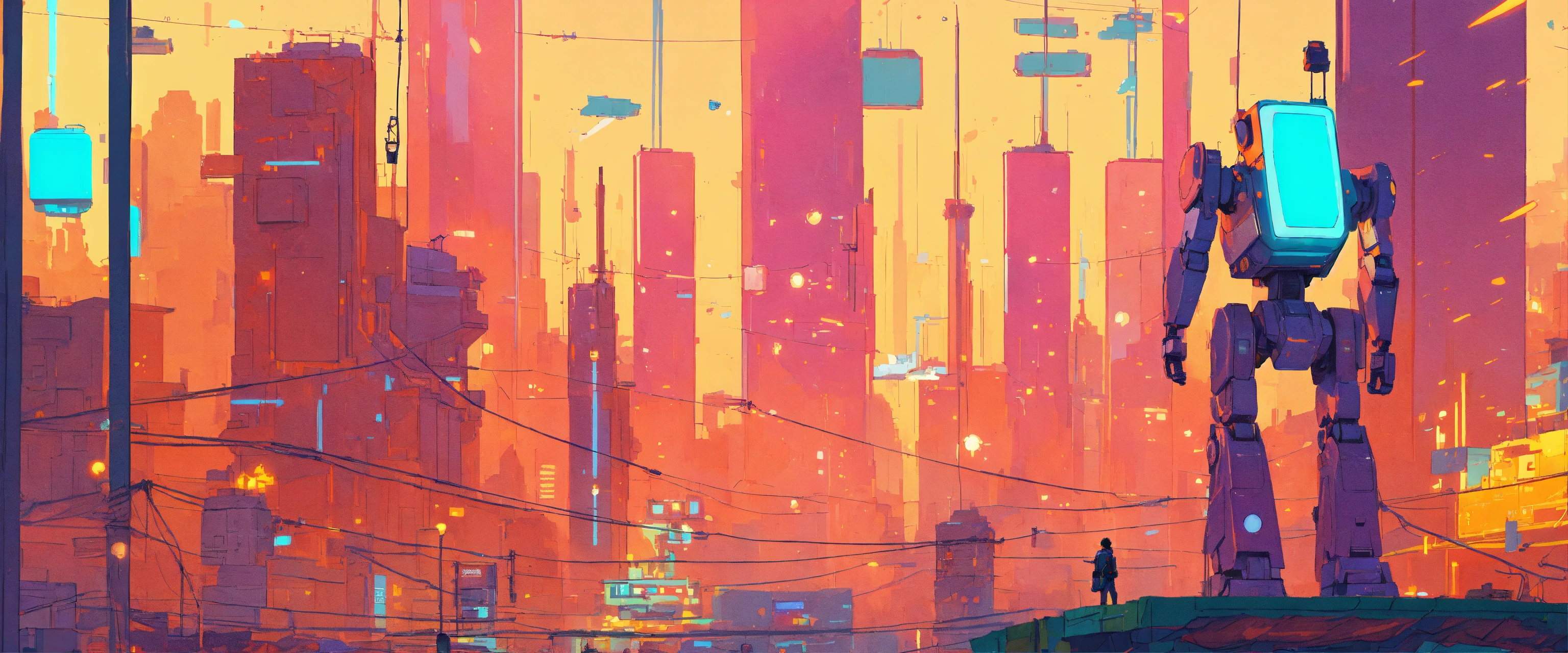 Photo of hero robots looking a big screen, a box in the air with strings, futurustic robot city, style of laurie greasley, studio ghibli, akira toriyama, james gilleard, genshin impact, trending pixiv fanbox, acrylic palette knife, 4k, vibrant colors, devinart, trending on artstation, low details