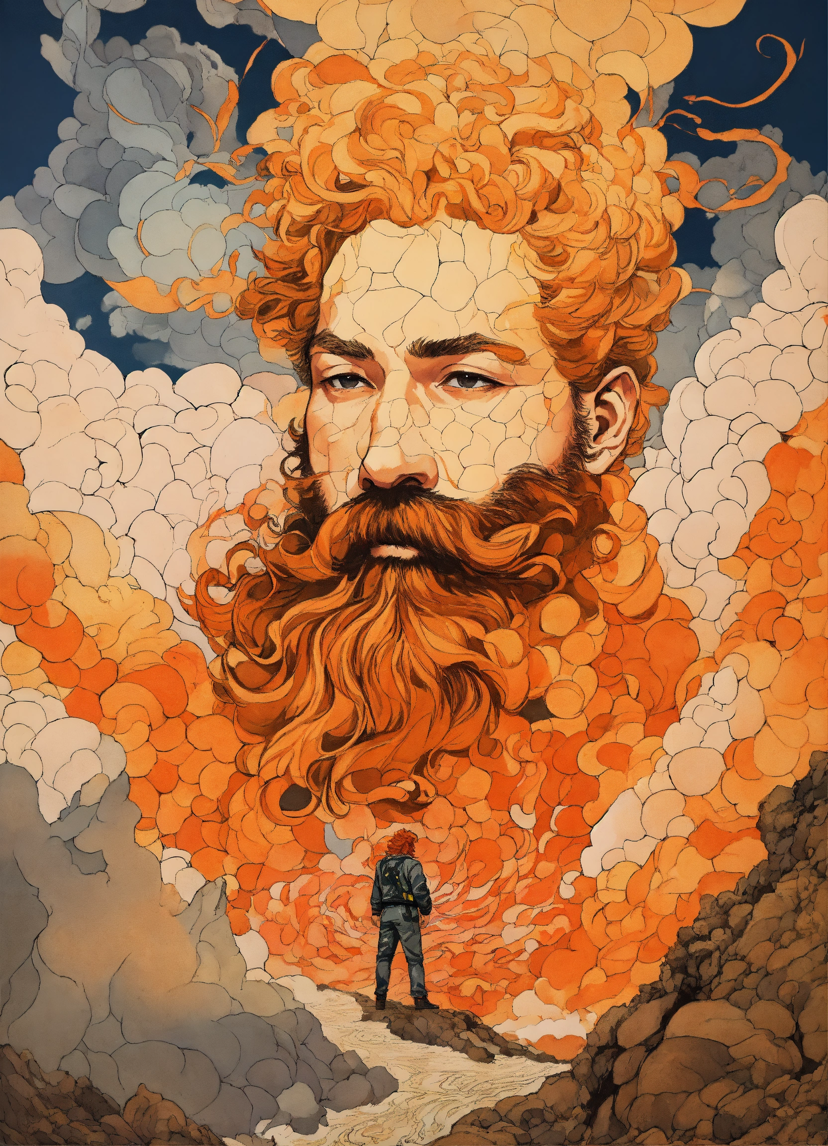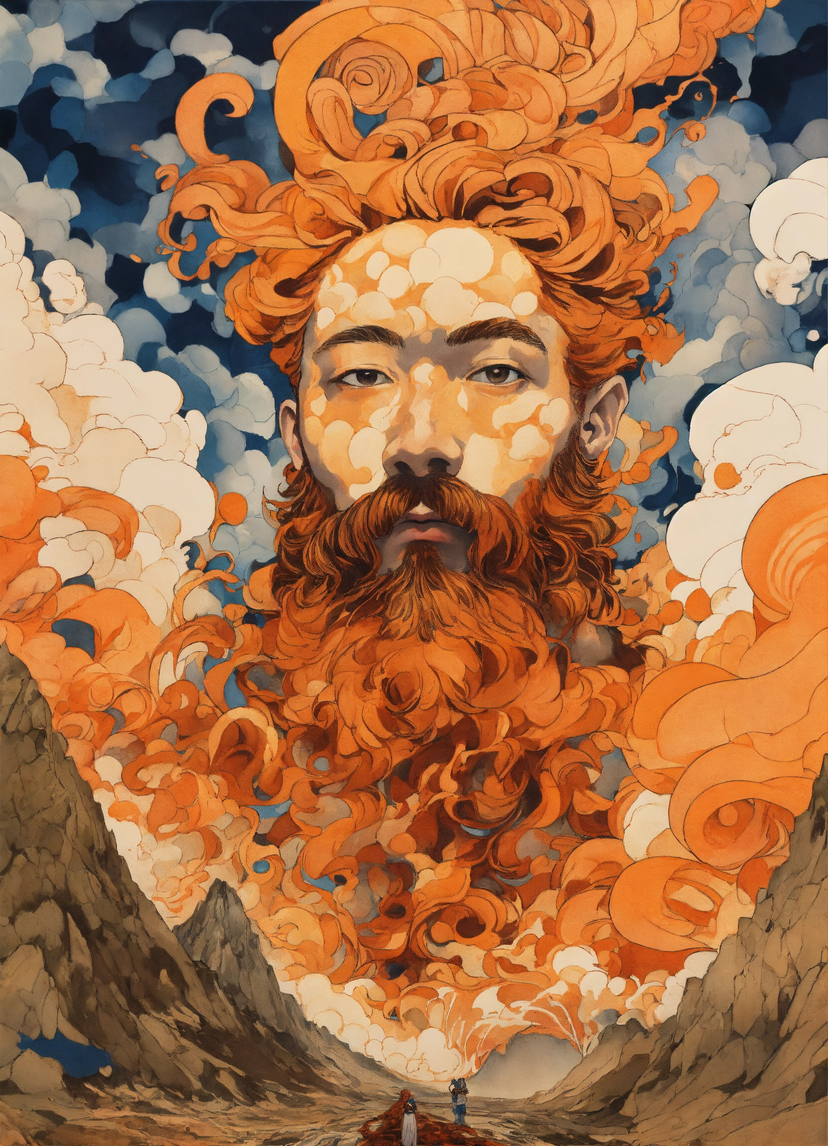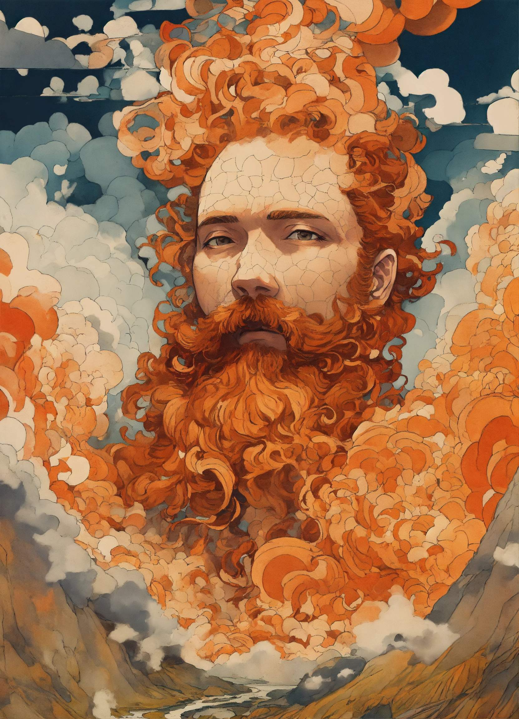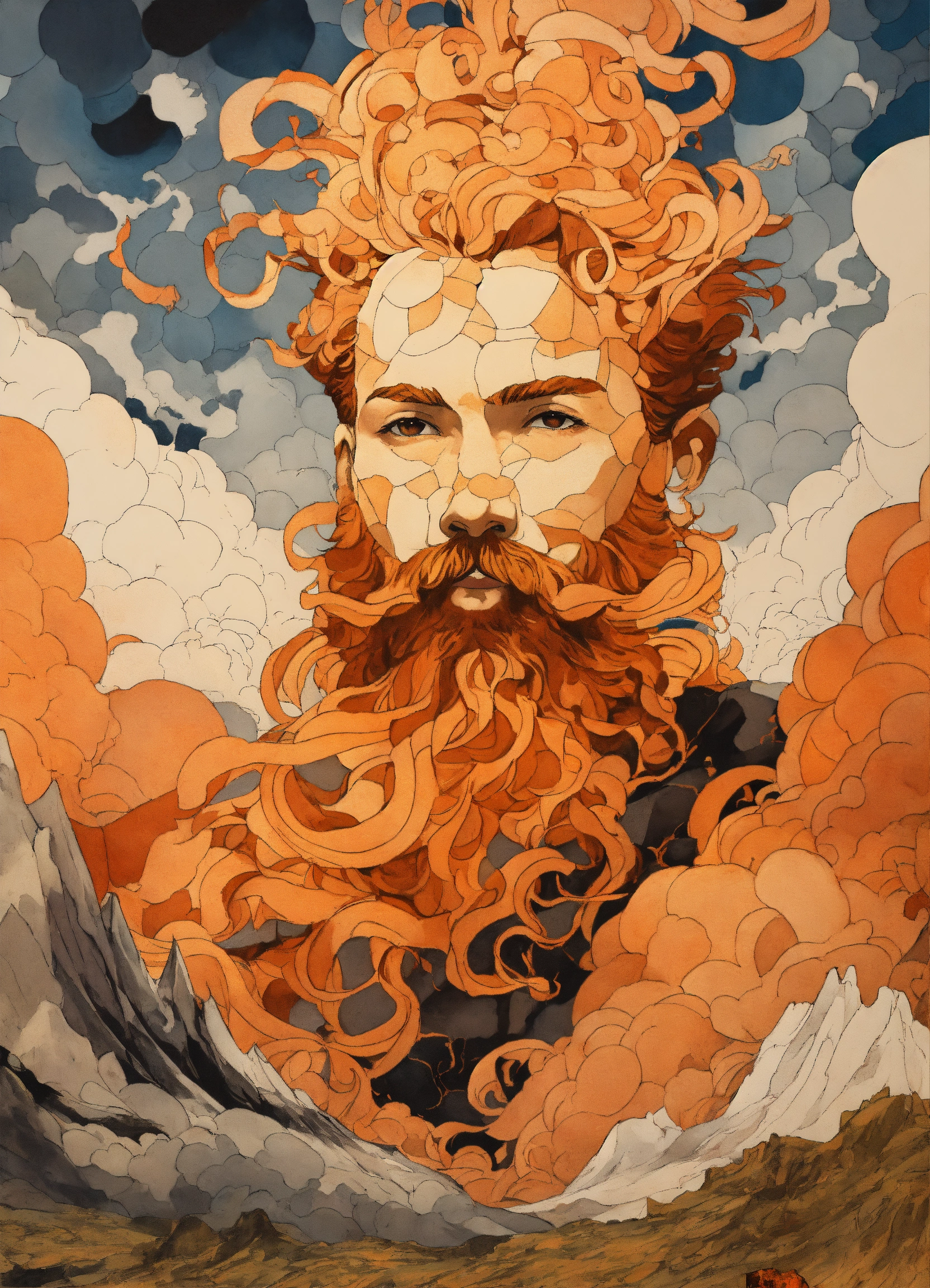 A portrait. a long-bearded swirling tessellation man with curly orange hair swirling into a landscape of volcanos exploding. juxtaposition of clouds. shibori, vertical tessellation, fibonacci sequence, yoji shinkawa, kintsugi, comic book, heavy outline