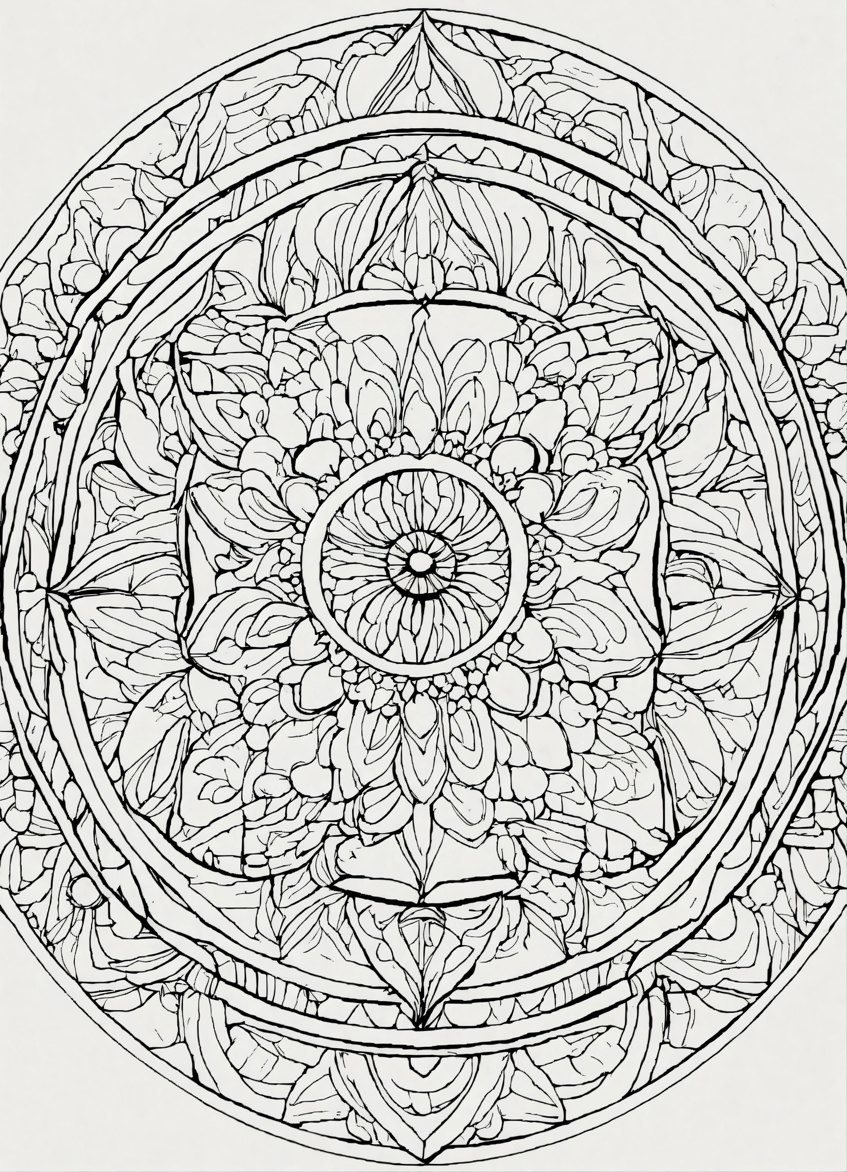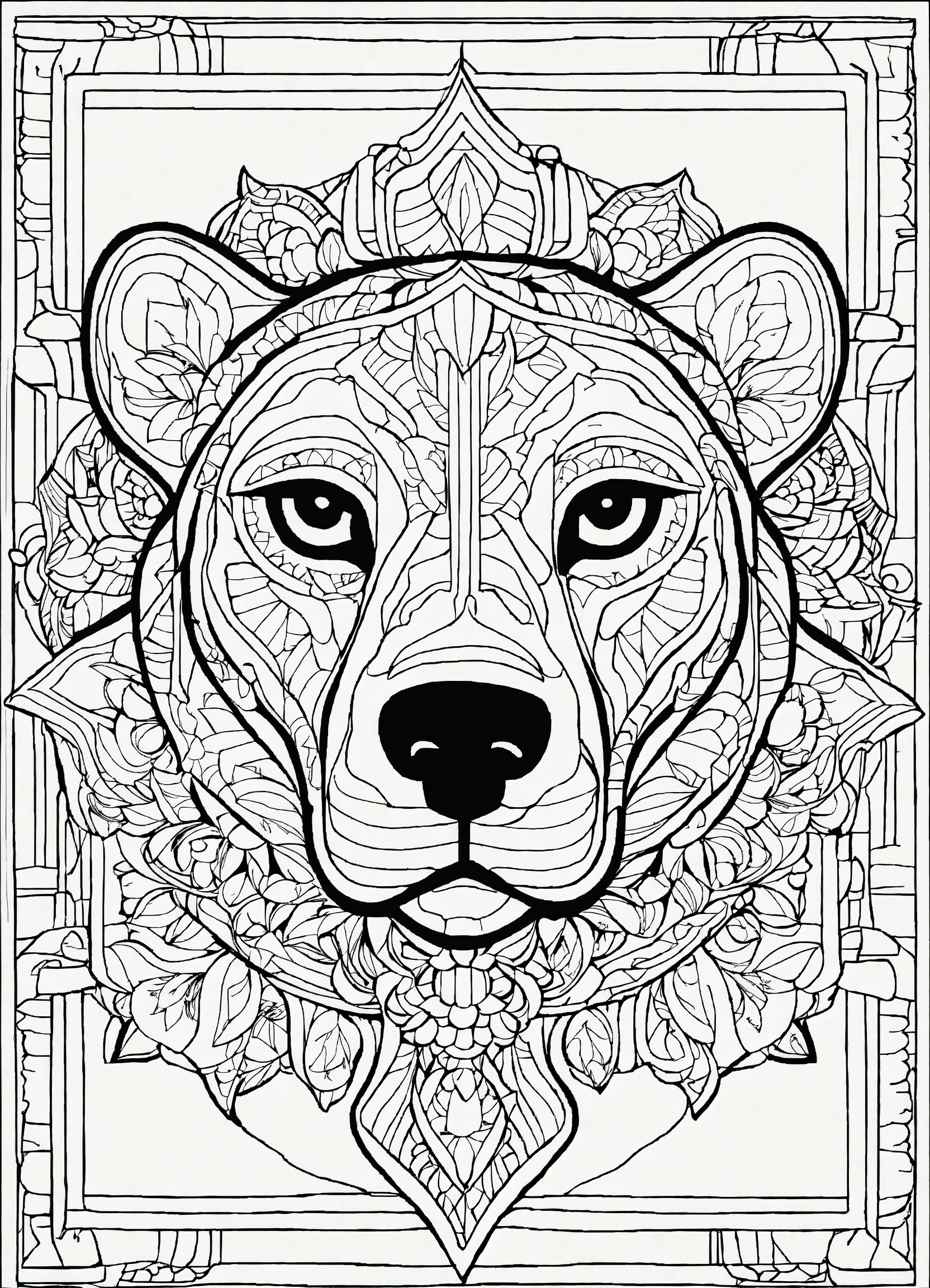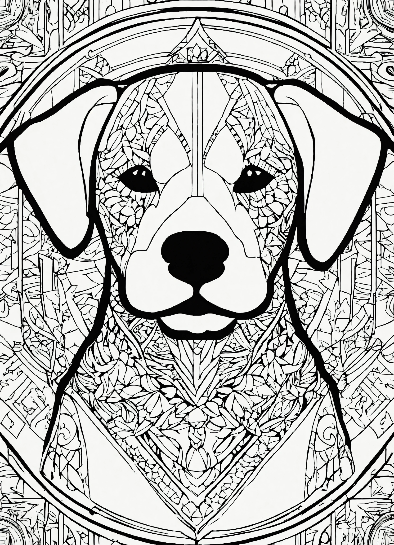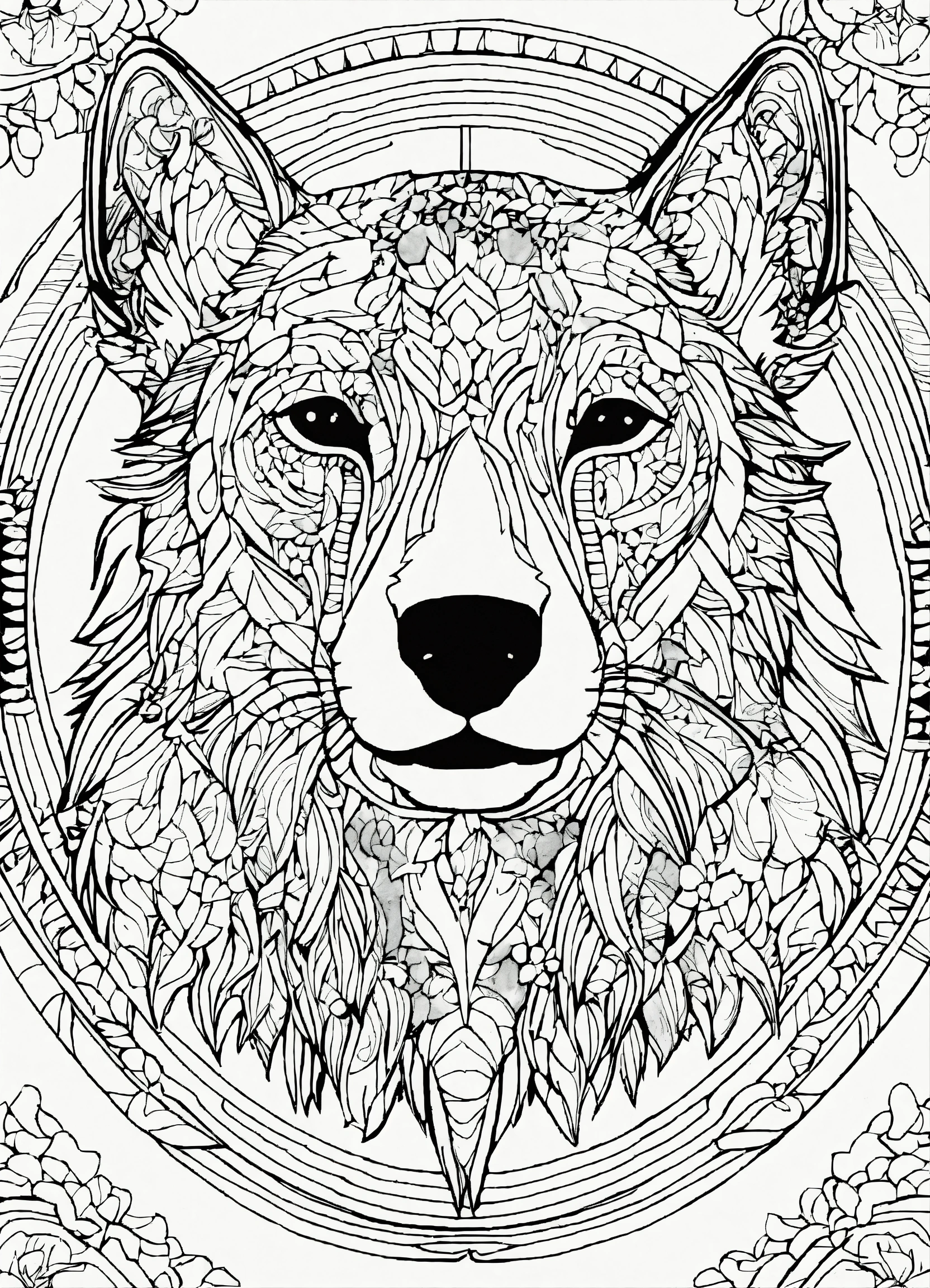 Coloring page for adults, bold lines, dark lines, mandala body, mandala dog sane bernardo face, mandala face, symmetrical, white background, clean line art, fine line art