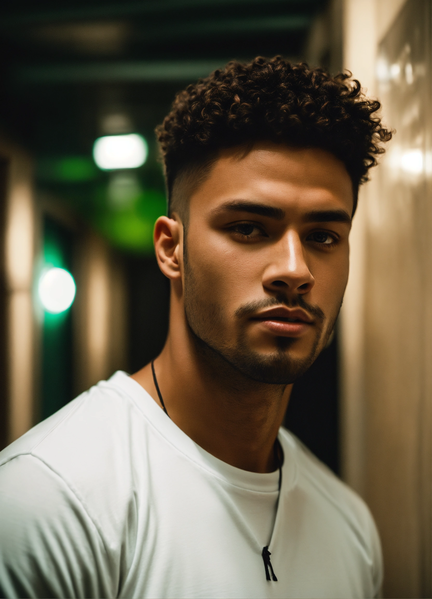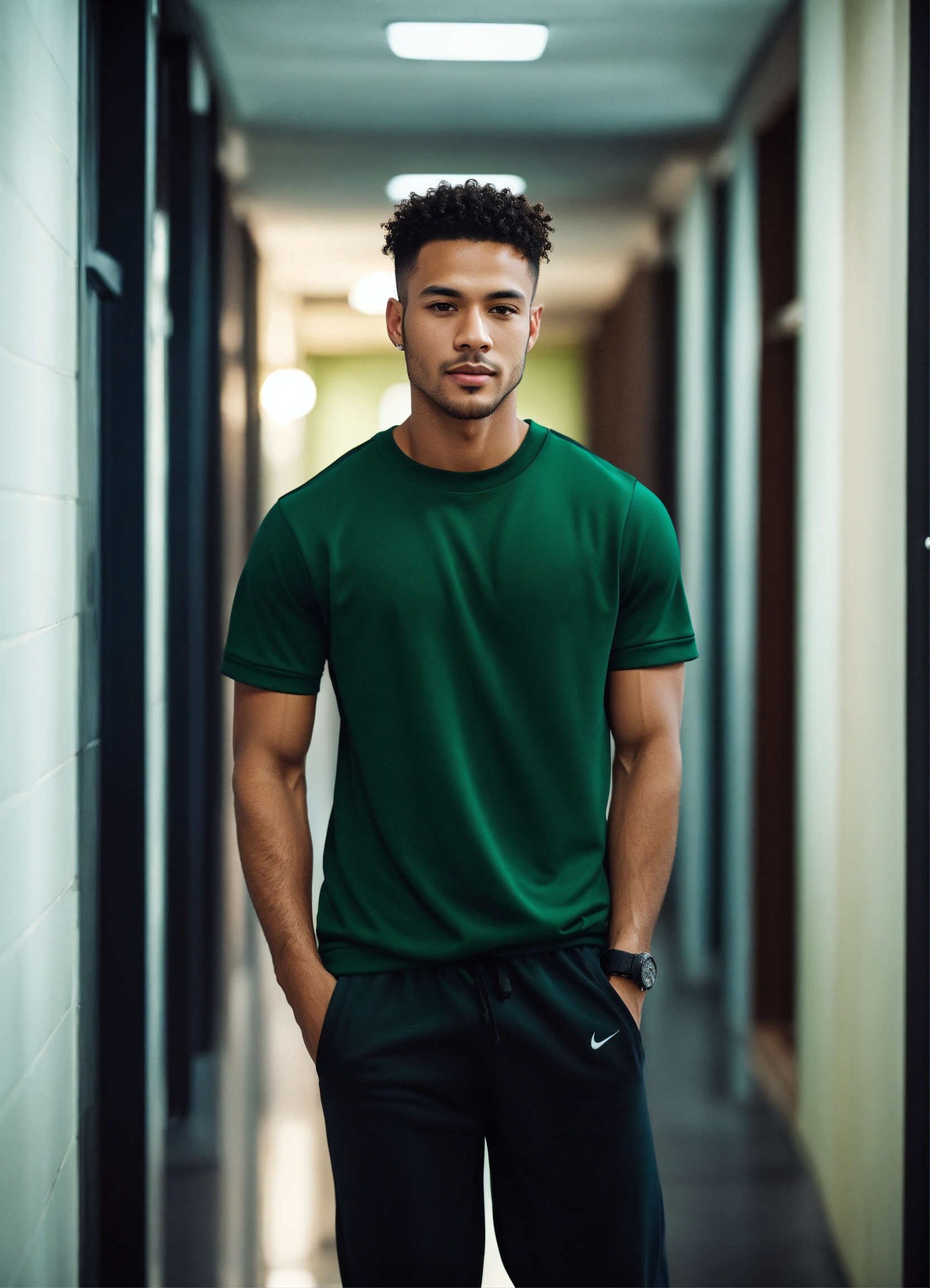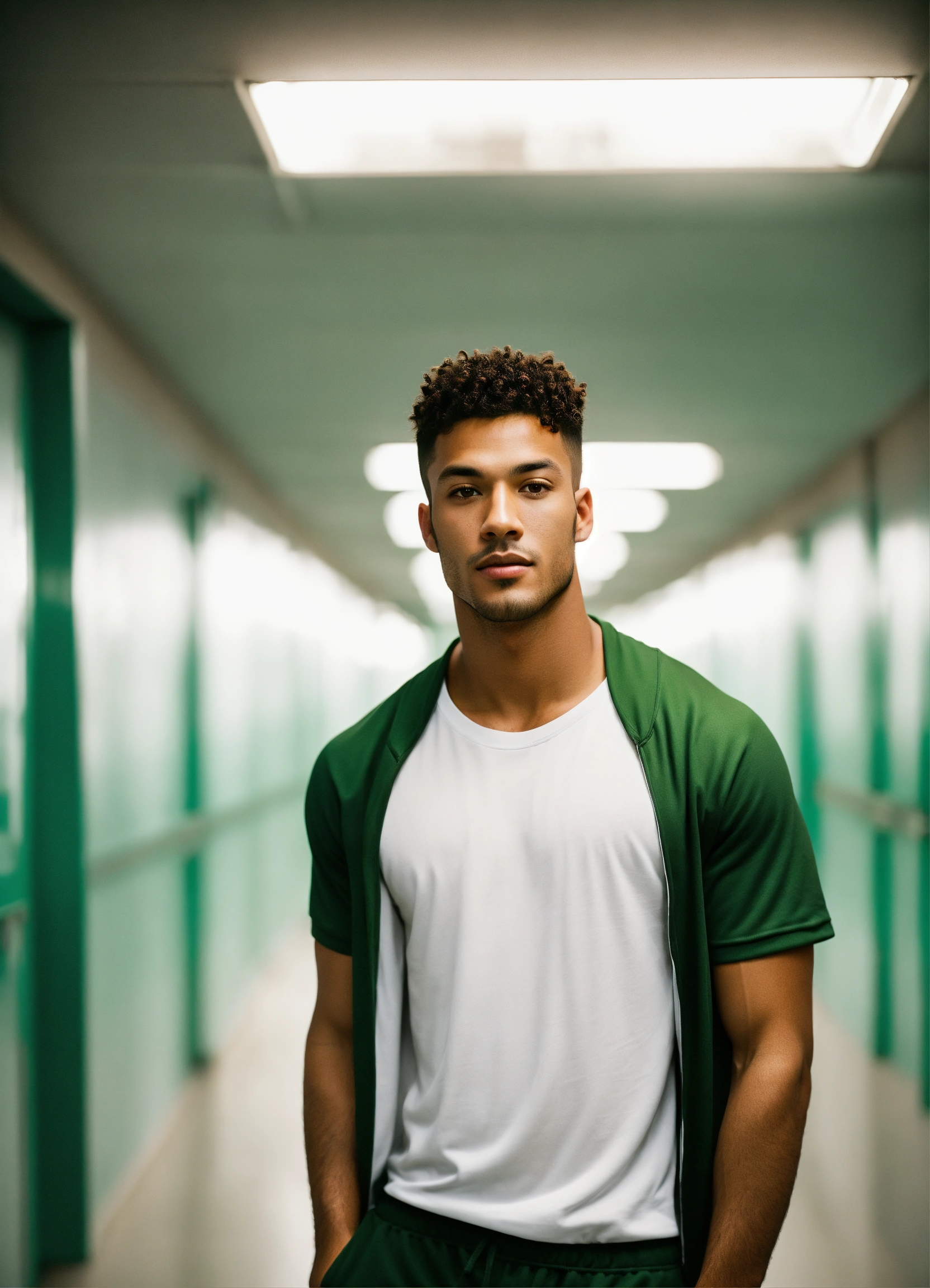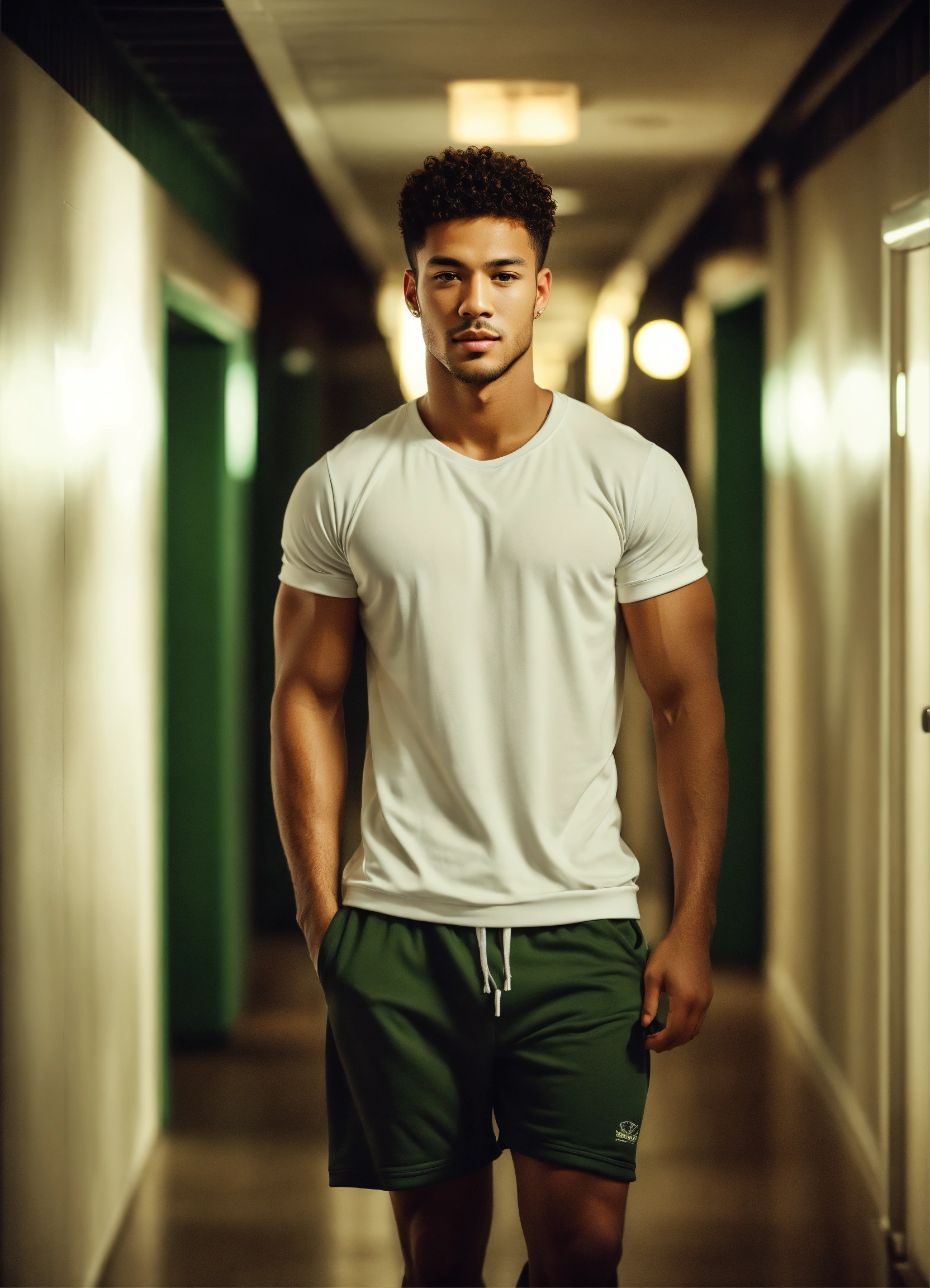 Handsome hot mulatto man with green-brown eyes, broad-shouldered, tall, in a white t-shirt and a black tracksuit in the corridor