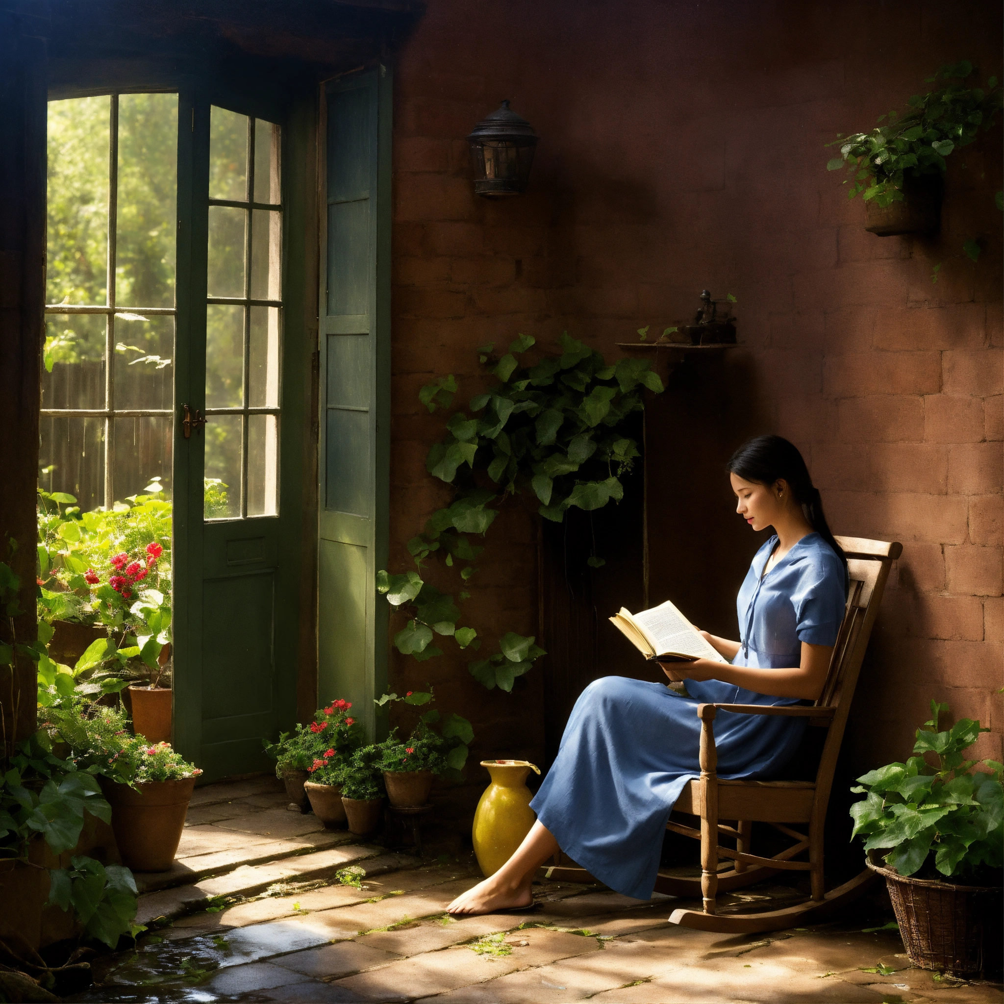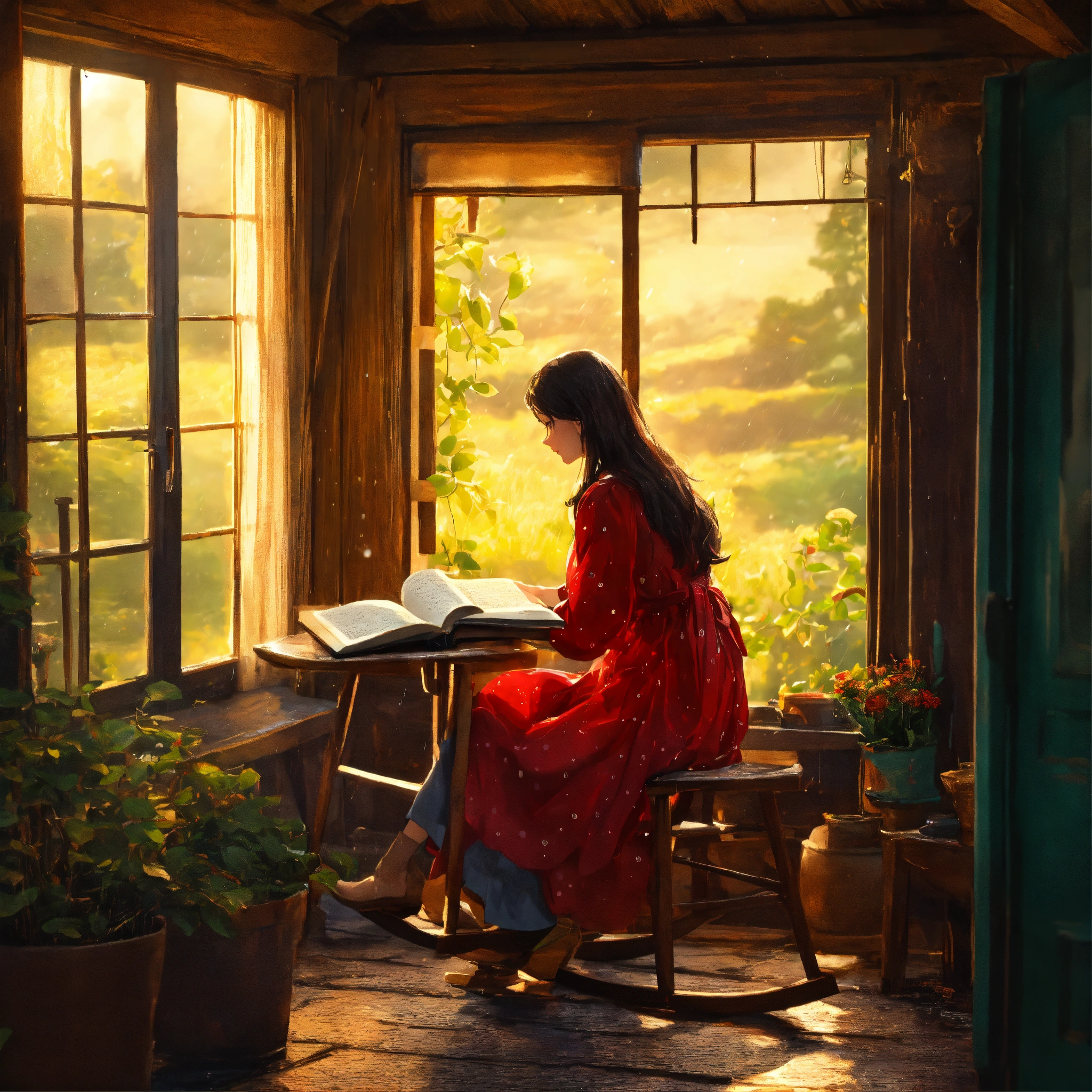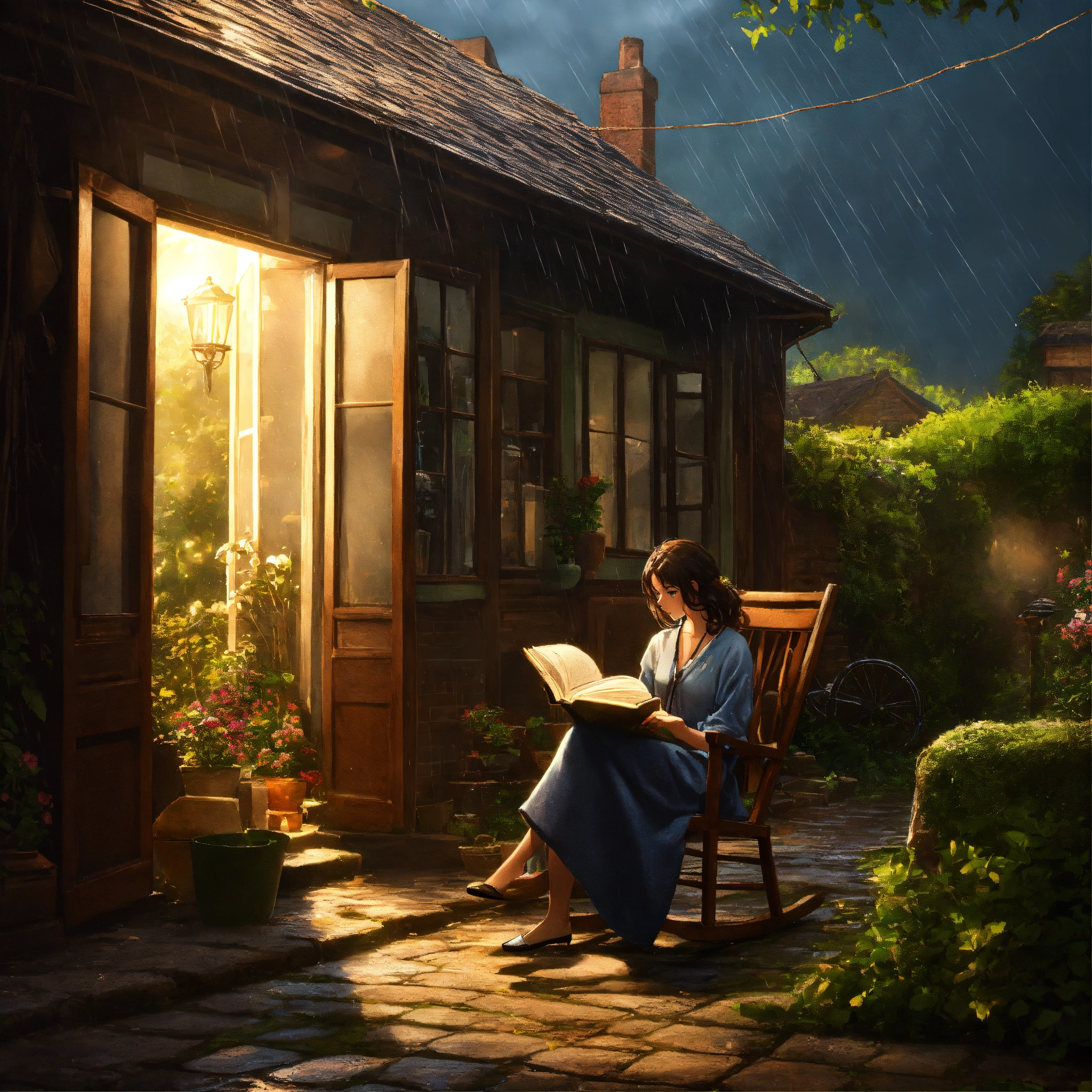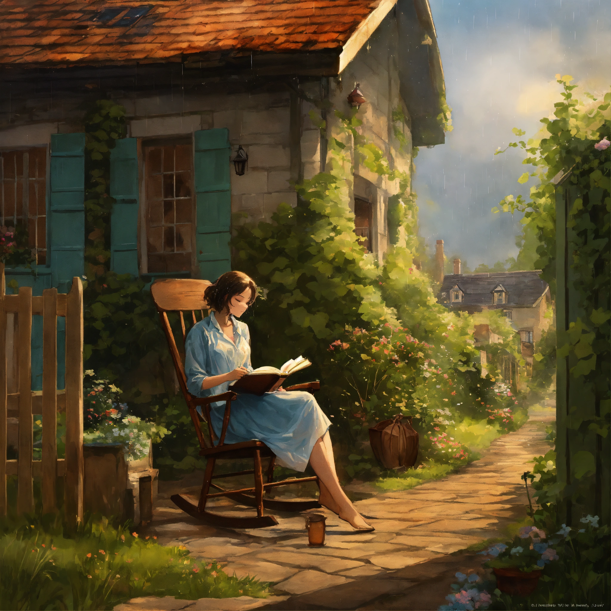Tales from the novel of a lifetime, in the morning, it's raining, a young woman holds an open book, sitting in a rocking chair in front of house in an old lane