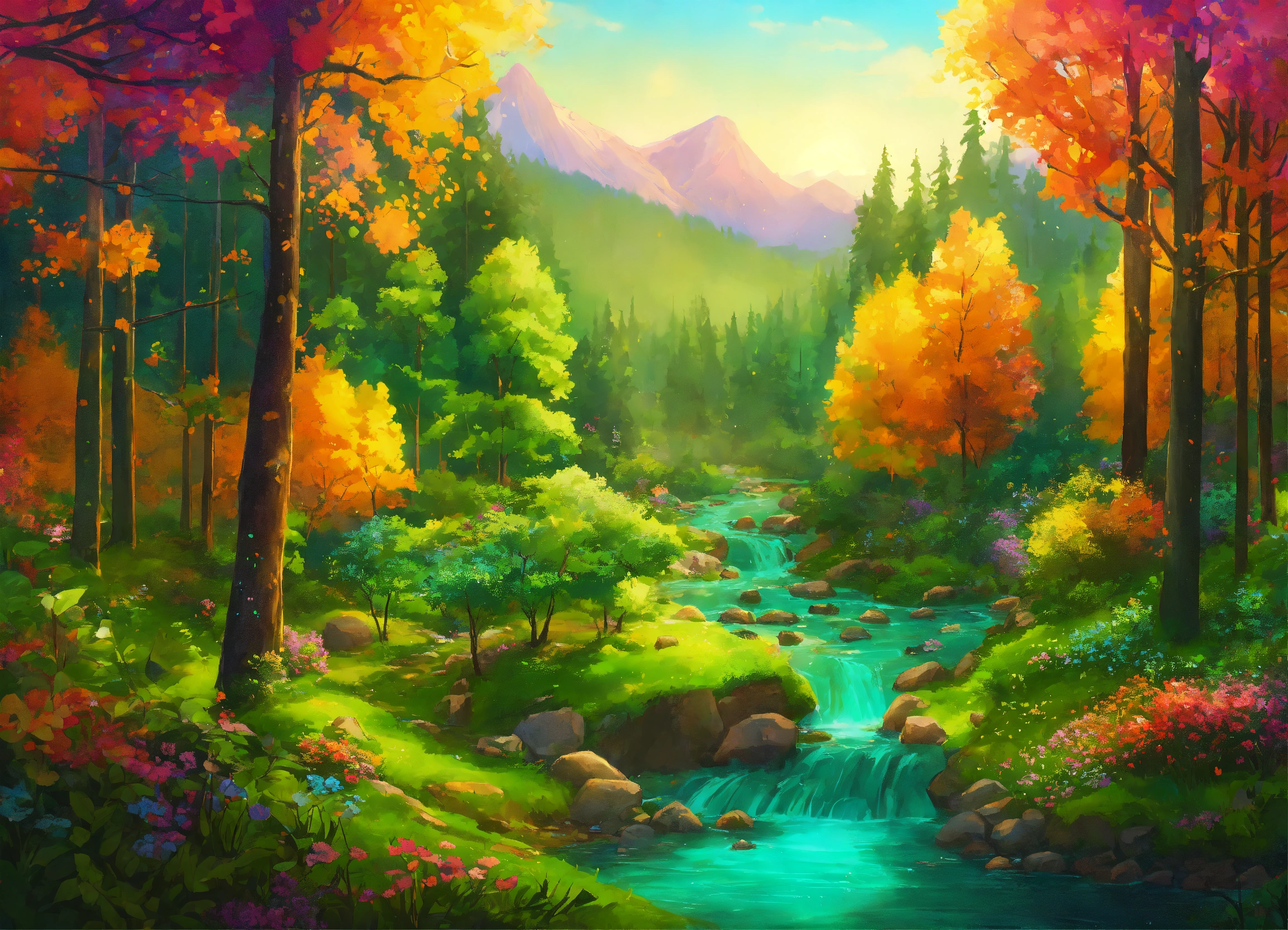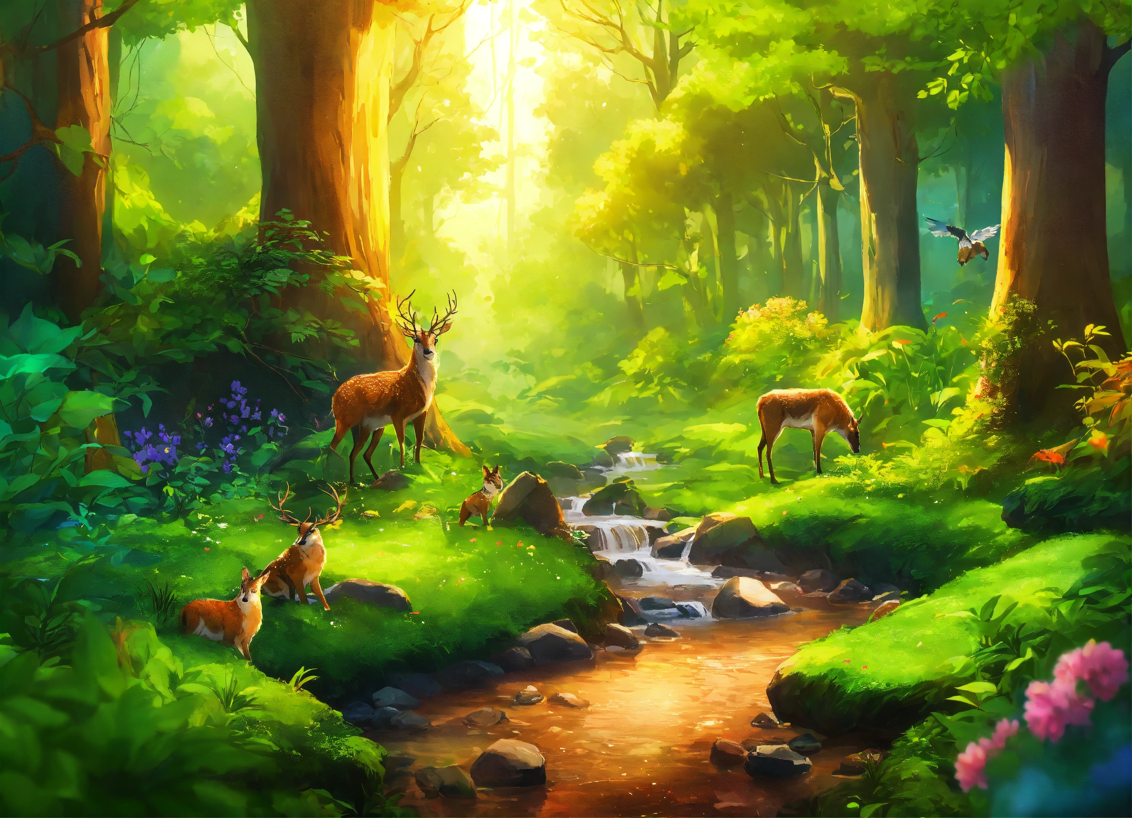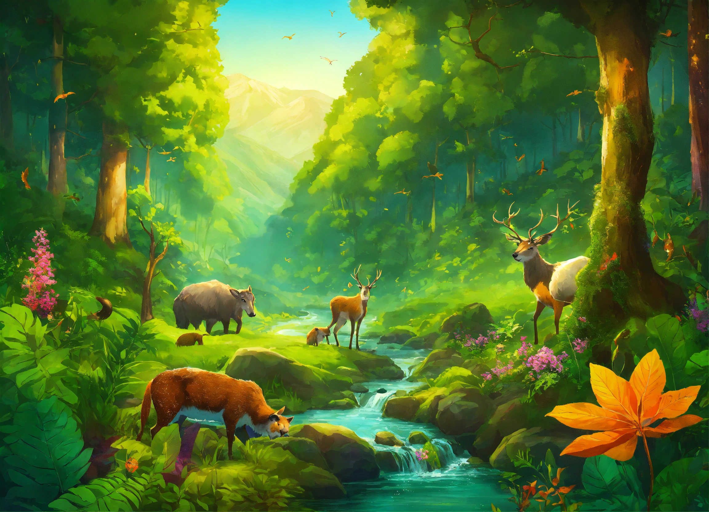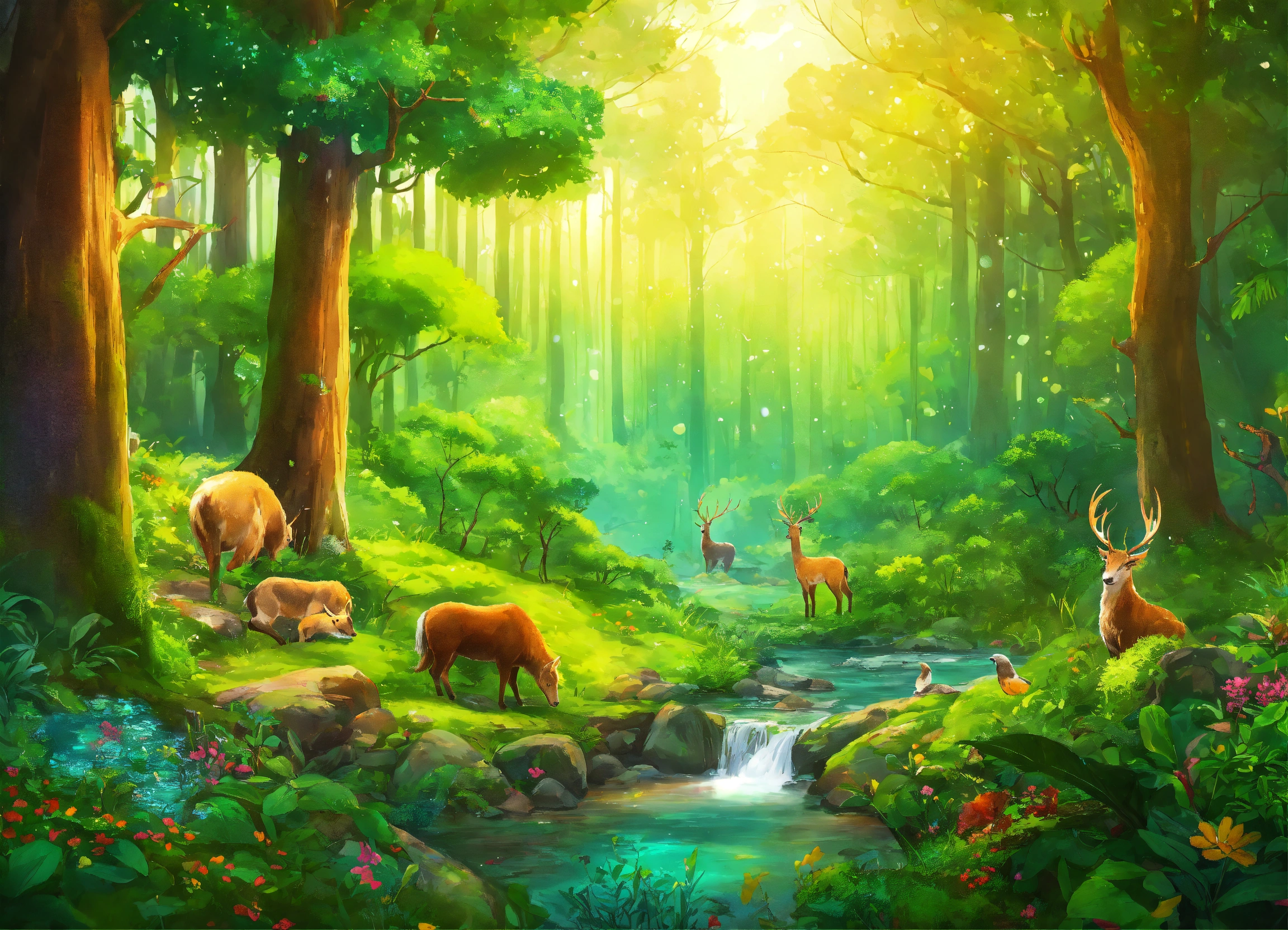 Colorful and vibrant green forest with lush trees