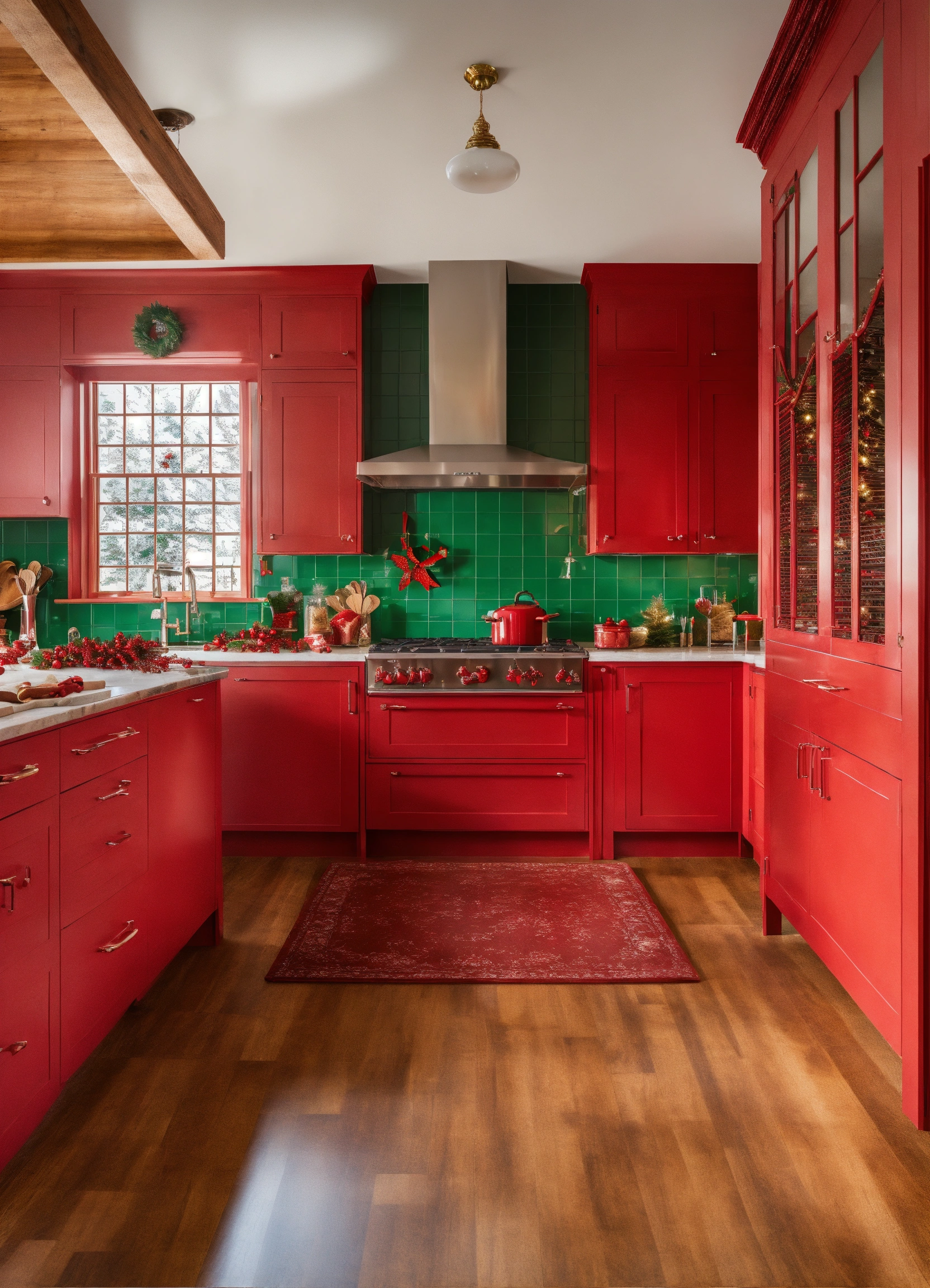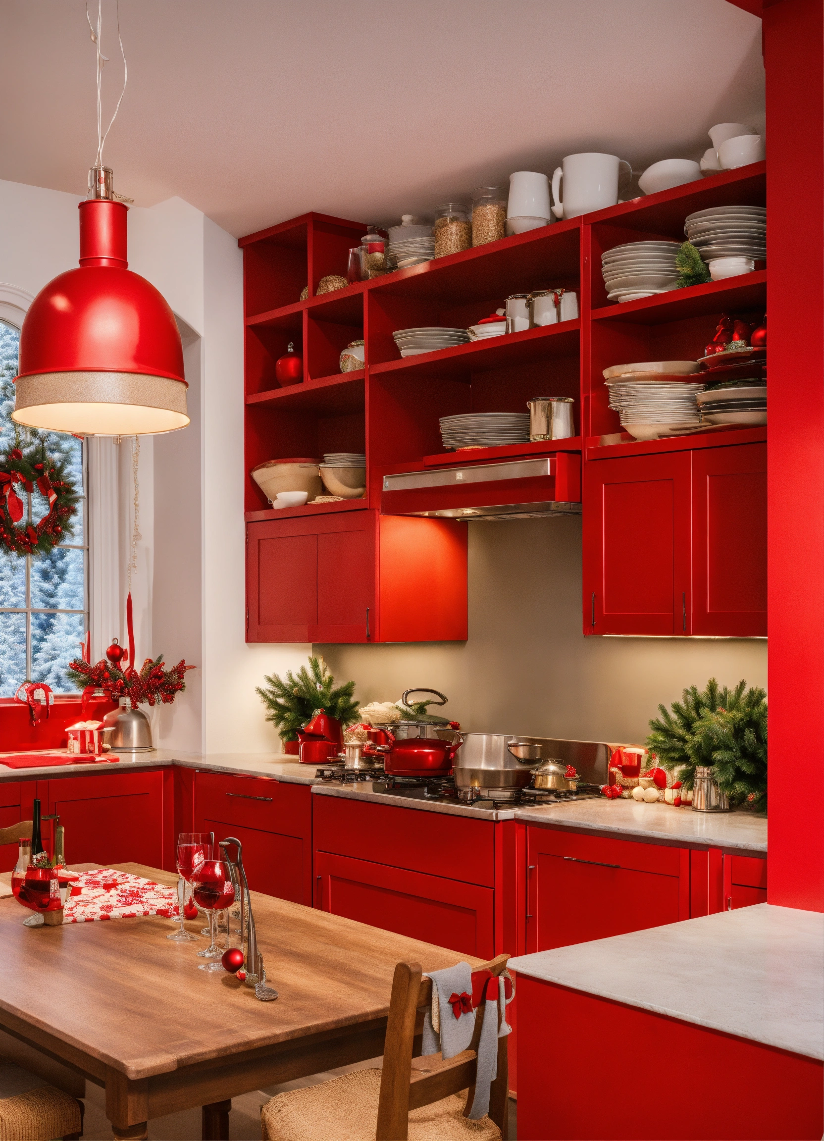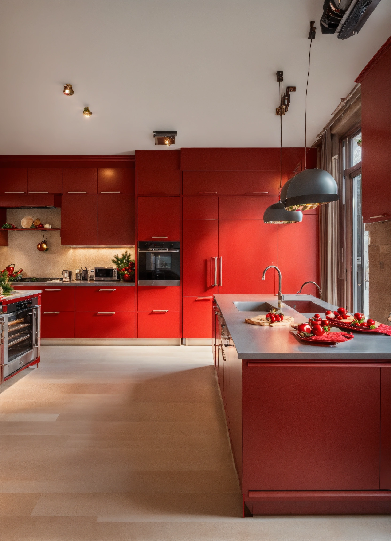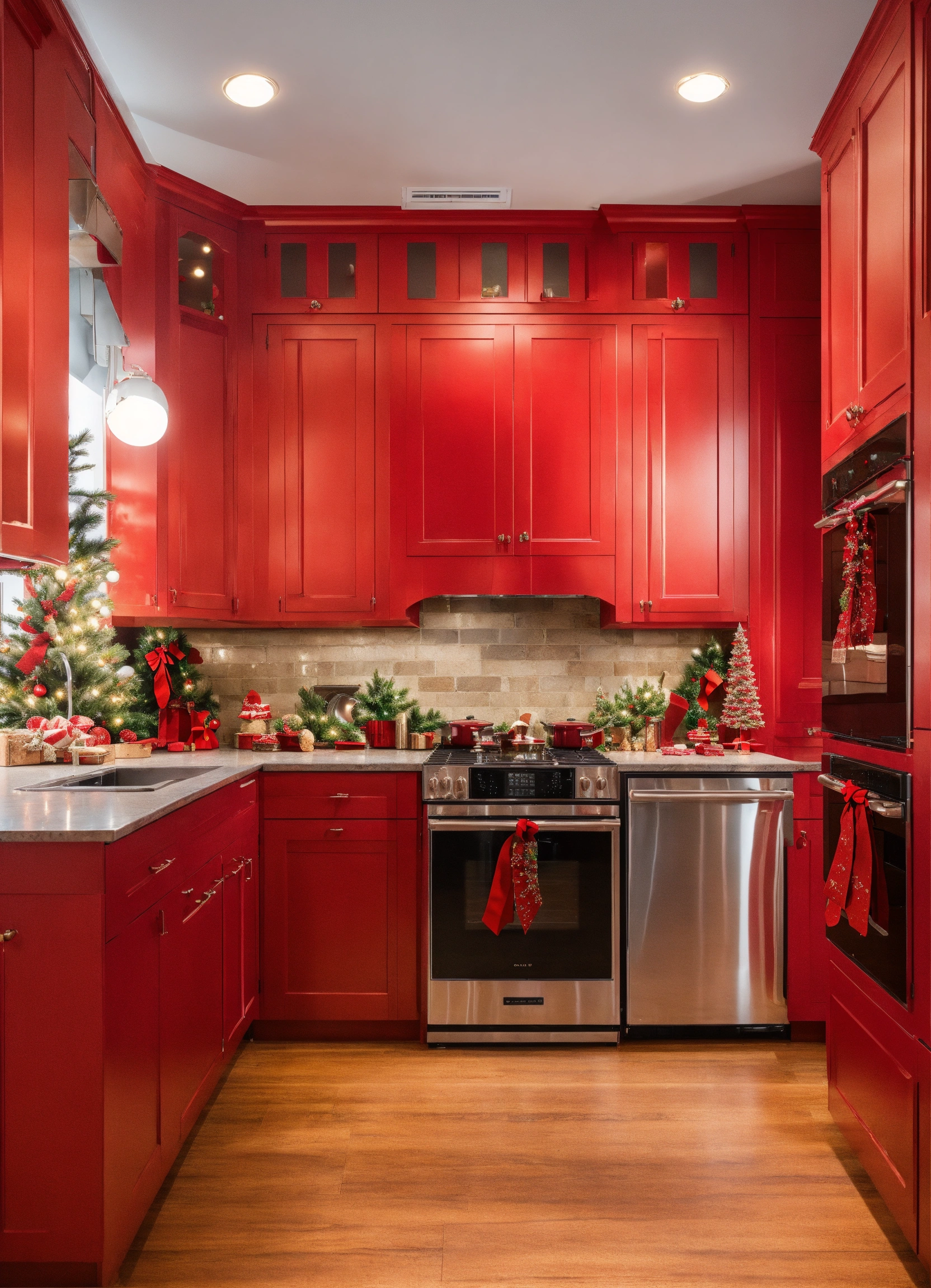 Beautiful red christmas kitchen facing facing forward with a middle island with cookie sheets, full image
