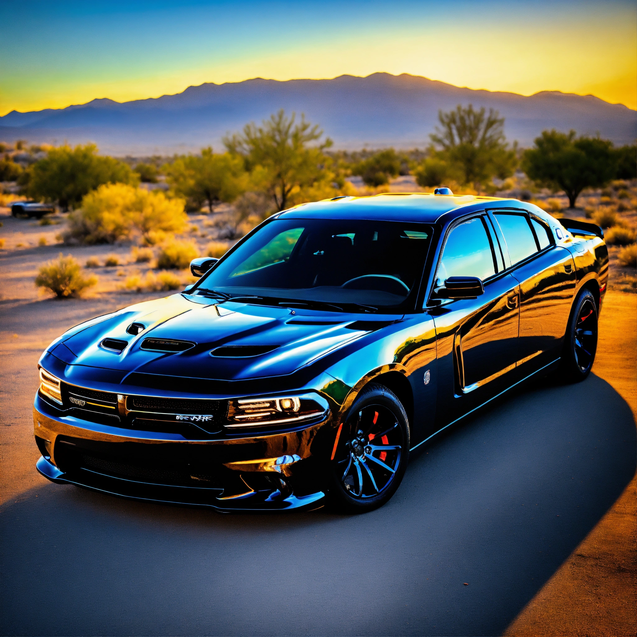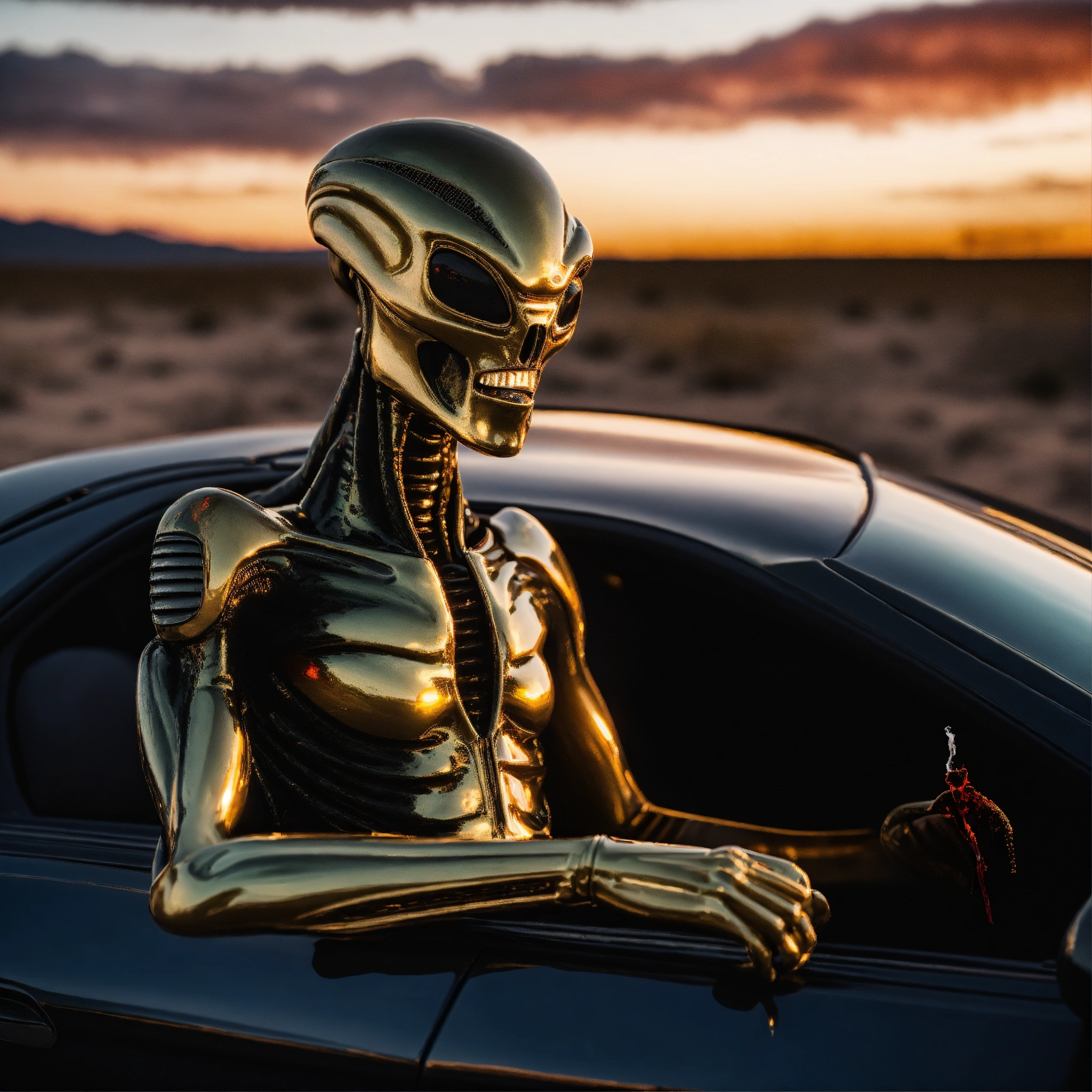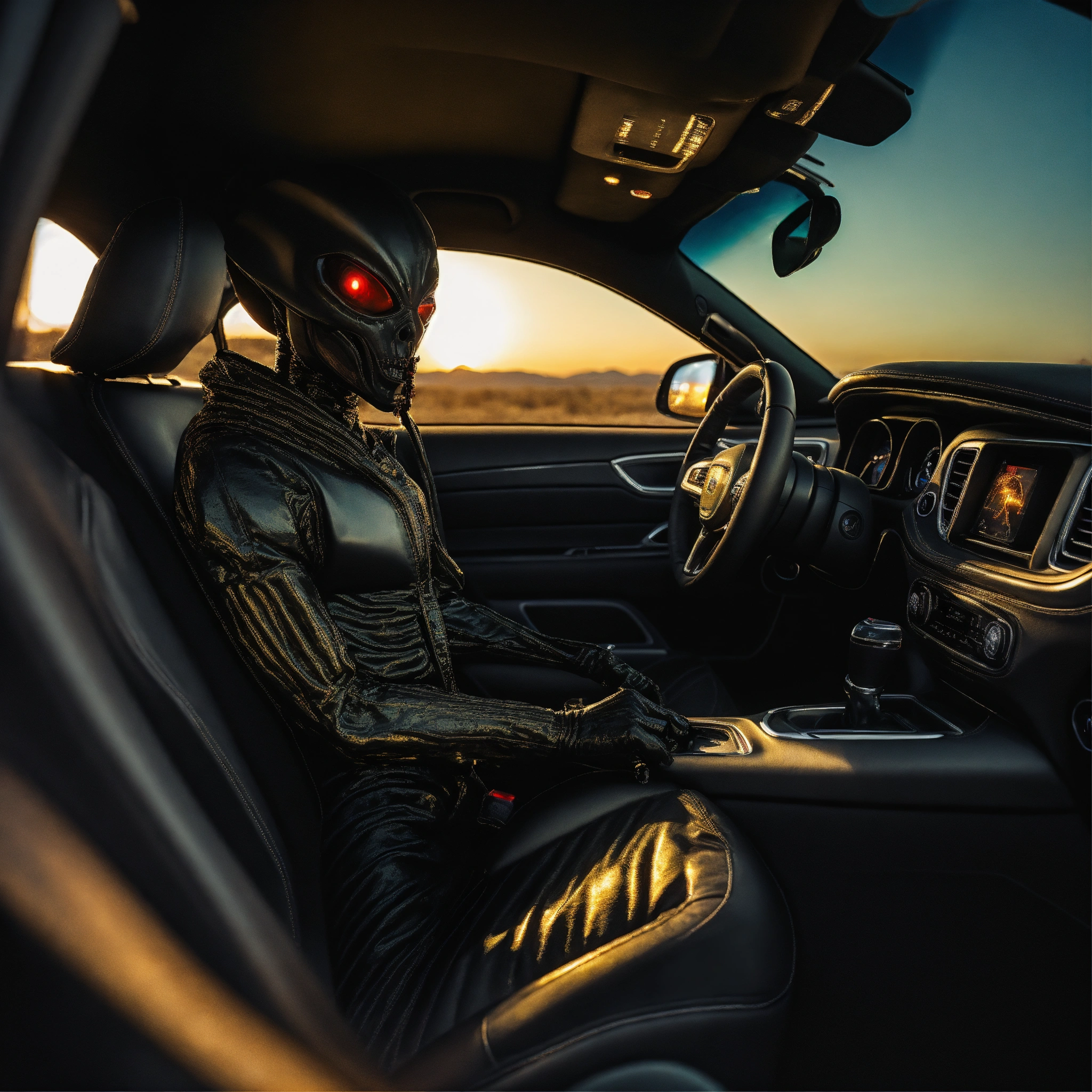 Very creepy realistic alien sitting inside black dodge charger srt, smoking a blunt, arizona, unsettling, wide angle, golden hour