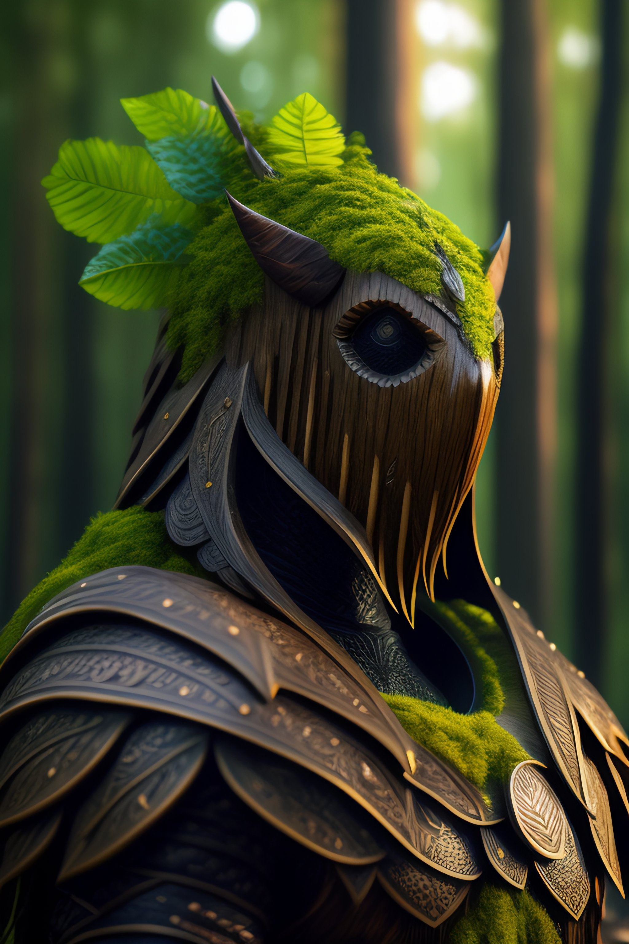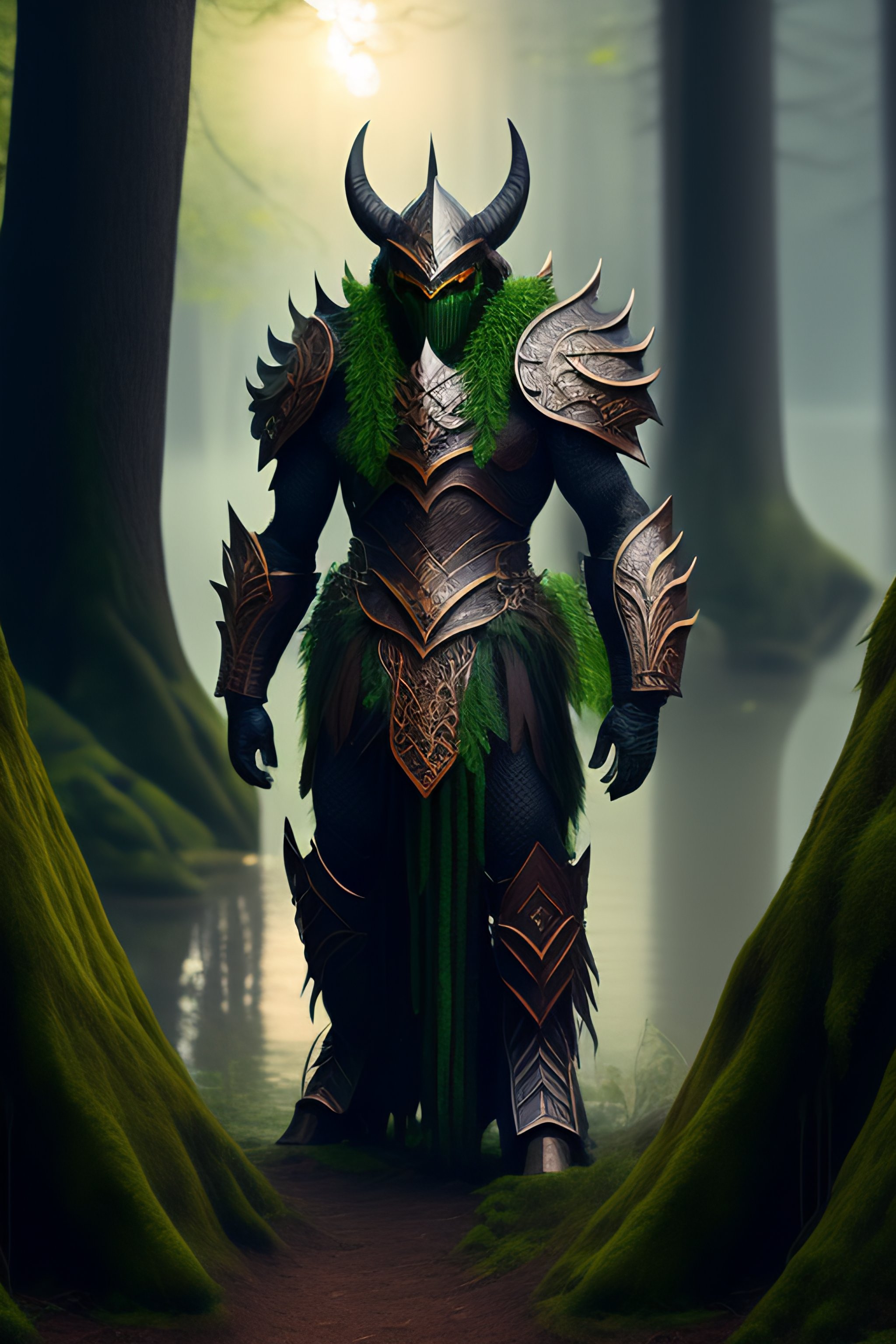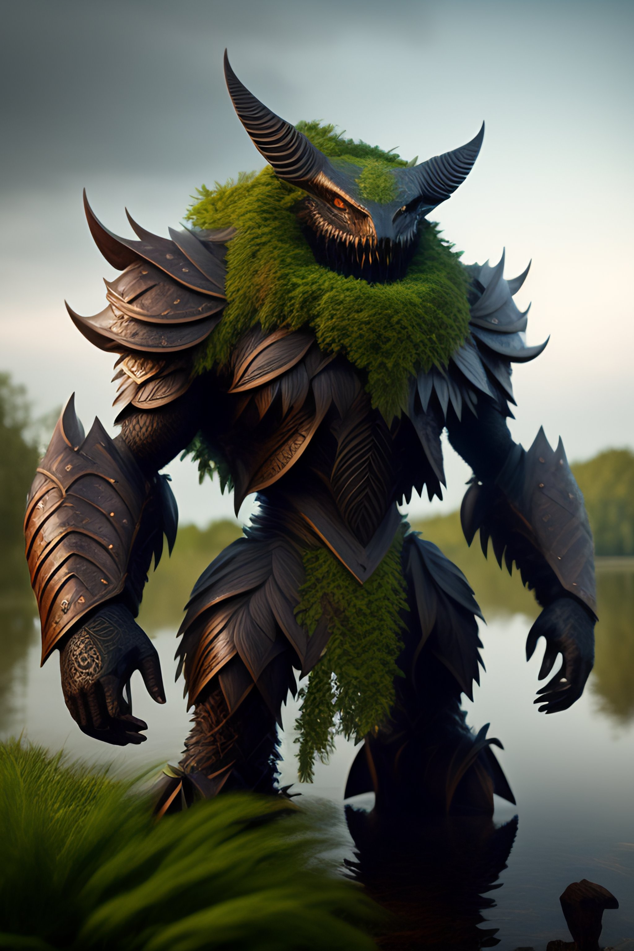 Monster of nature, armor, creature made of wood and leaves, grim, protector of the swamp, the face made of wood and magic, bright eyes, wooden mask with human characteristics, long arms and legs hiper detailed, 4k