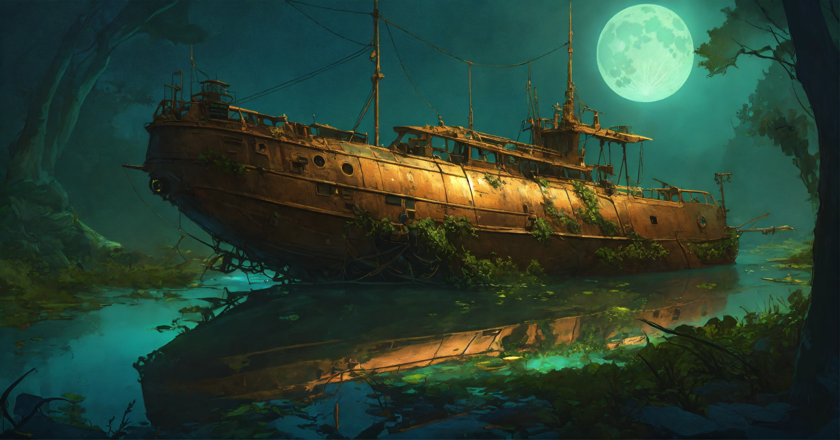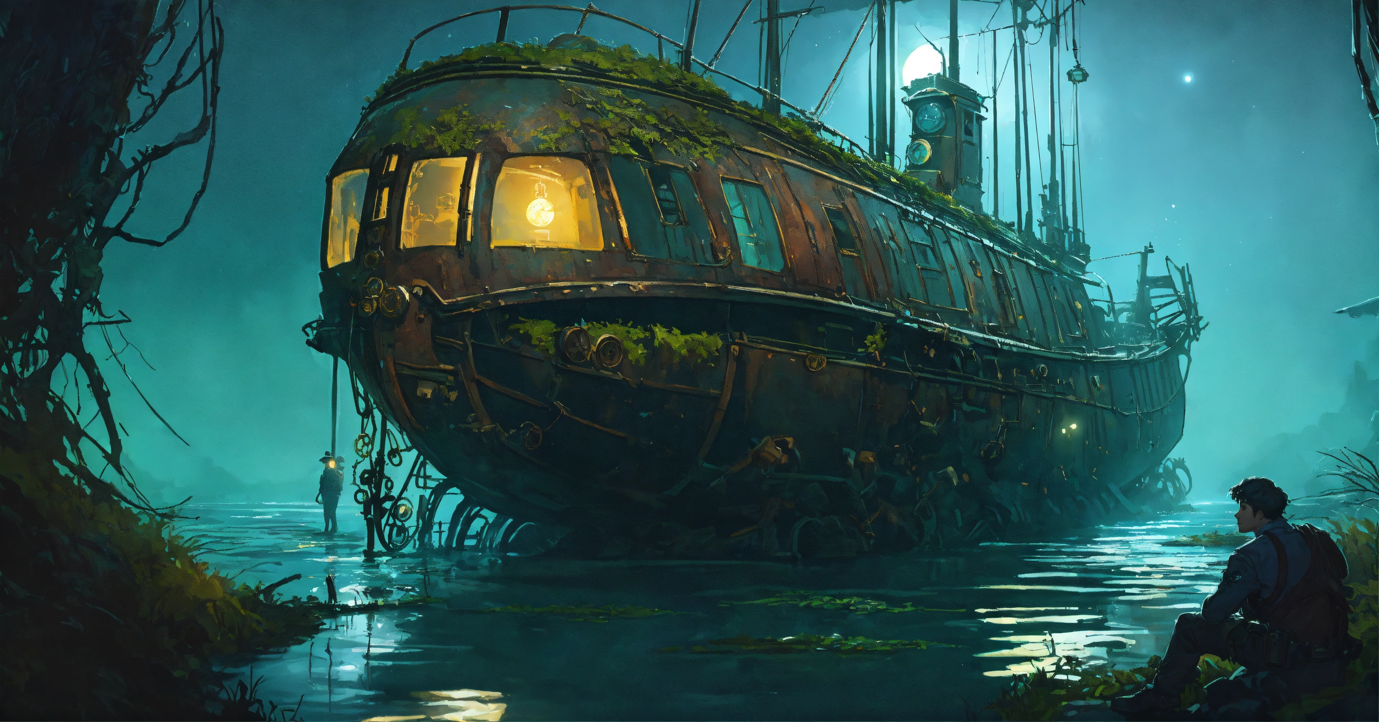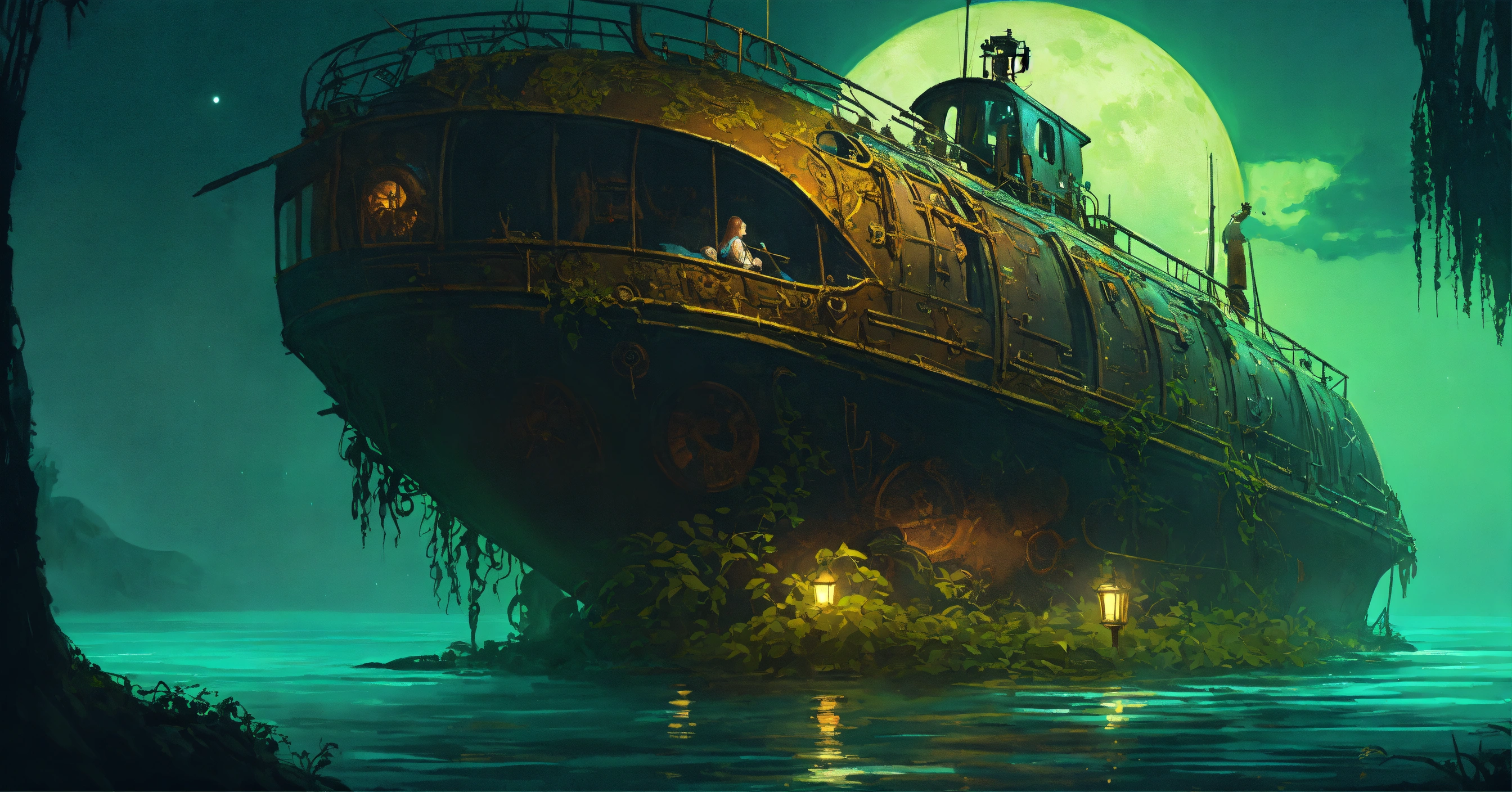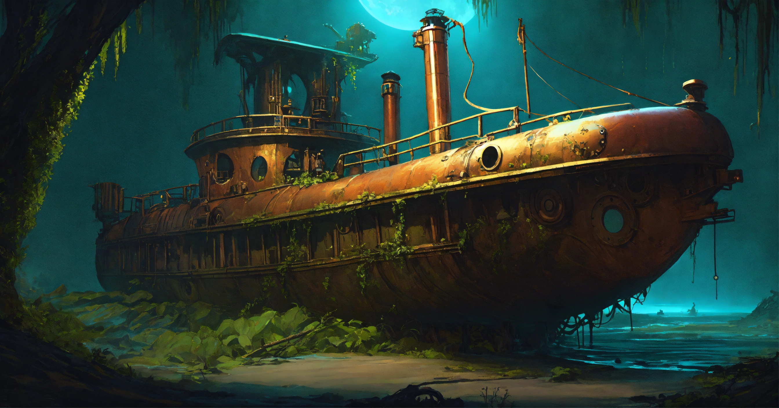 Beached heavily overgrown steampunk submersible tilted rusty shipwreck in swamp, dark atmosphere, night, moon, highly detailed, digital painting, artstation, concept art, smooth, sharp focus, illustration, art by artgerm and greg rutkowski and alphonse mucha, erte, 8 k