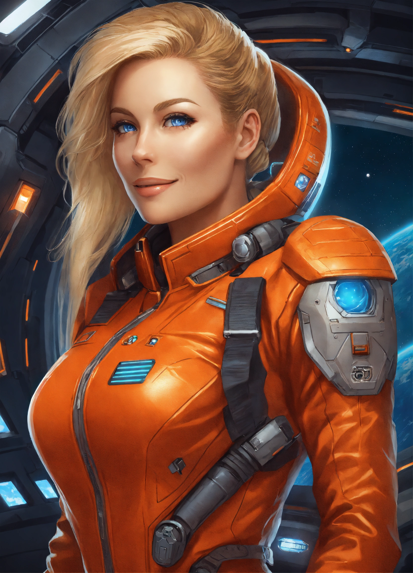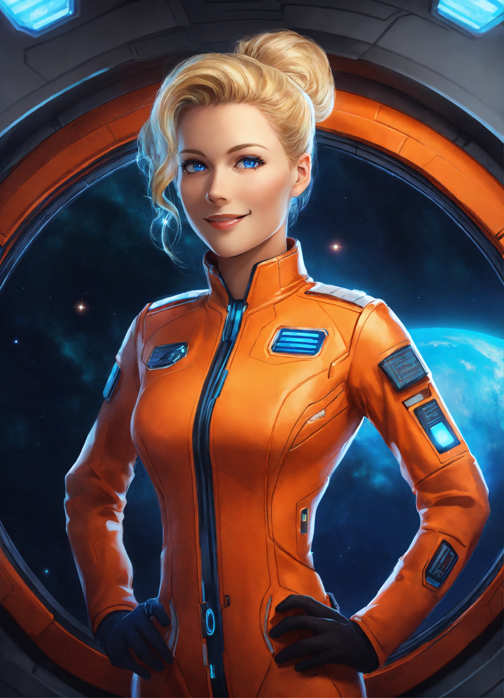 Full body of a beautiful female space captain in her mid 30s, she has blonde hair up in a medium length ponytail, she has blue eyes, she is wearing a futuristic sci-fi orange space uniform, she is facing forward smiling, she is inside her futuristic space ship
