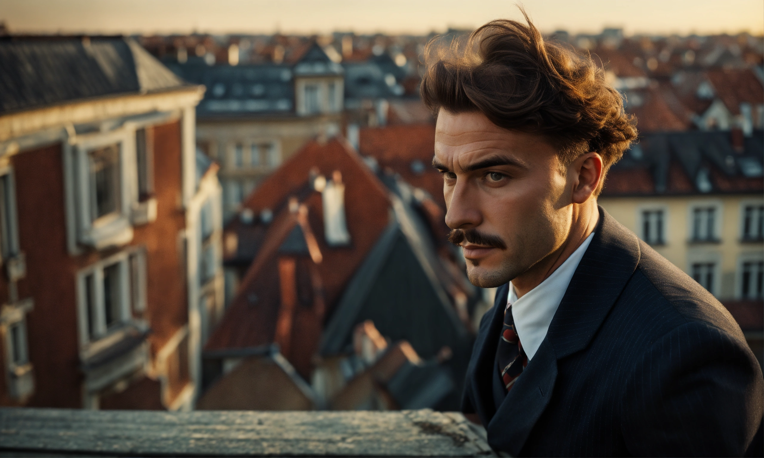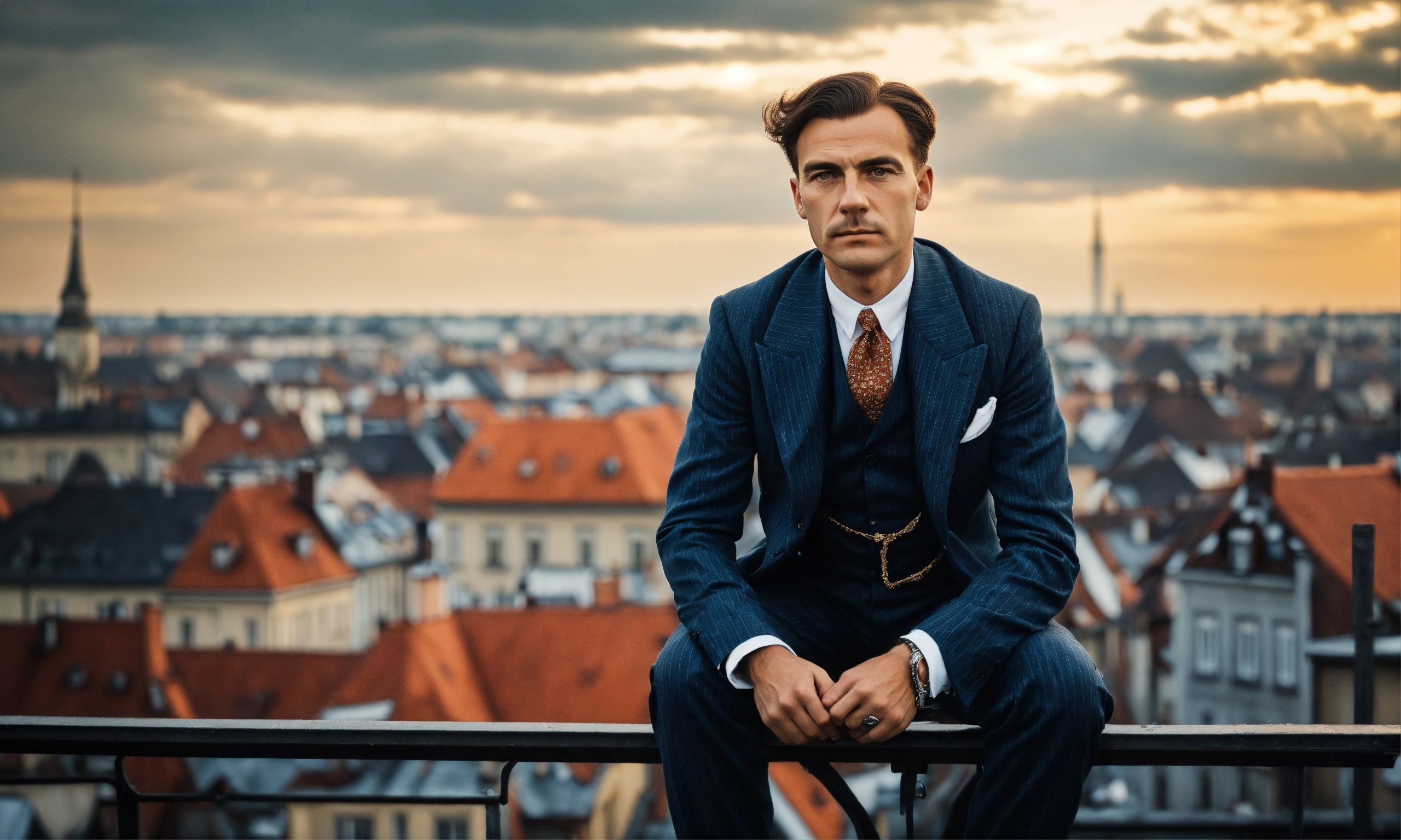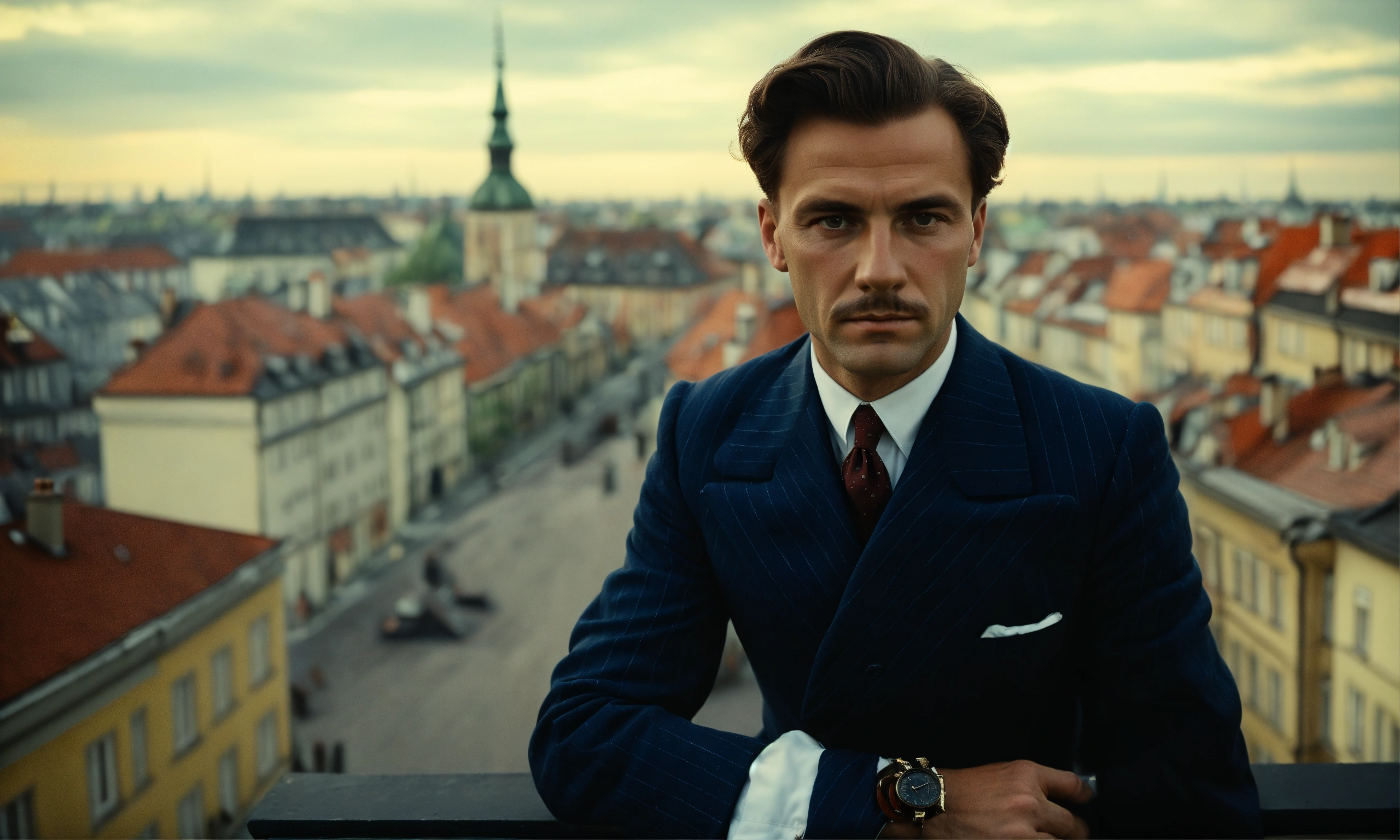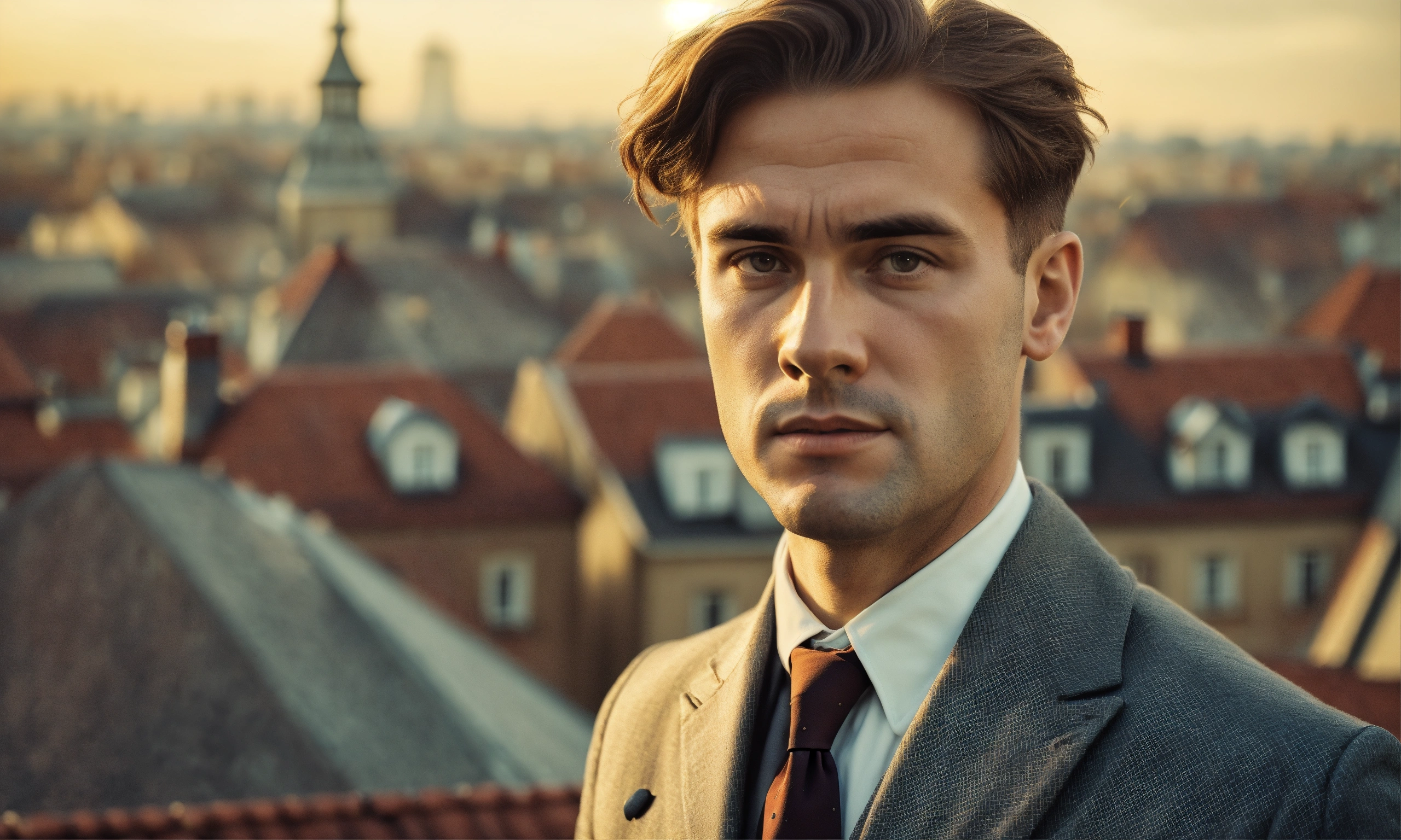 T retro man, retro warszawa 1920-1930, man, on top on the roof of houses, looks at the camera, retro style, .focus in face. classic pinstripe outfit. focus on gis face