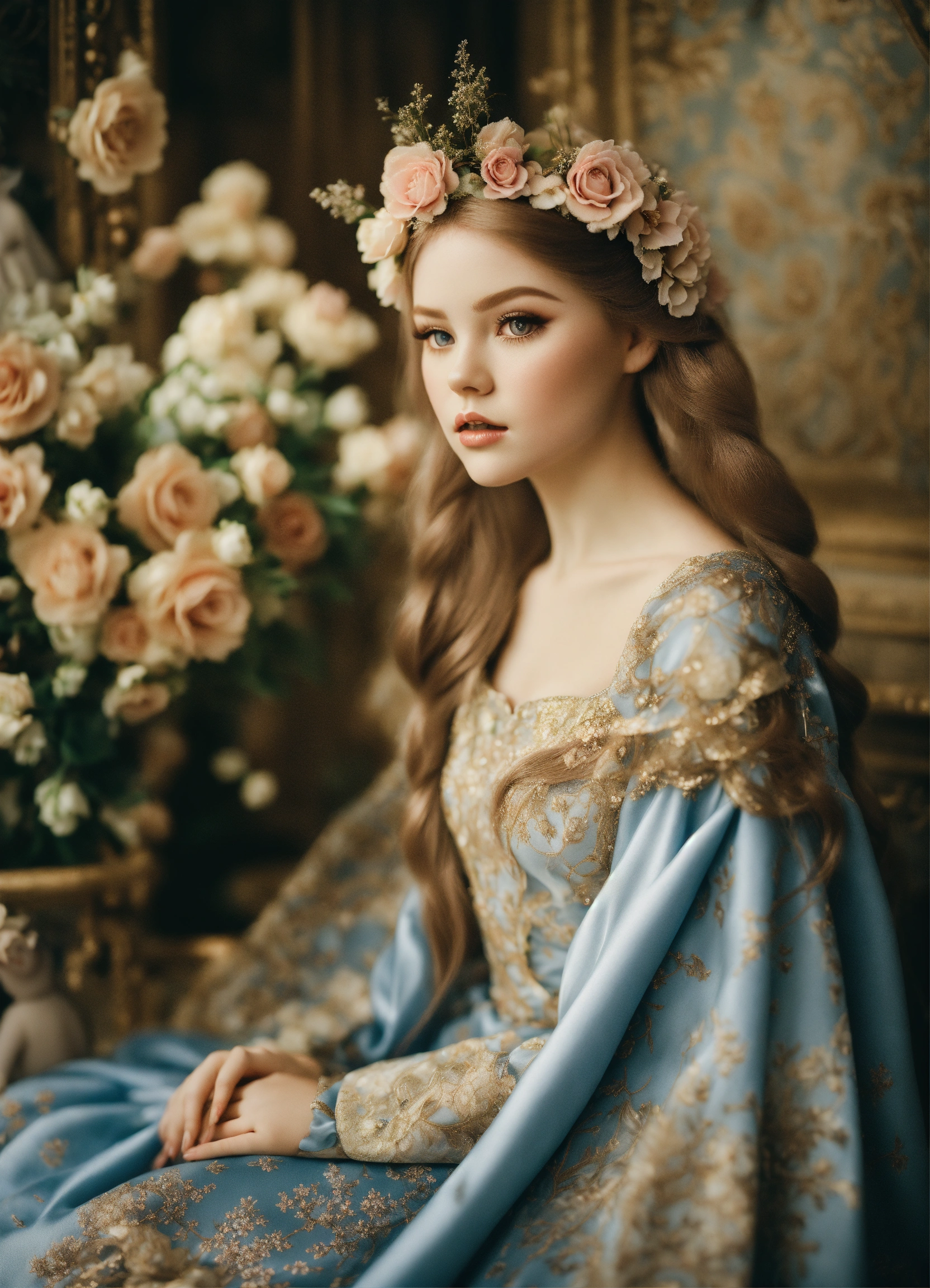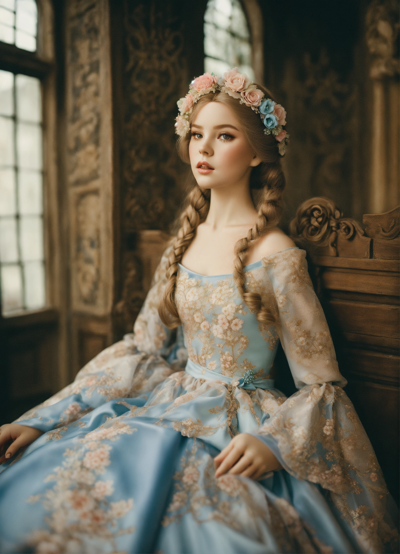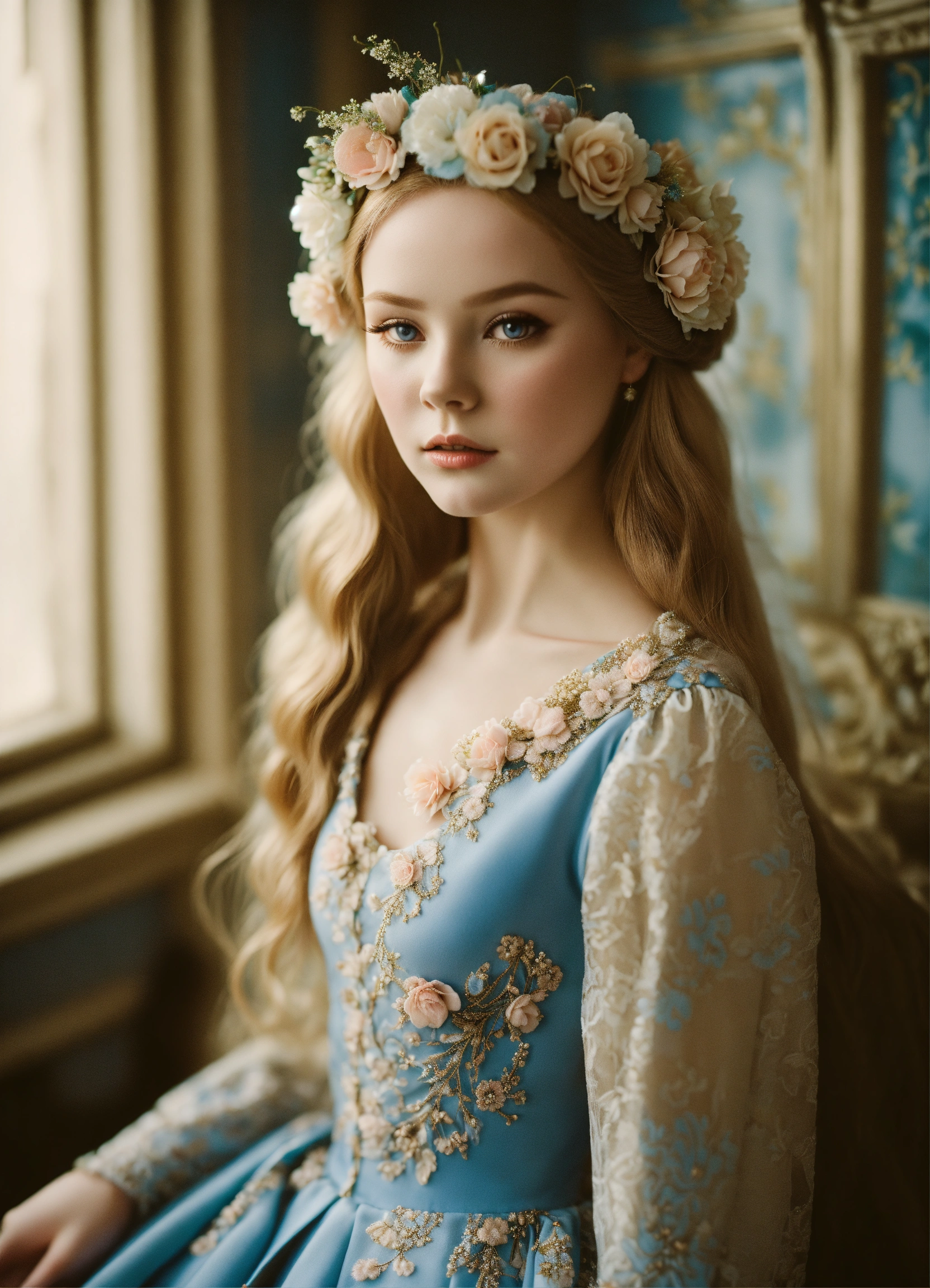 Fashion editorial. floral edition. many porcelain dolls, analog fashion portrait. portra 400 high dpi scan. beautiful russian young as princess aurora sepia pastel colors, blue dress long sleeve medieval bride long tail