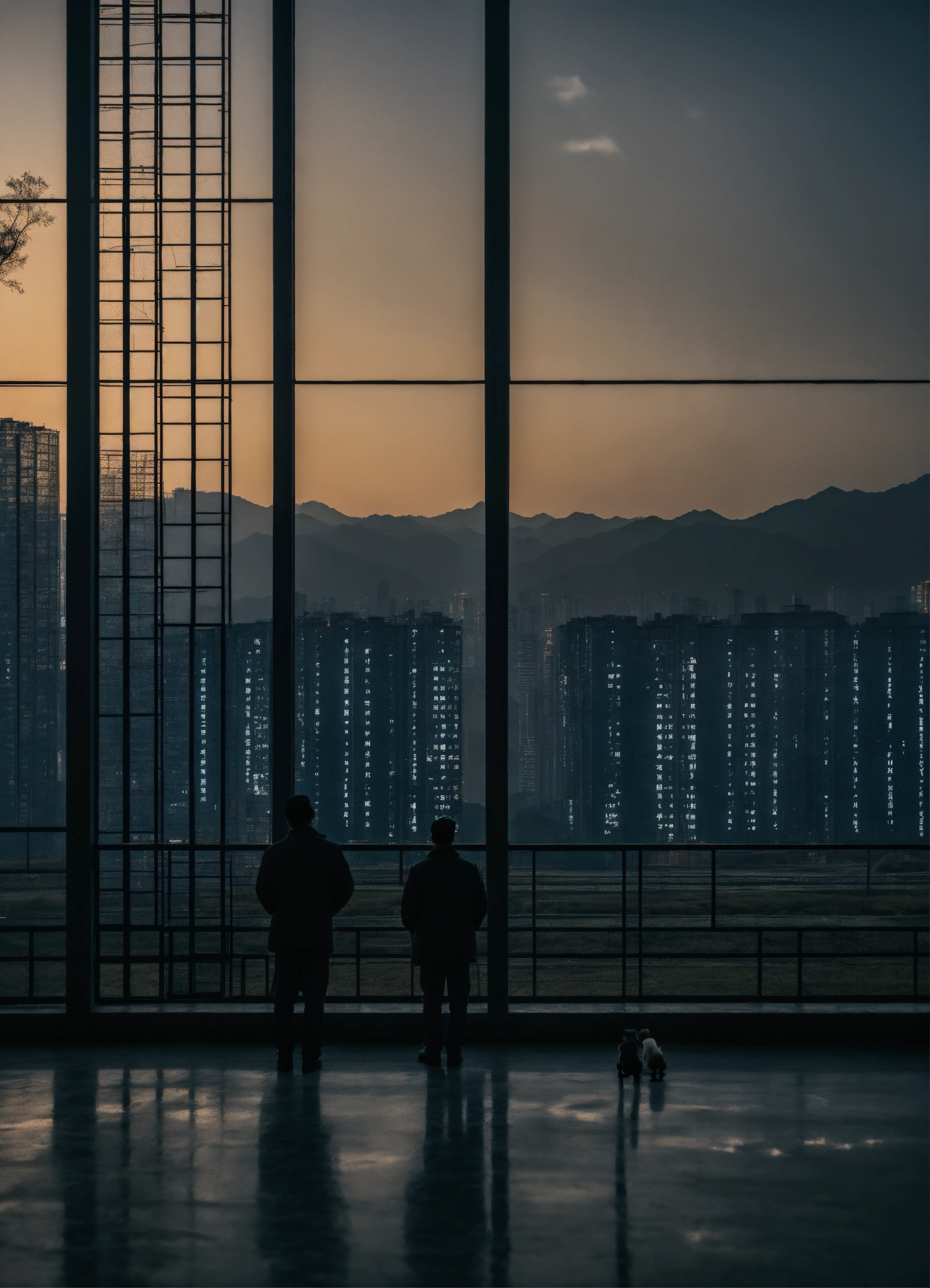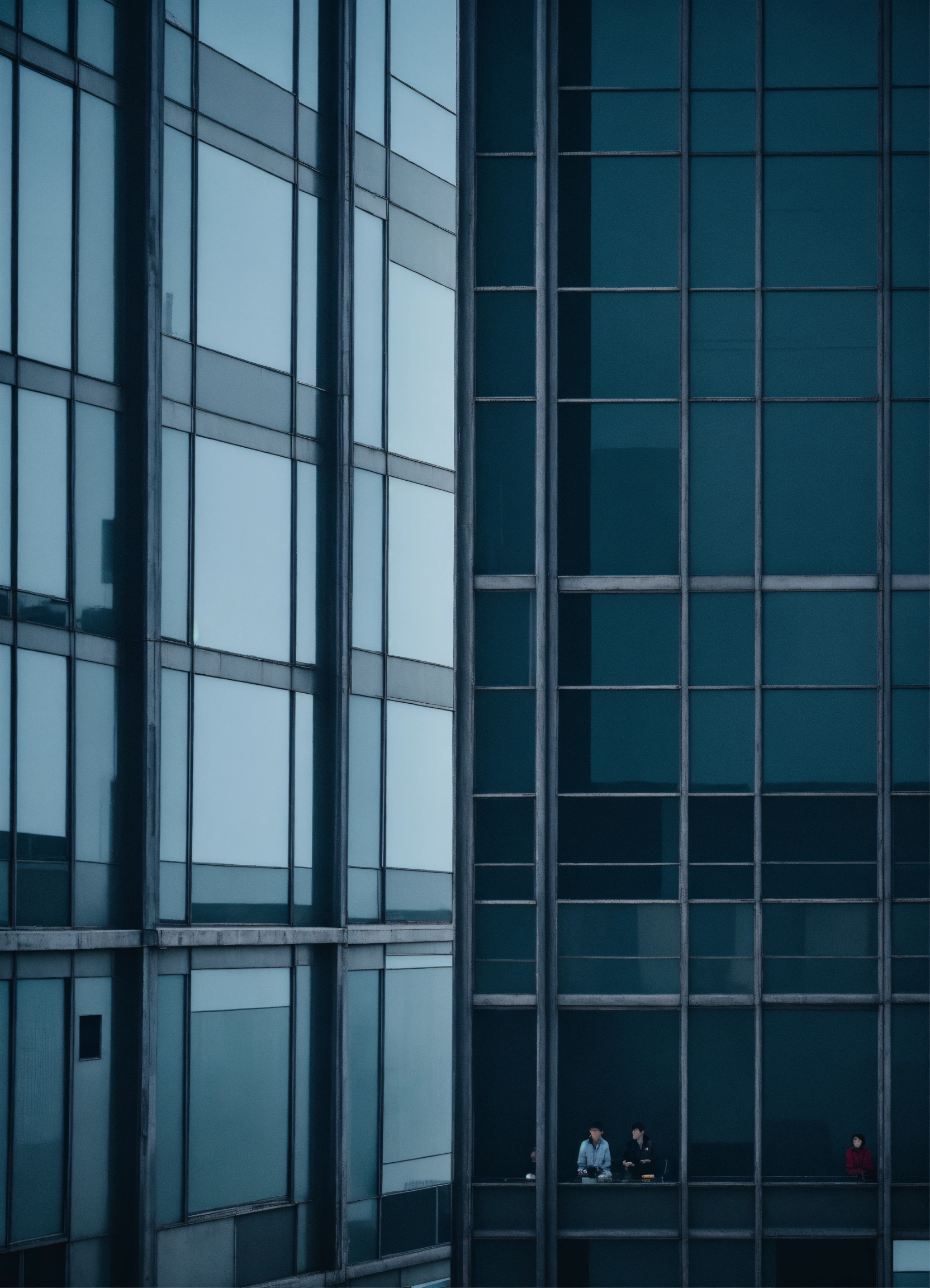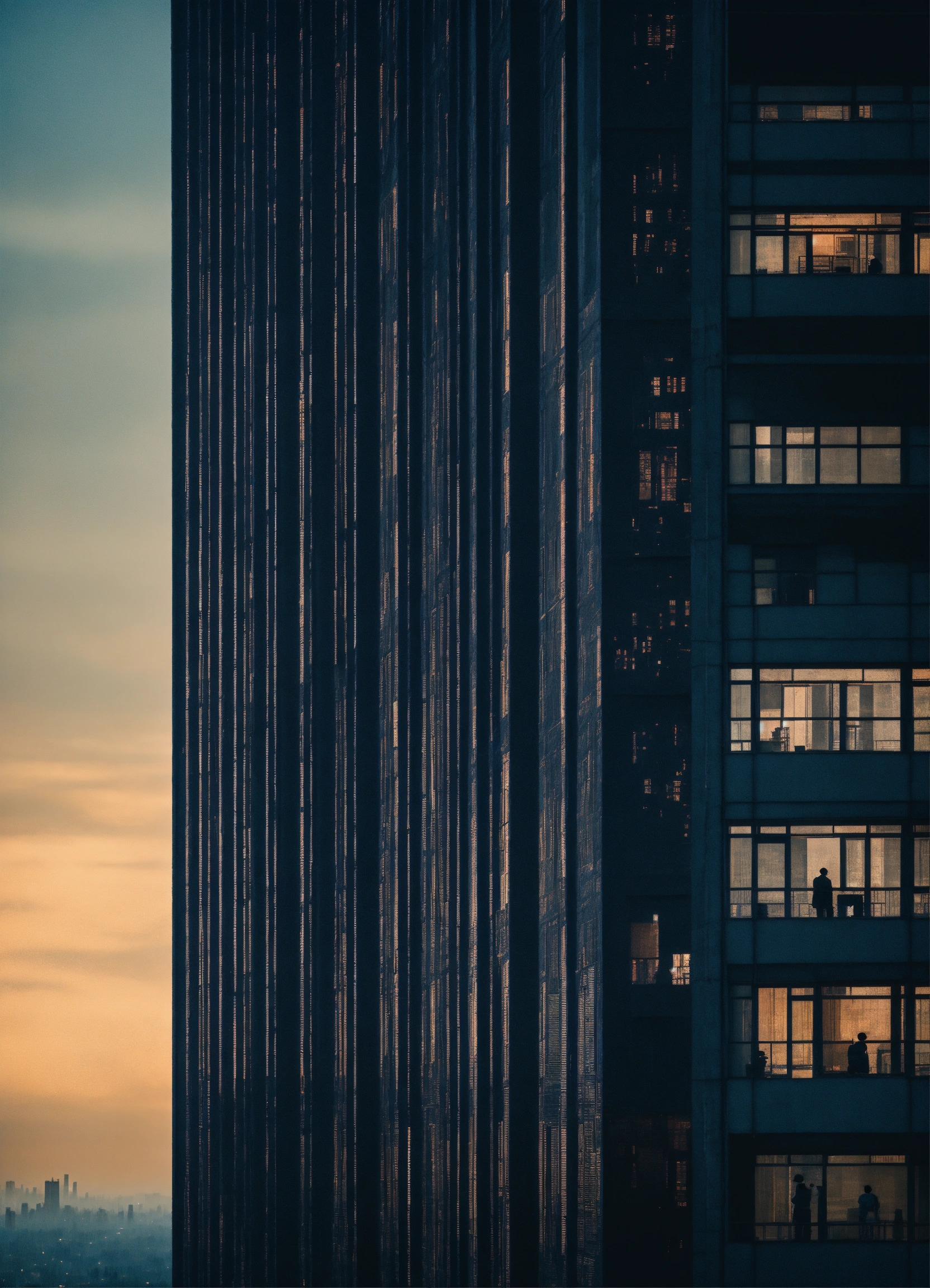 Isolated humans look over tall building windows, in the style of dark hues, rural china, coded patterns, sparse and simple, uhd image, urbancore, sovietwave, vastness of space, negative space, award-winning design, leica