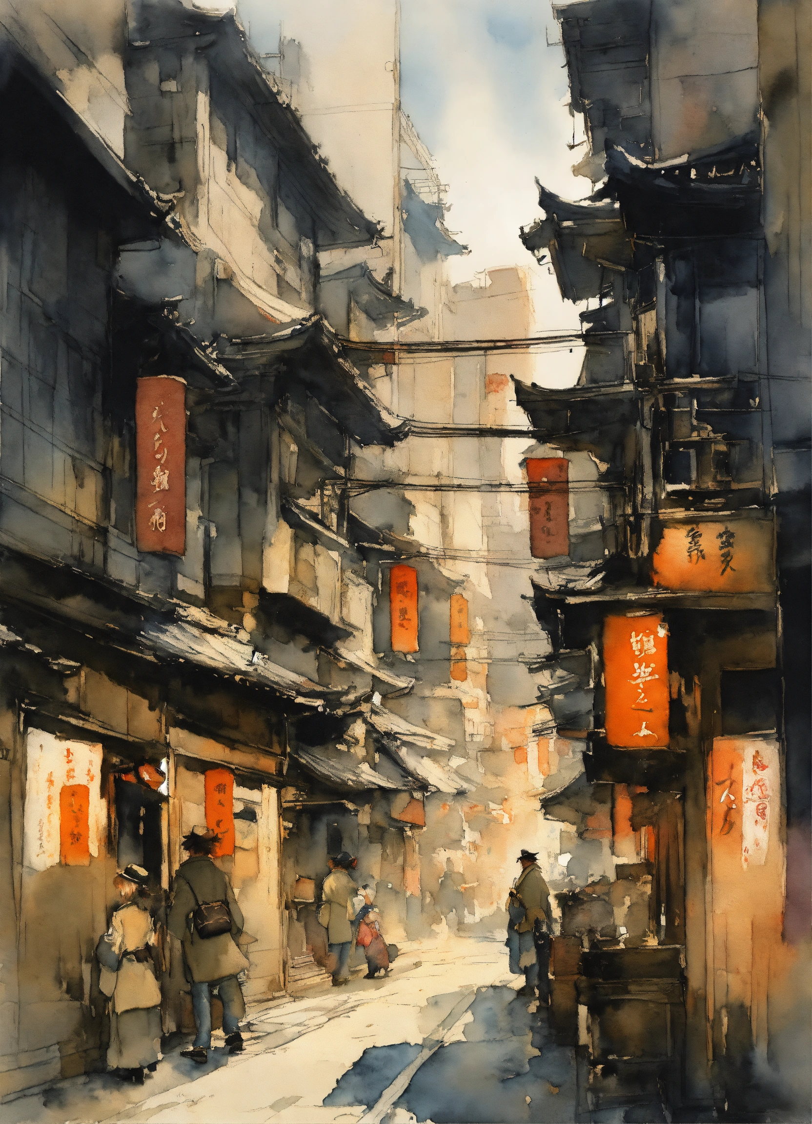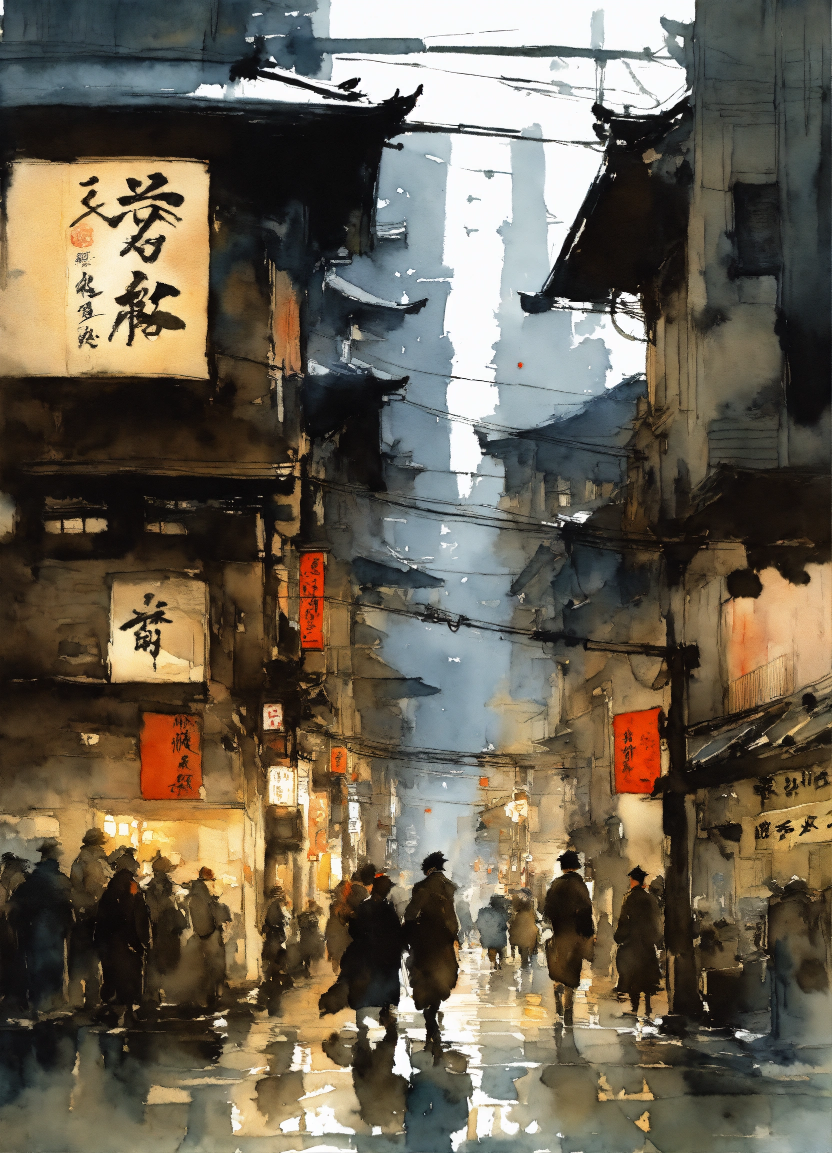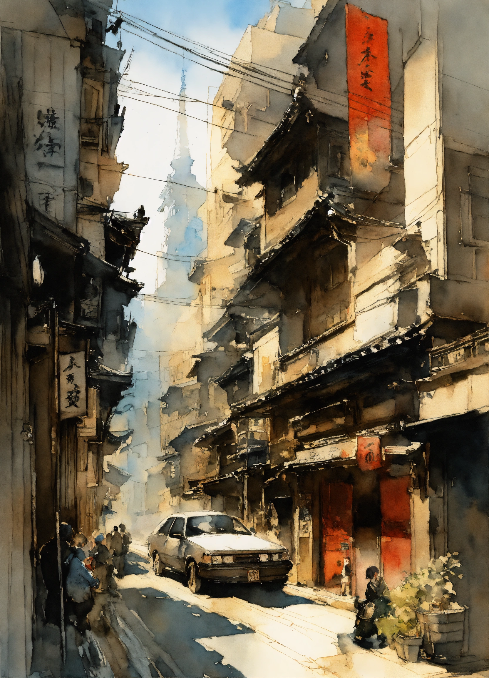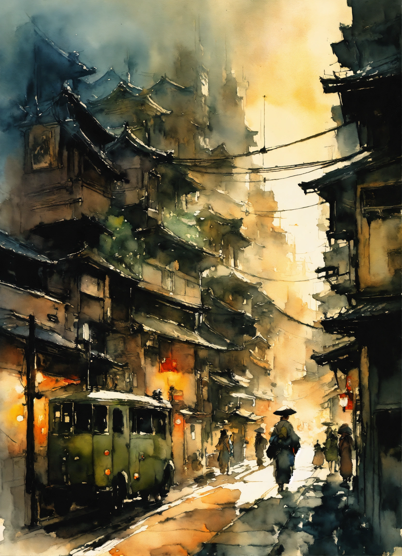 Japanese city scape yoji shinkawa style, jean-baptiste monge, general plan, central composition, expressive painting, watercolor, bold brushstrokes, concept art, shadow lighting, stylize, intricate detail, 8k