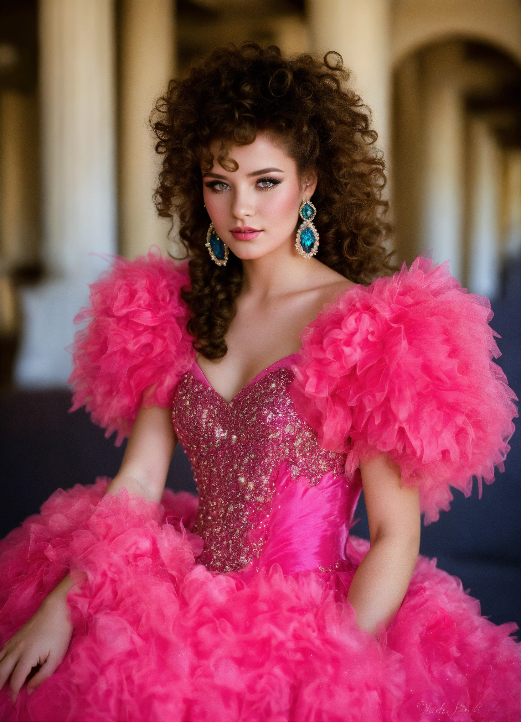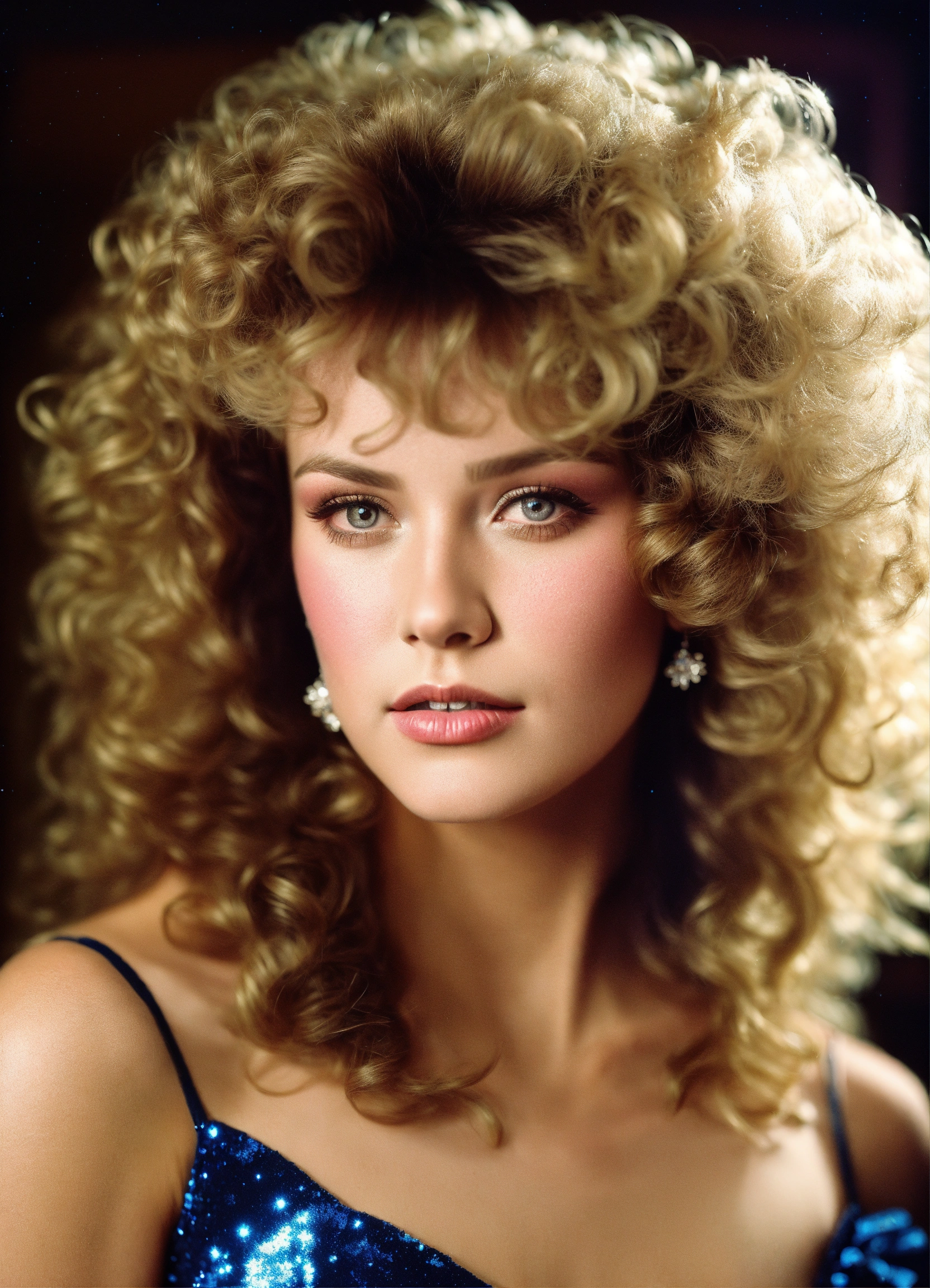 "pretty 80s prom queen", massive 80s perm curls, huge fluffy 80s prom dress, taffeta, glitter, head and shoulders portrait, intricately detailed eyes