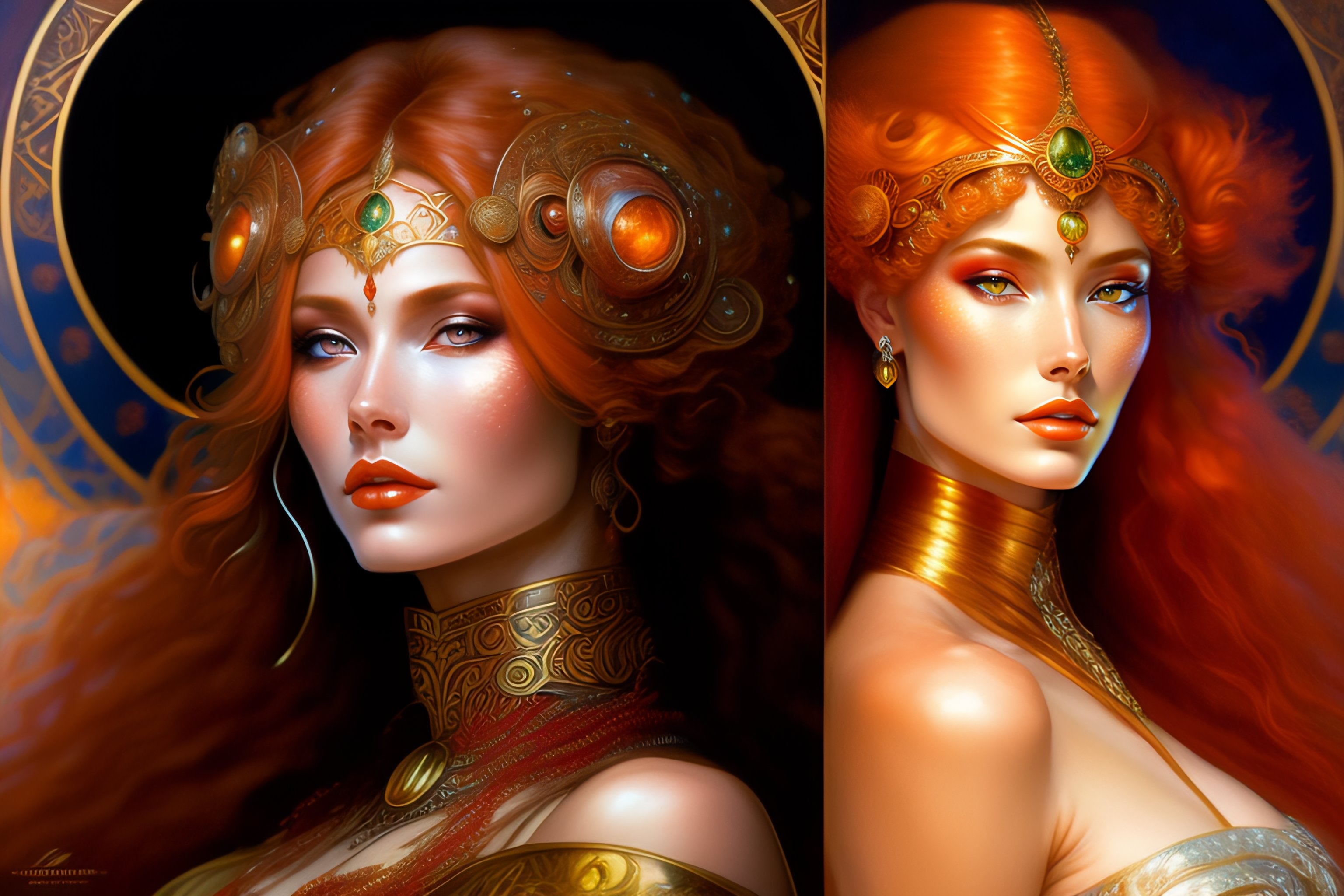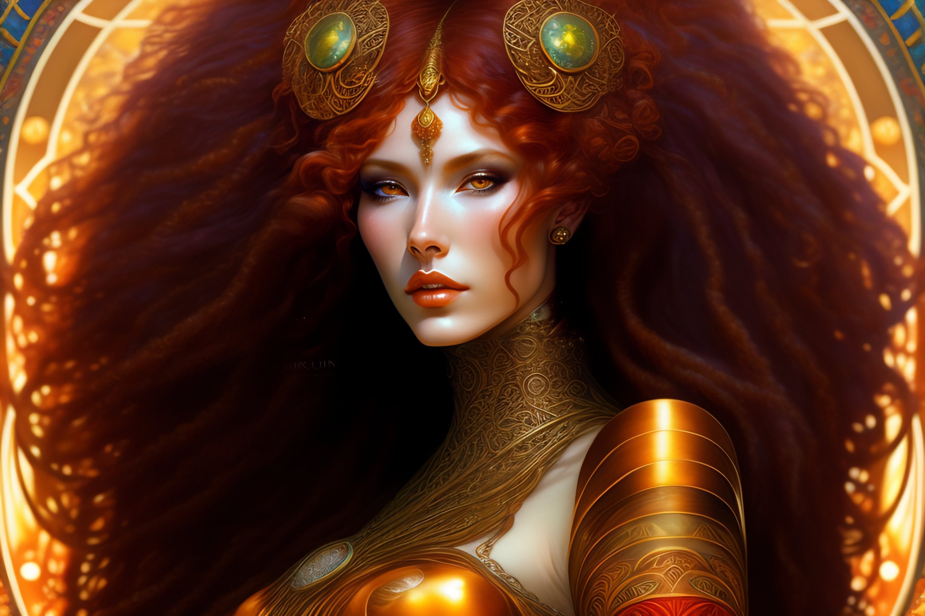 Realistic detailed portrait of a beautiful futuristic celtic red hairy alien woman by gustav klimt, alphonse mucha, ayami kojima, amano, greg hildebrandt, and mark brooks, art nouveau, ornate italian renaissance cyberpunk, neo - gothic, gothic, character concept design