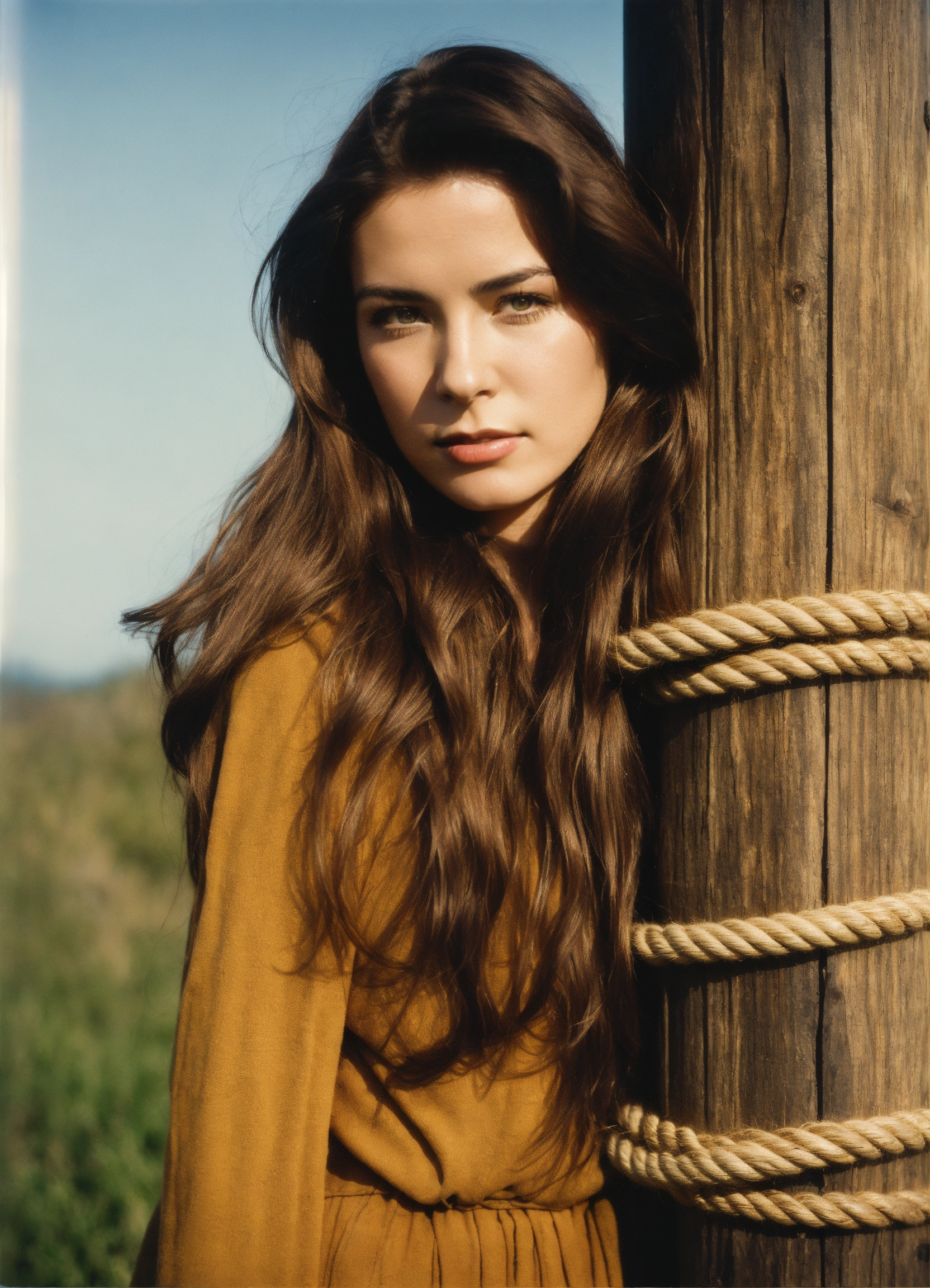 A photograph of a woman with long brown hair leaning against a wooden post with rope