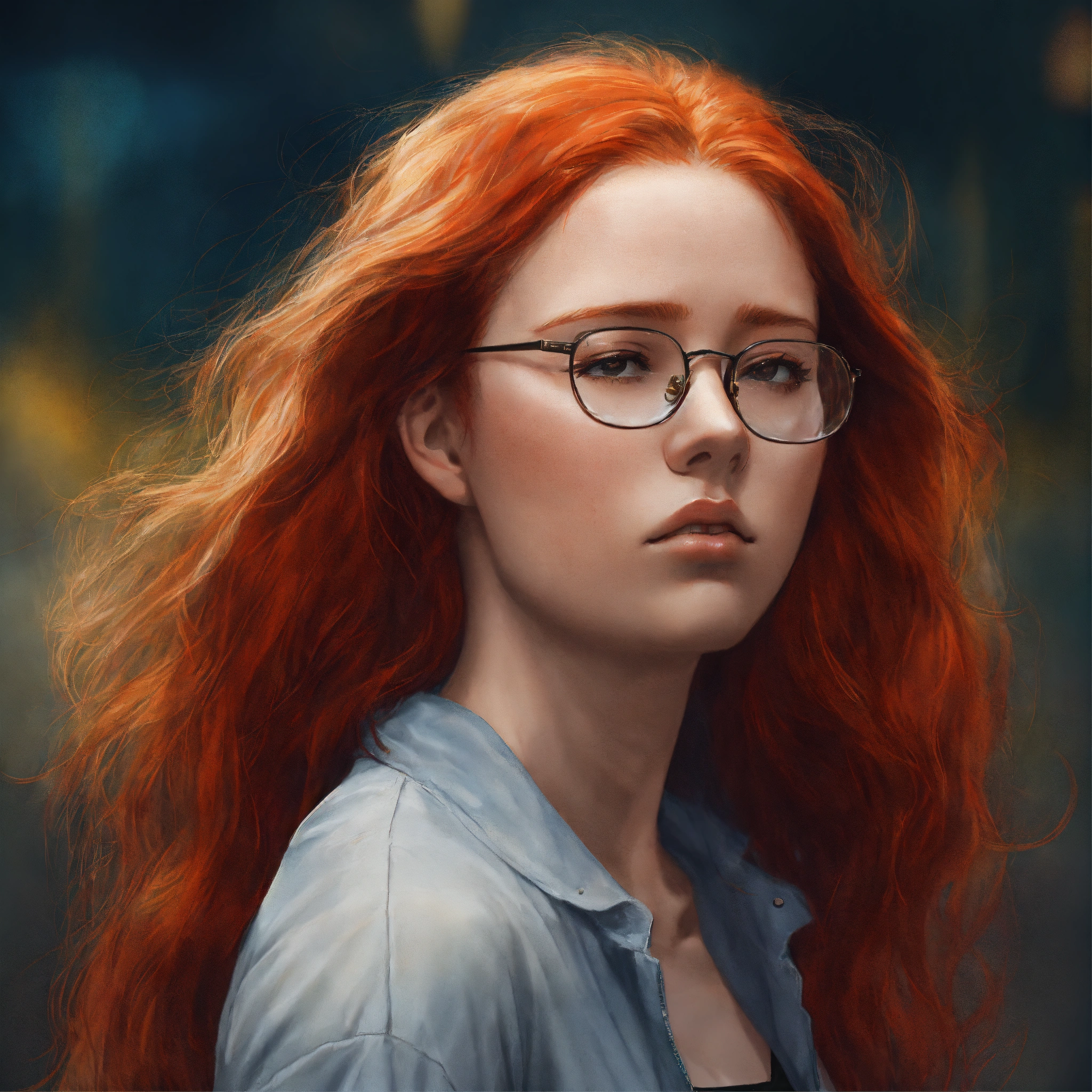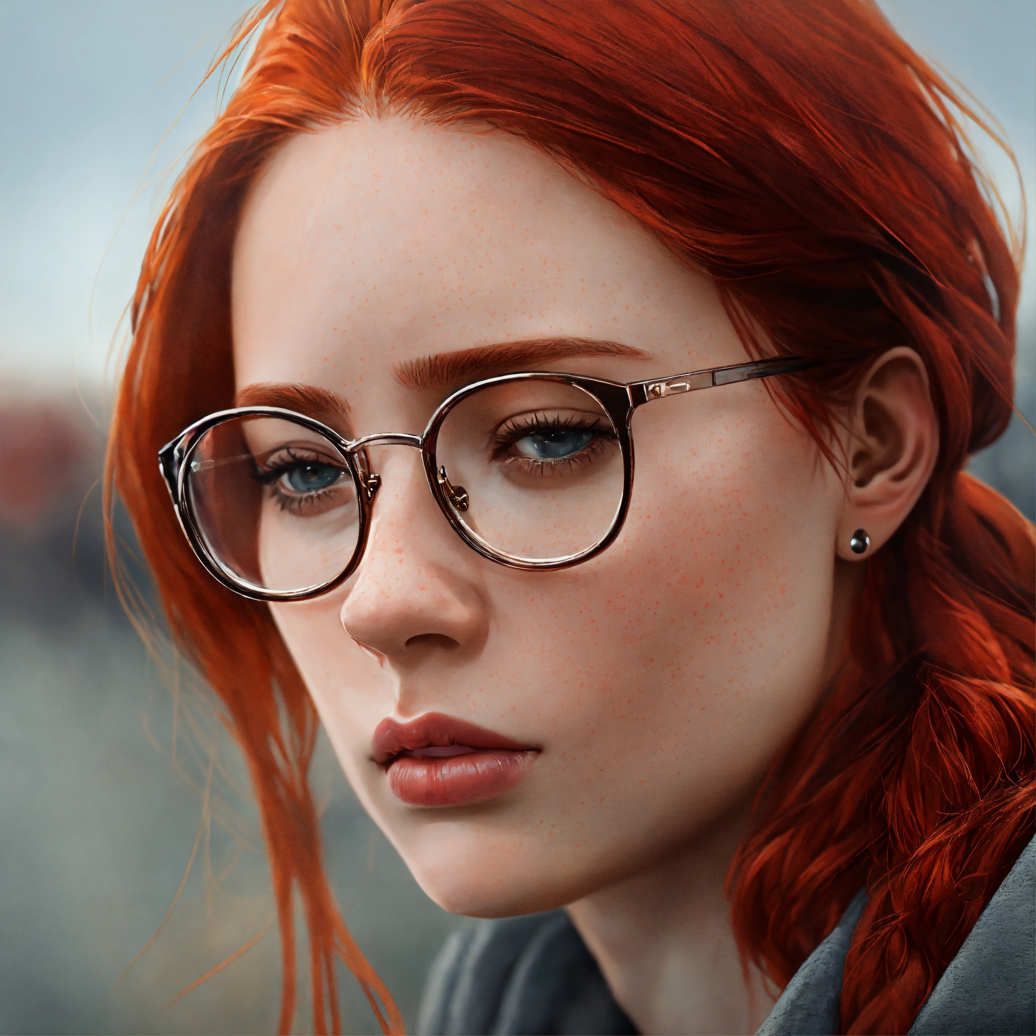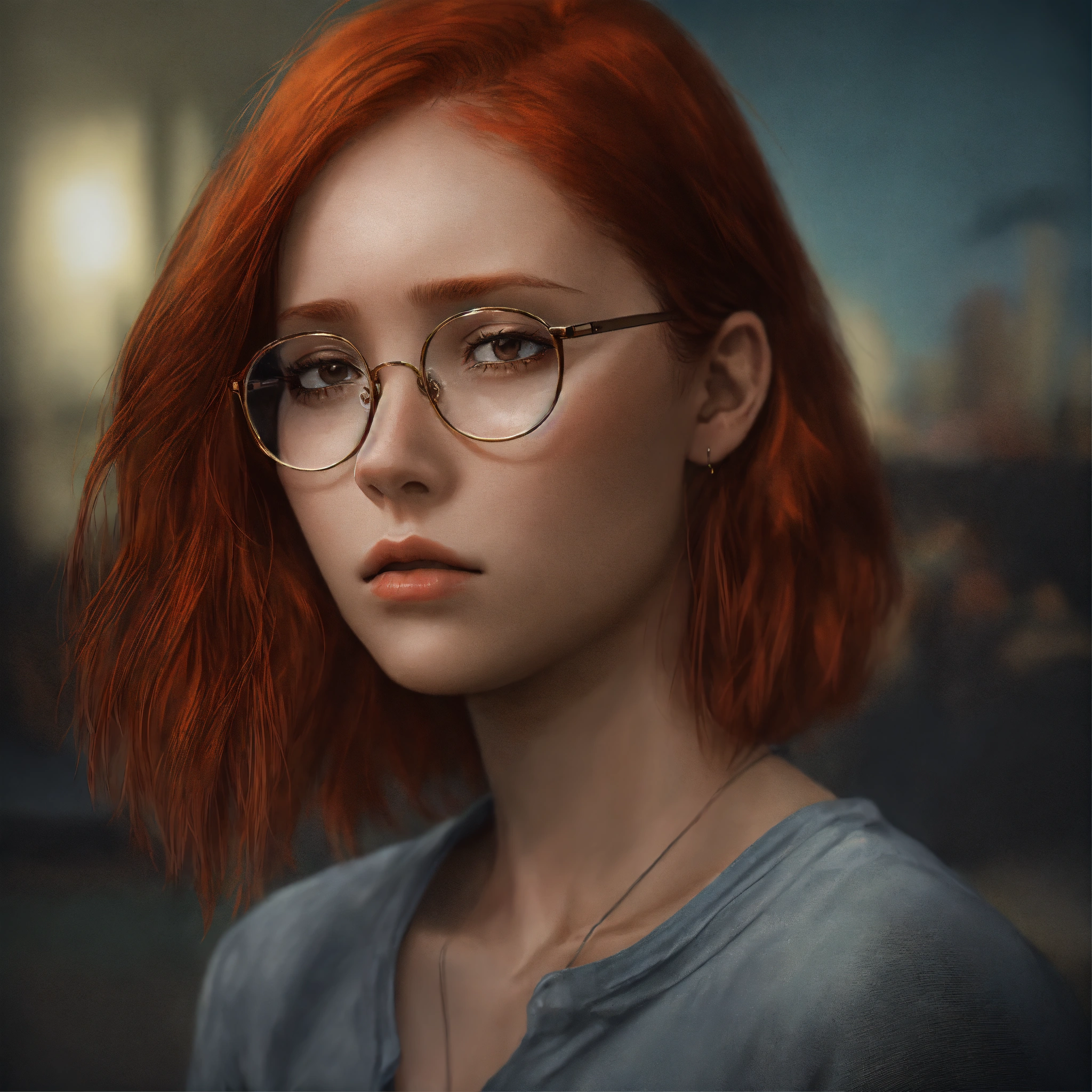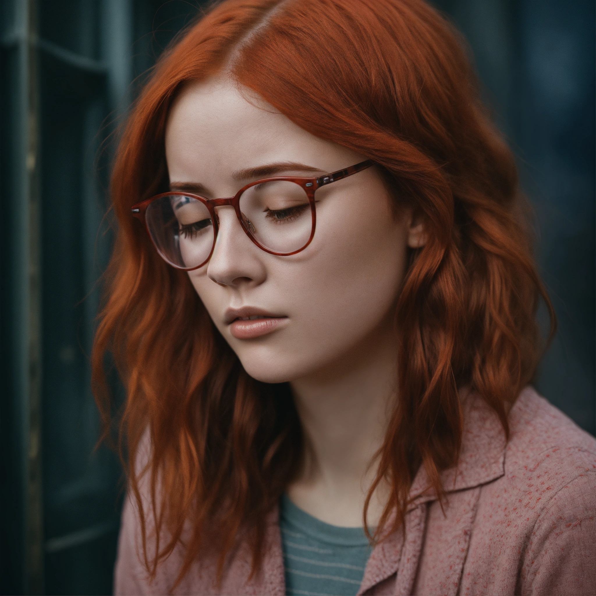 A young woman with red hair and glasses realistic image with her head down with a sad expression