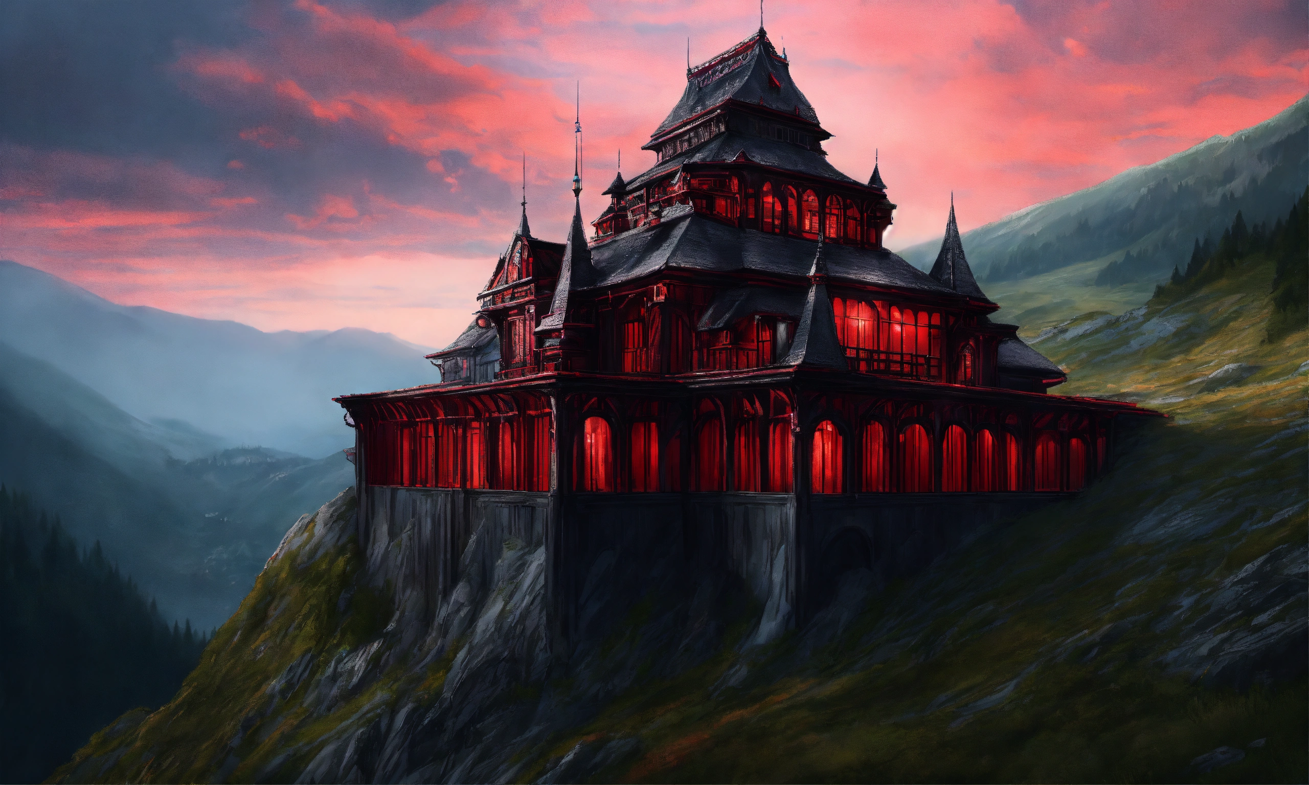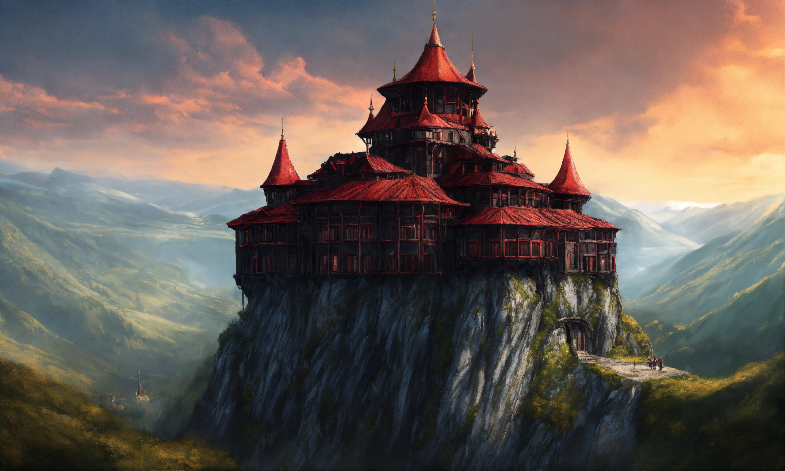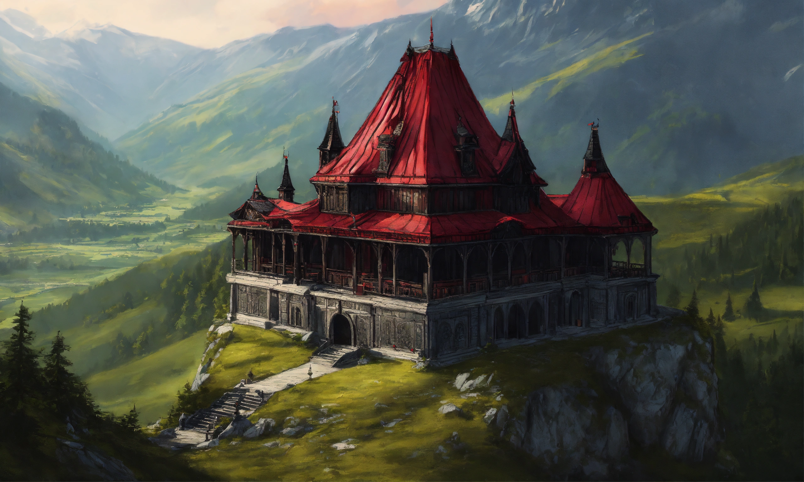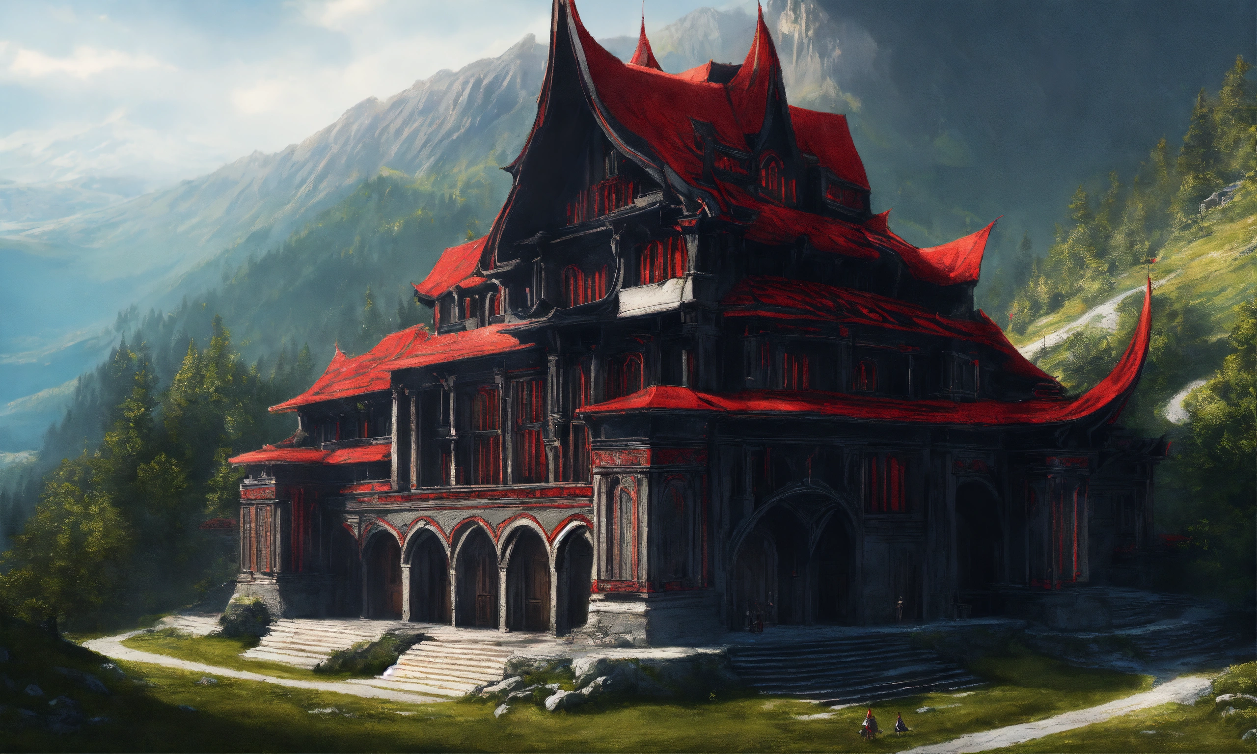 Drawing of an elegant high elf sci fi black palace with a crimson roof built into a mountainside in romania, elf architecture, beautiful day, immensely detailed, high definition