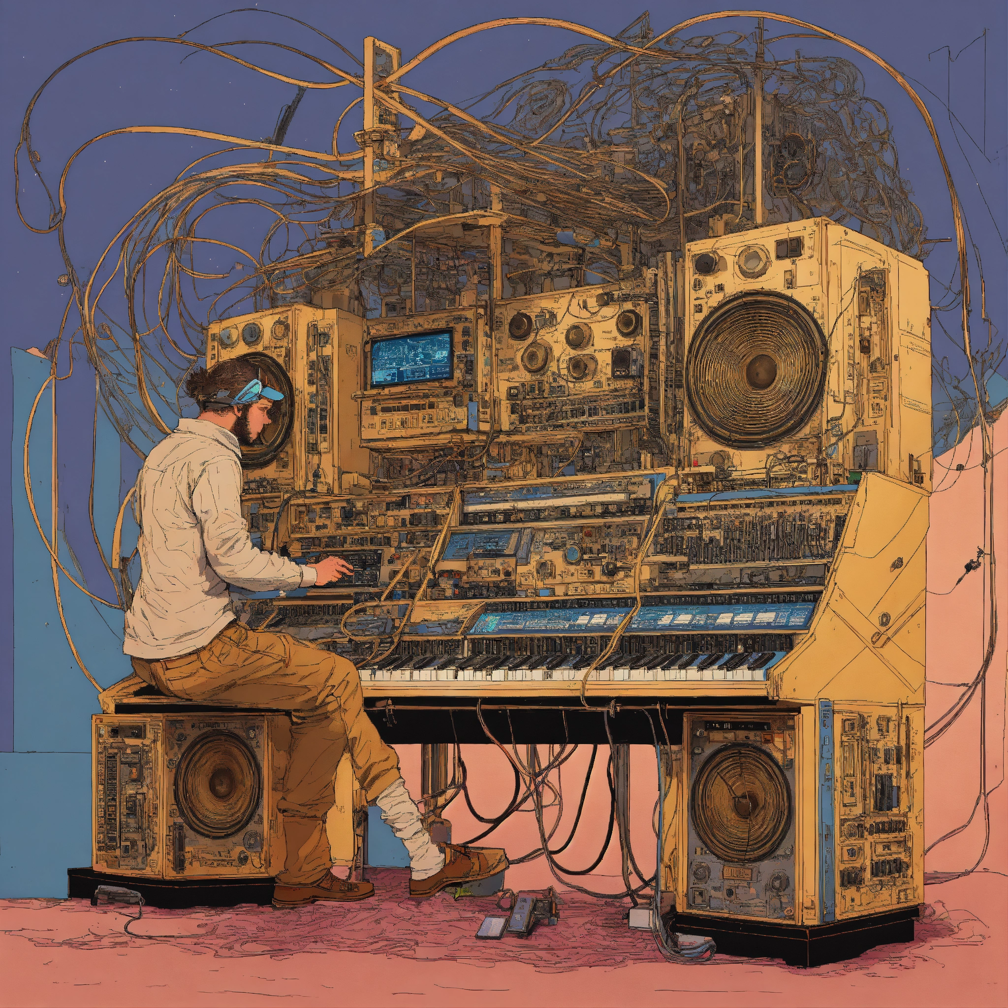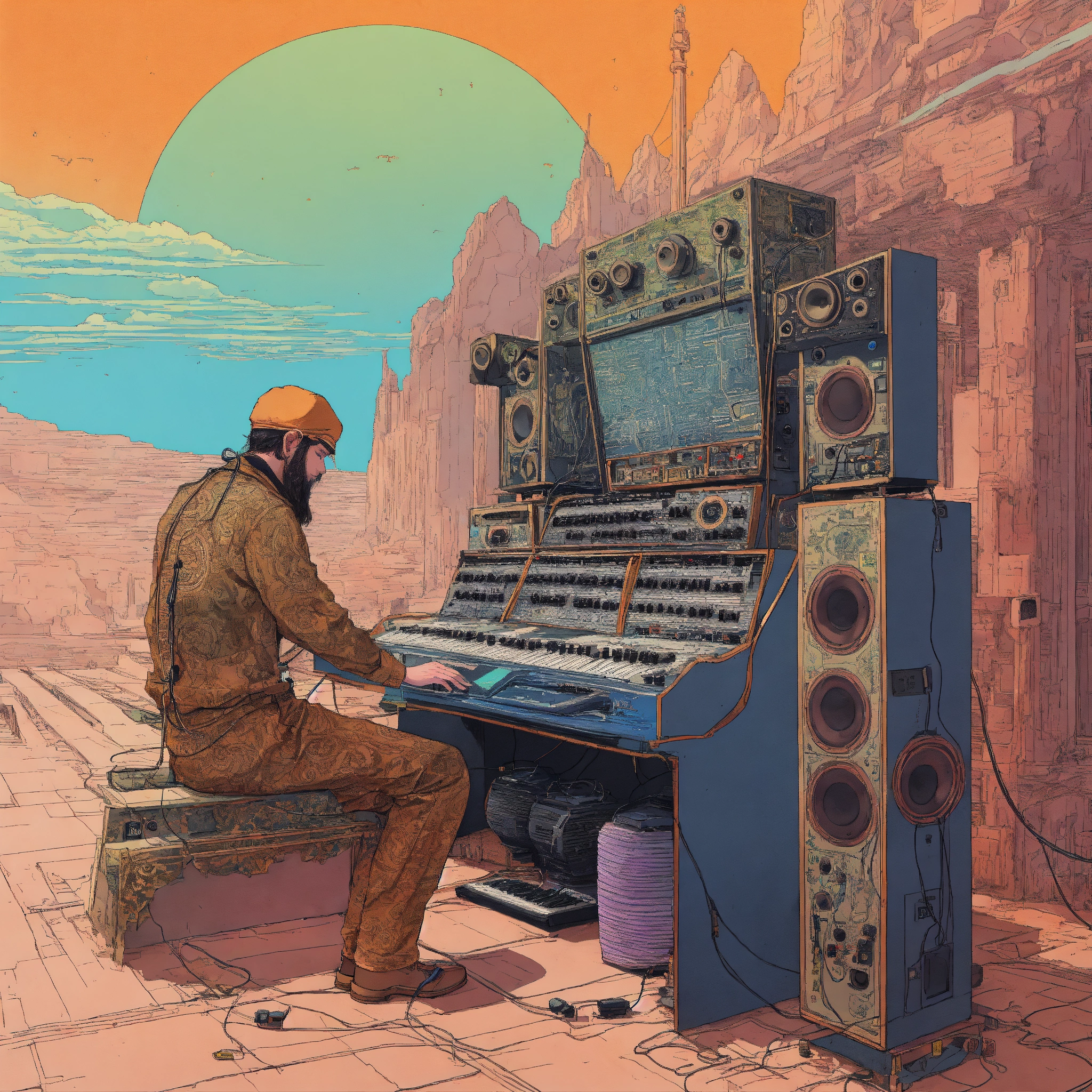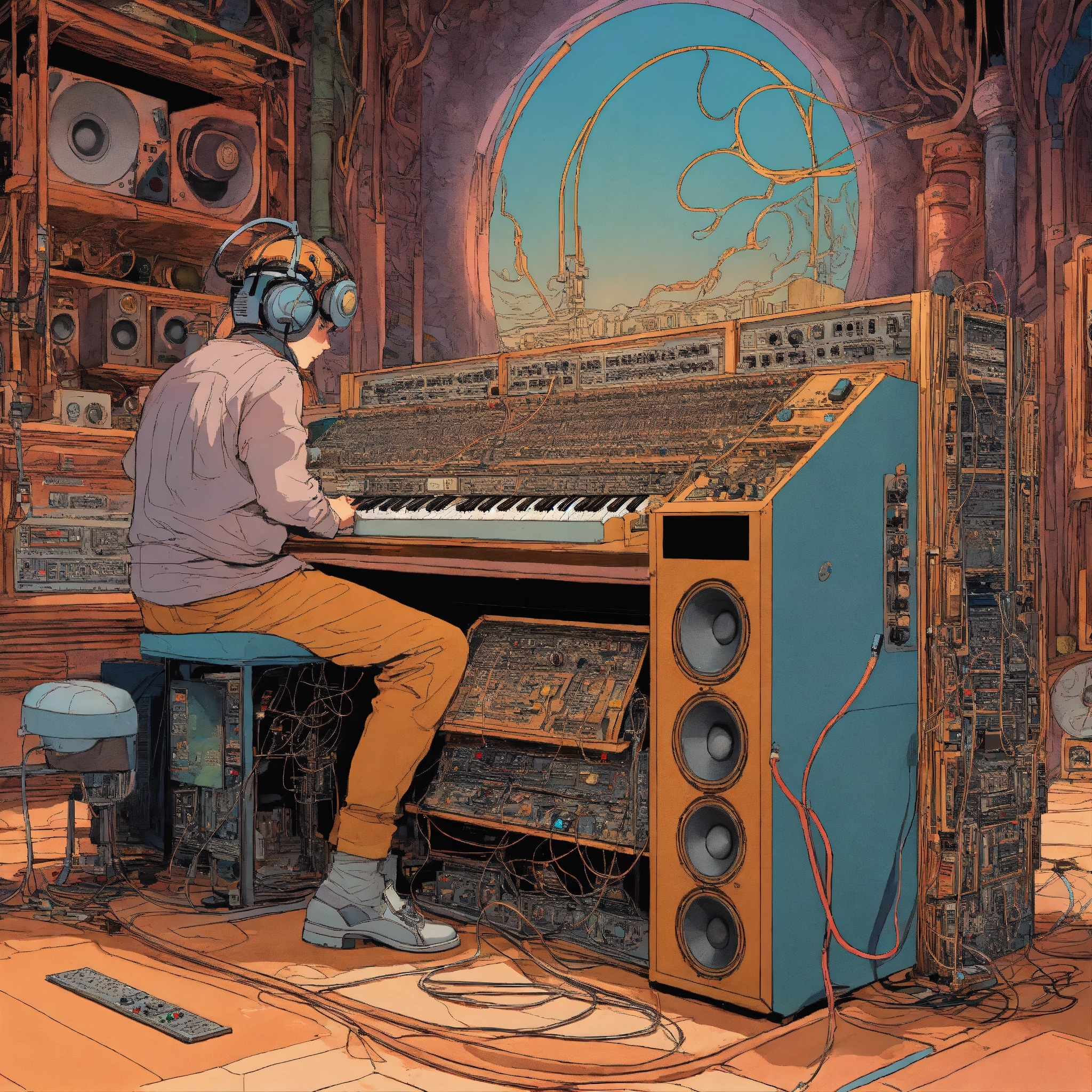 Intricate detailed artwork of an ancient synthesizer playing music, in the style of moebius, wires, surrounded by huge speakers, full color ink