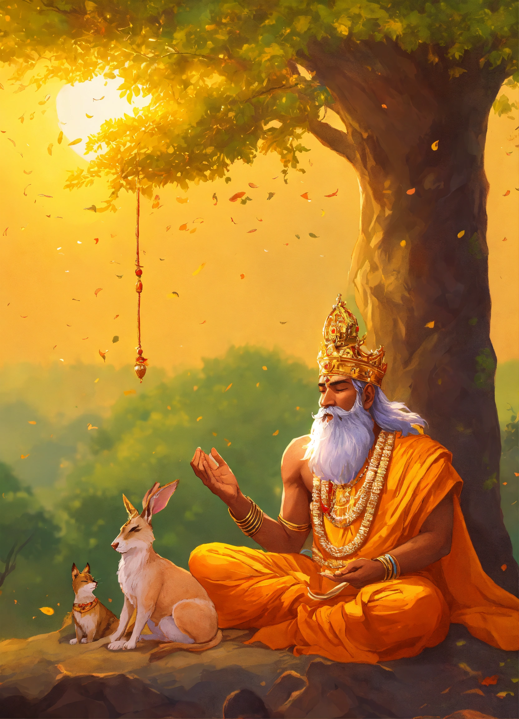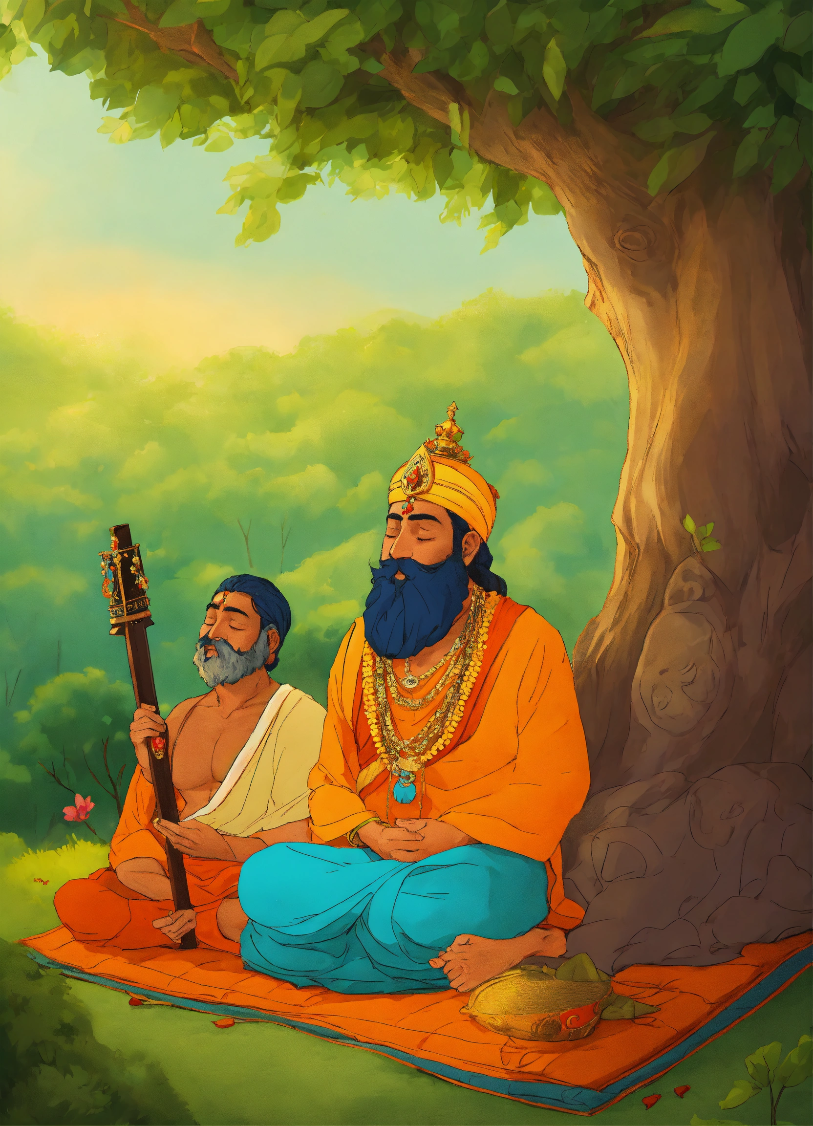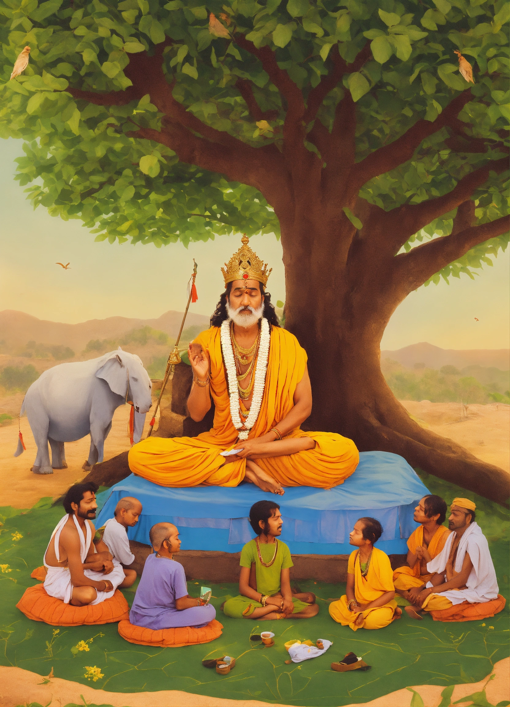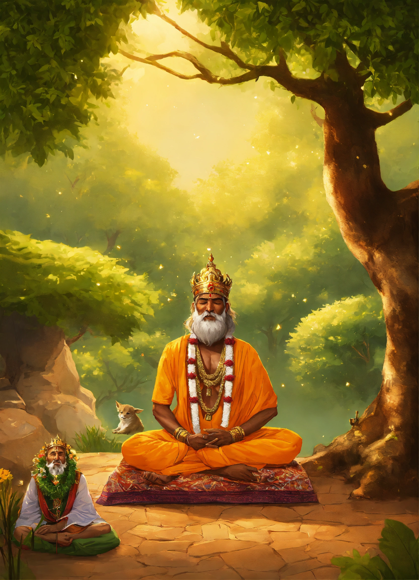 A king has sitting and sleeping under the tree beside one yogi saduvu is singing