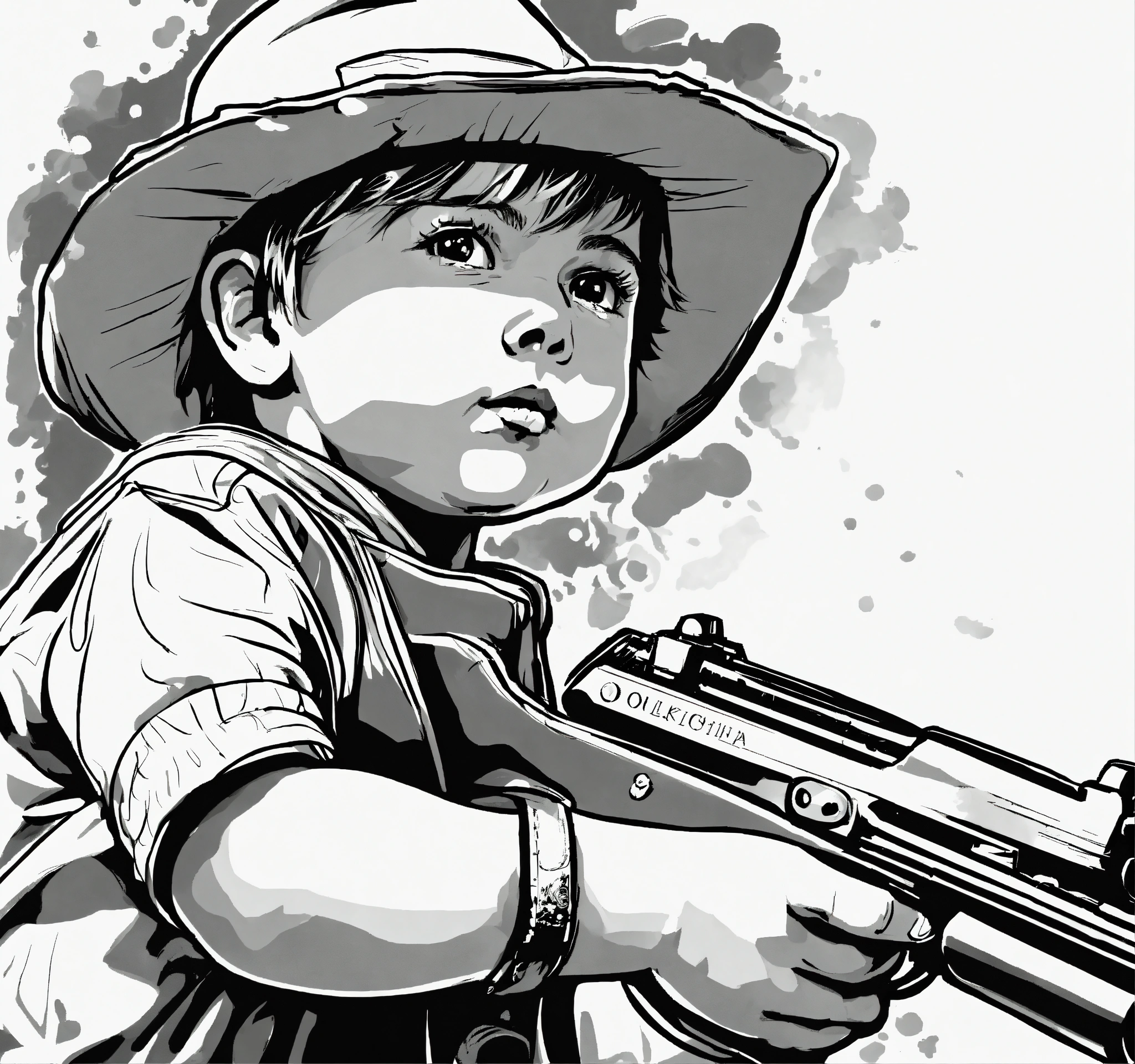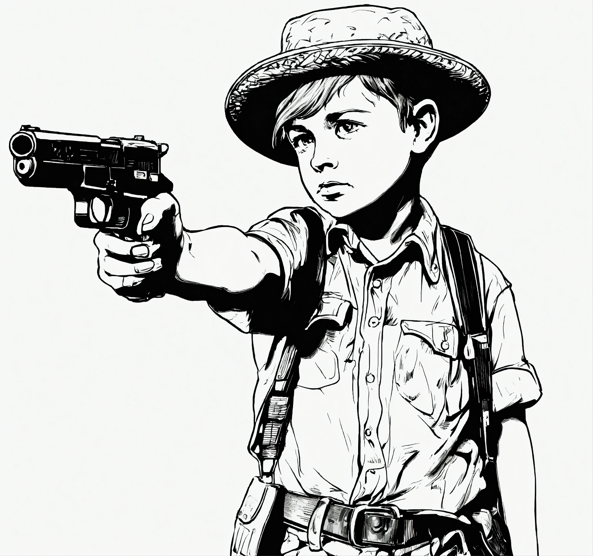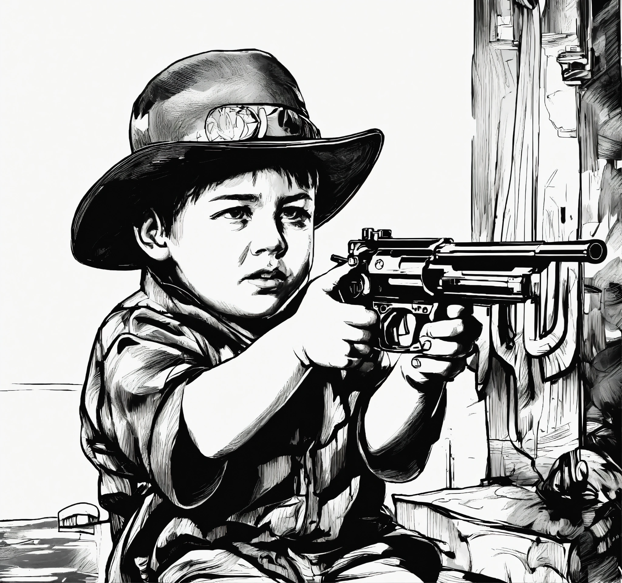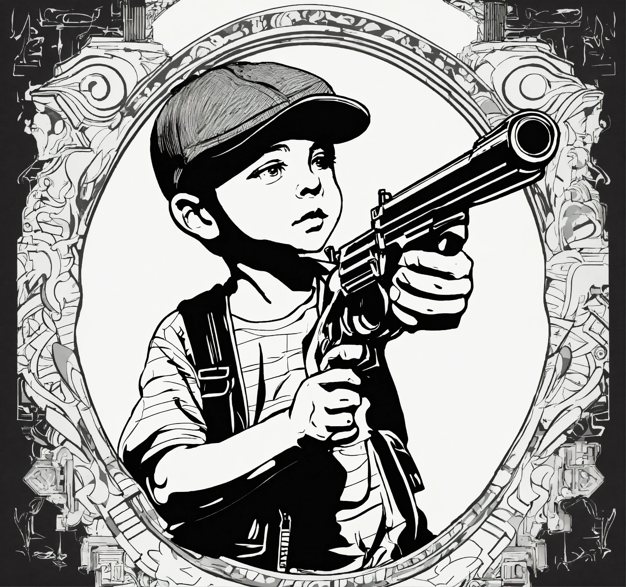 Little boy pointing a gun 1920, black and white, white background, no background, ink fine line art stylized, vector, design for tattoo, ignorant style