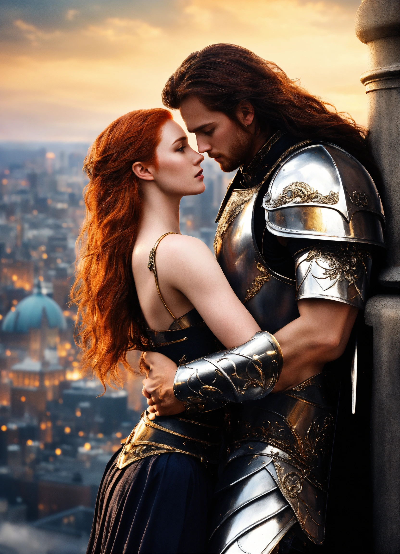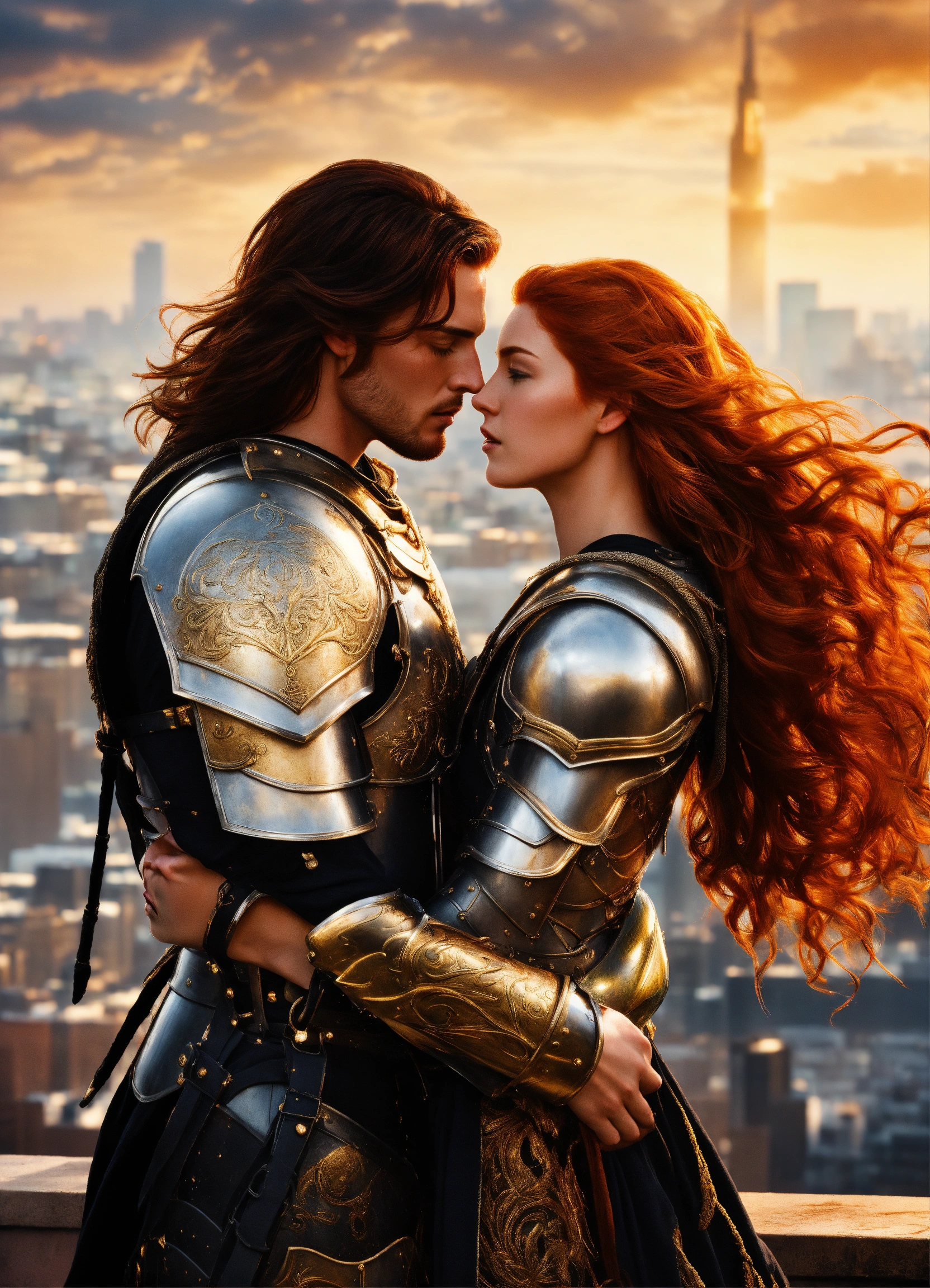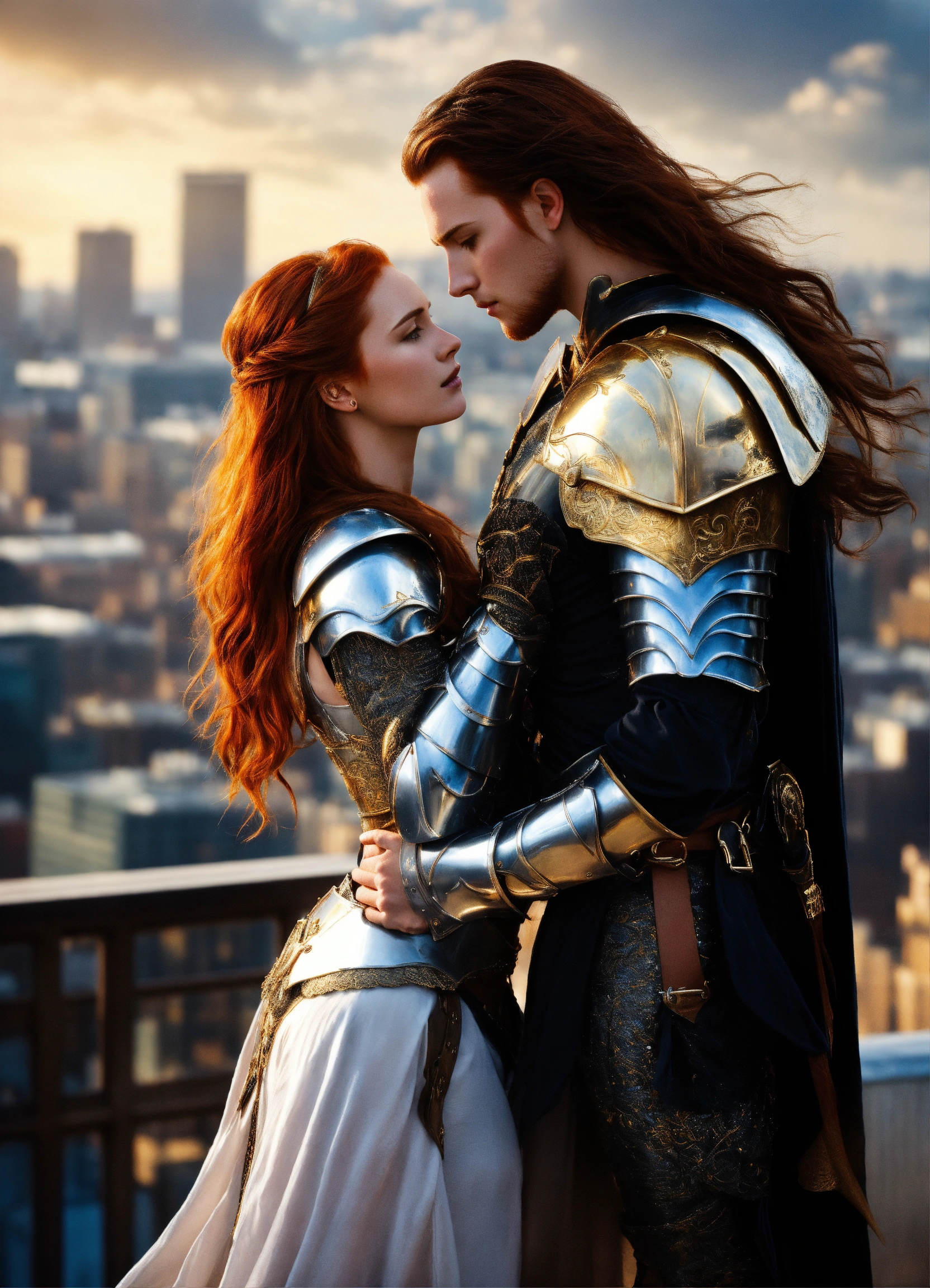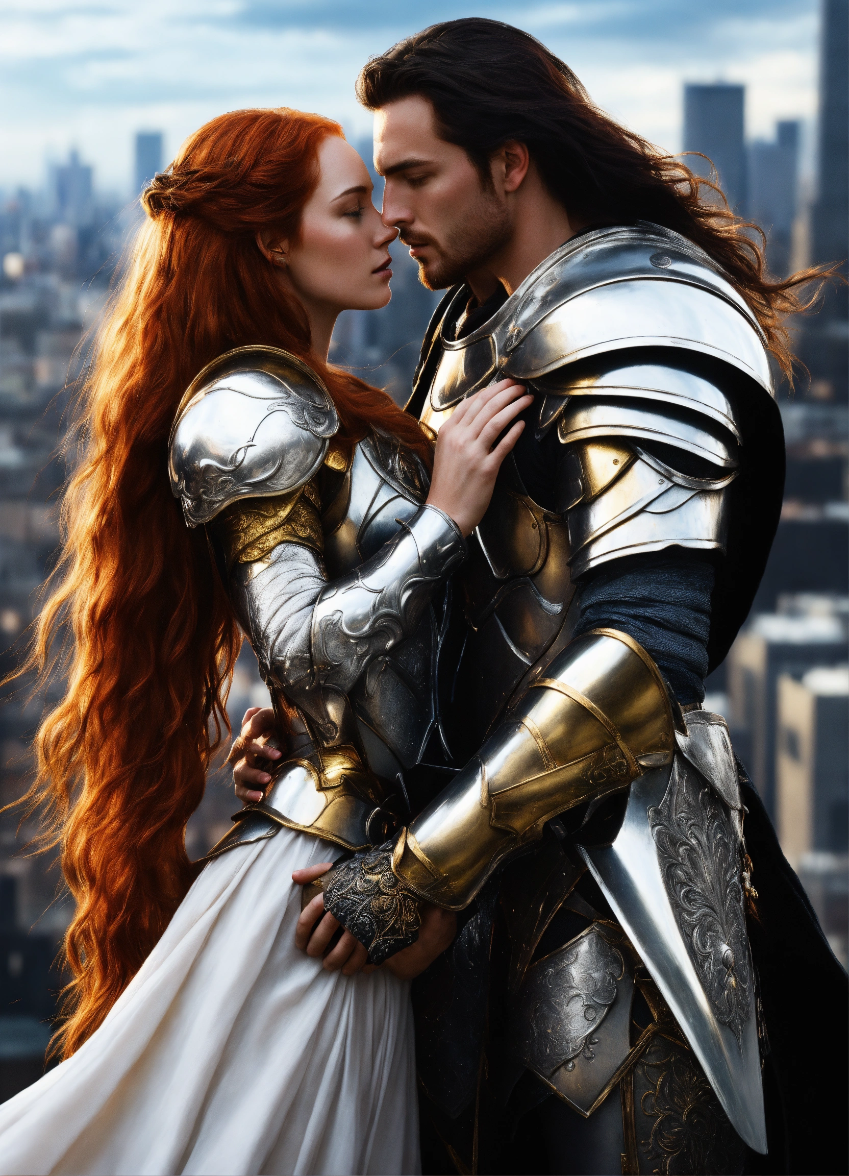 A strong white man with should length dark hair and clean shaven face, wearing silver and black battle armor embracing a beautiful irish redhead girl with long flowing hair, redhead hair, long hair, flowing hair, wearing beautiful gold armor, on romantic rooftop towering above the city skyline, fantasy, high detail, realistic photo, high detail, digital painting, cinematic, stunning, hyper-realistic, sharp focus, high resolution 8k, insanely detailed