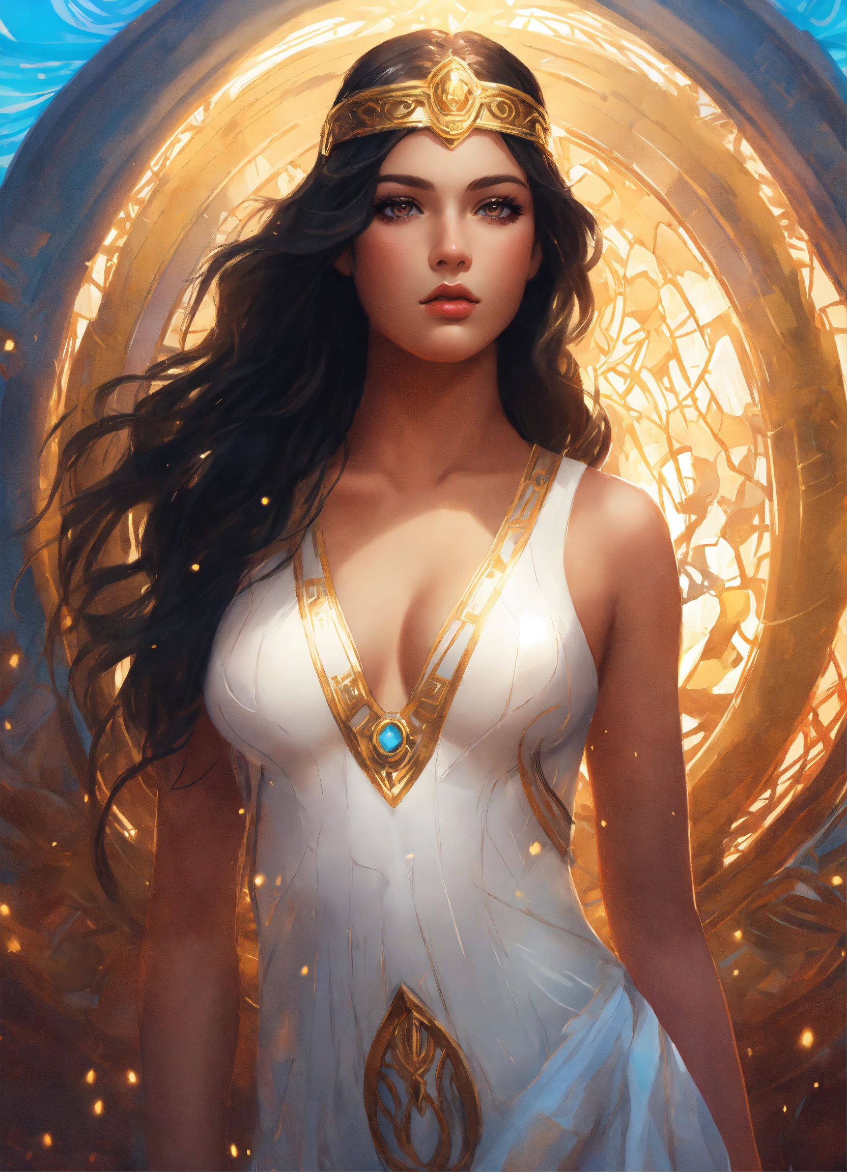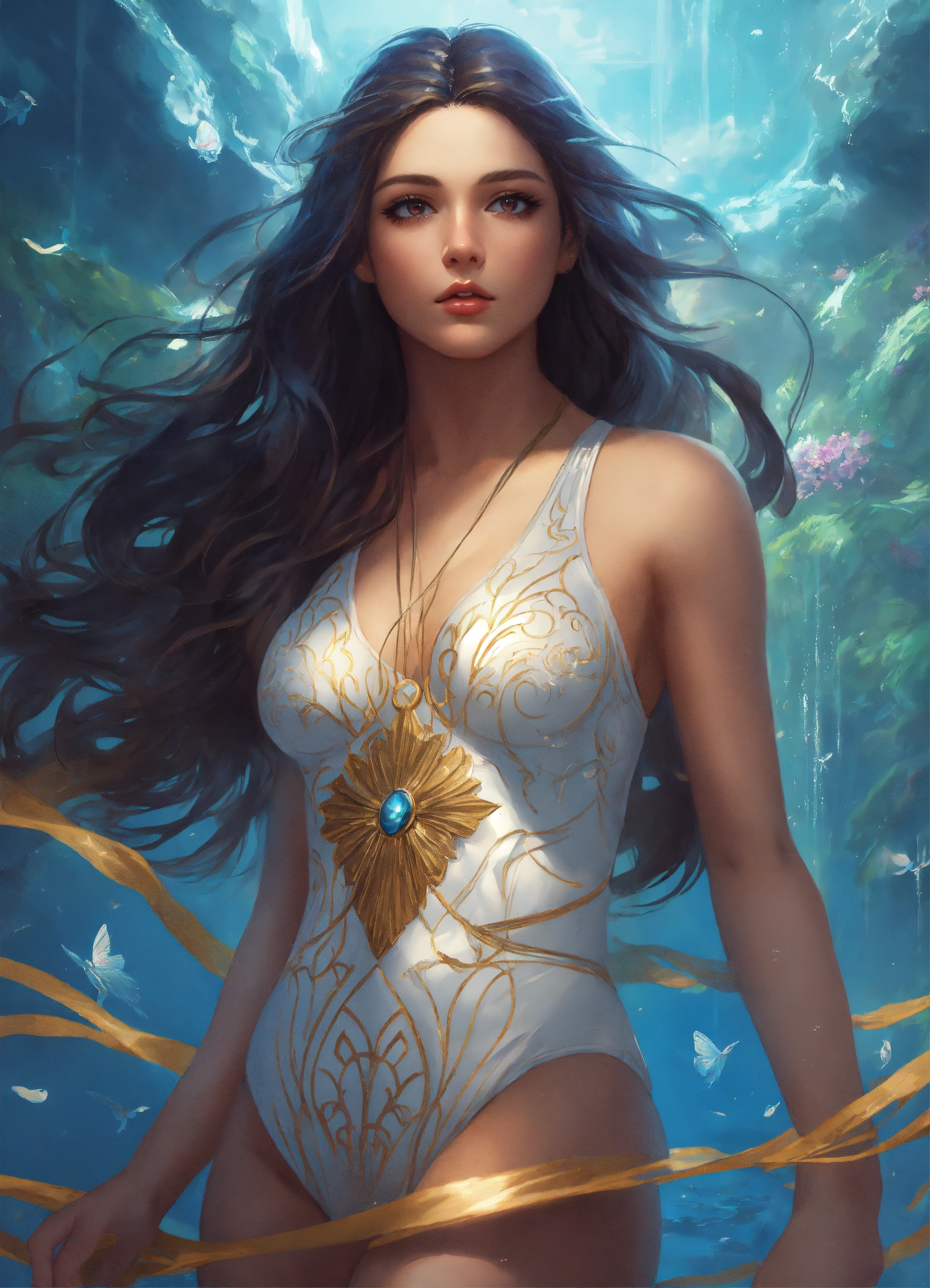 Ultra realistic illustration of mythological greek goddess with dark hair, beautiful girl in magical white swimsuit looking away, detailed face, fantasy art, artgerm style, illustration, epic, fantasy, tangled, hyperdetailed, artstation, concept art, smooth, sharp focus, trace rays, full height