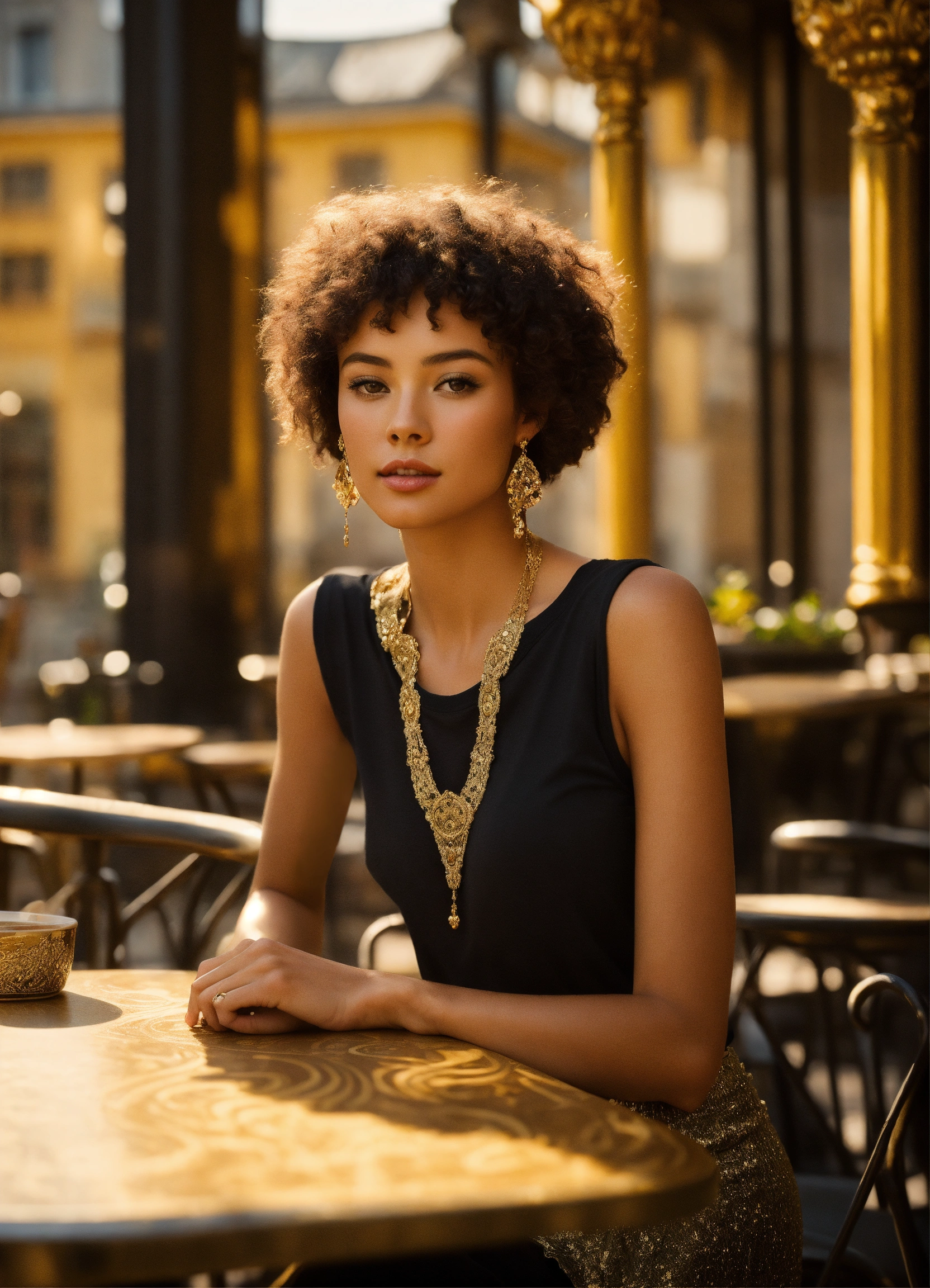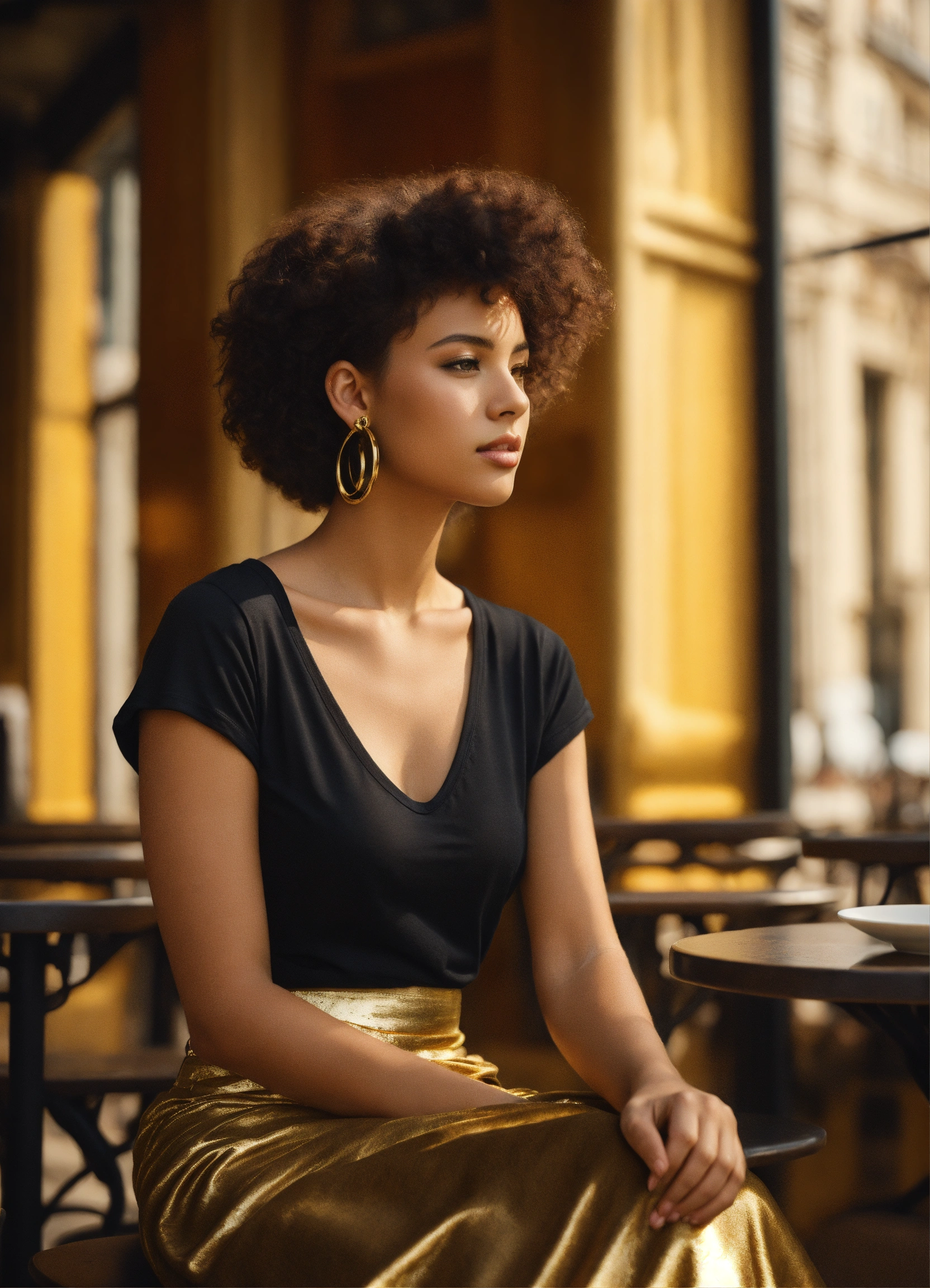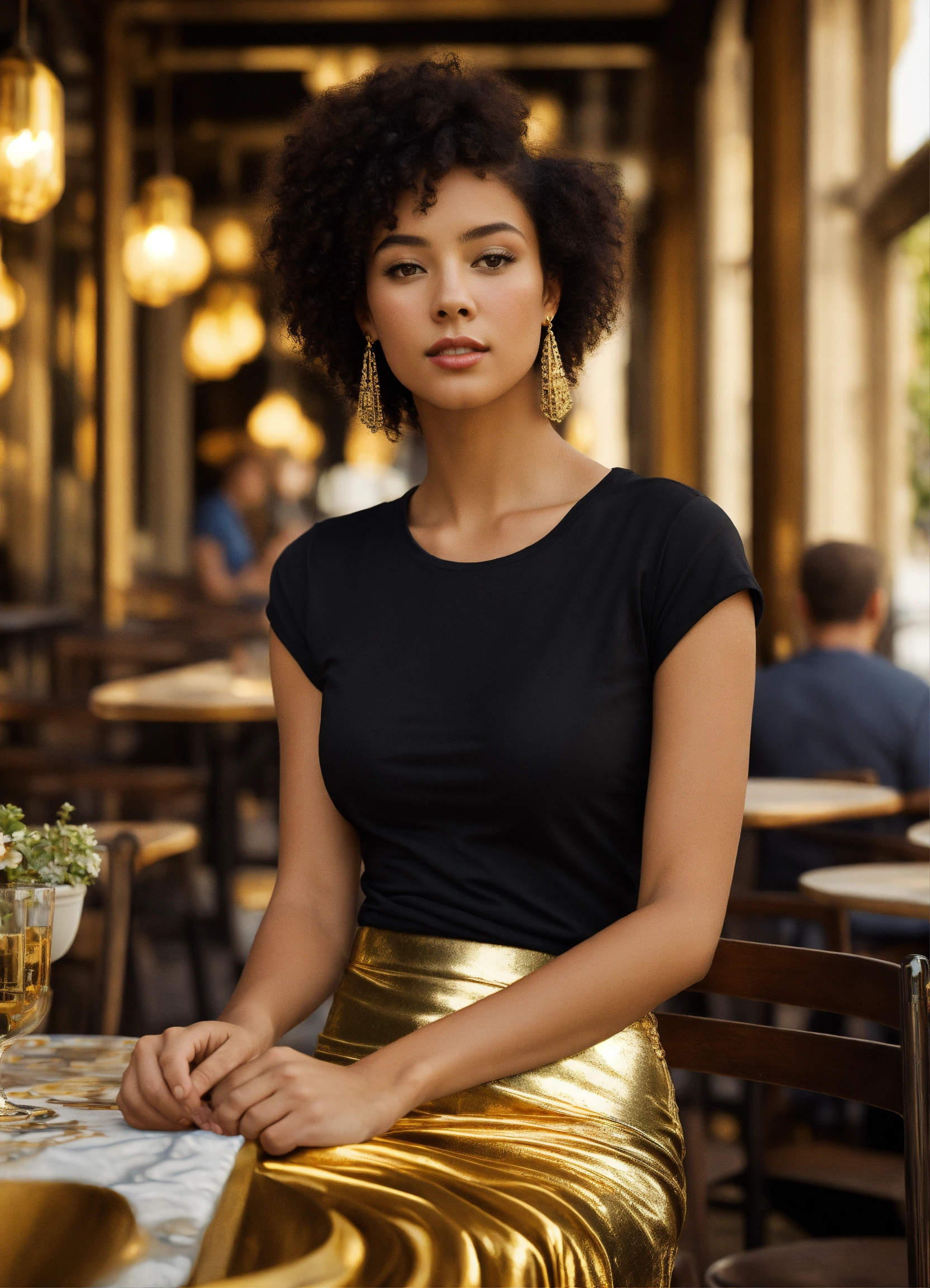 A beautiful mixed race model wearing a plain blank black t-shirt and gold skirt, sitting in a sunny european cafe with tables outside golden summer light, by gustav klimt art, deco art nouveau style, stunning intricate details, high definition, 8k render. front of the shirt should be visible for product art placement.