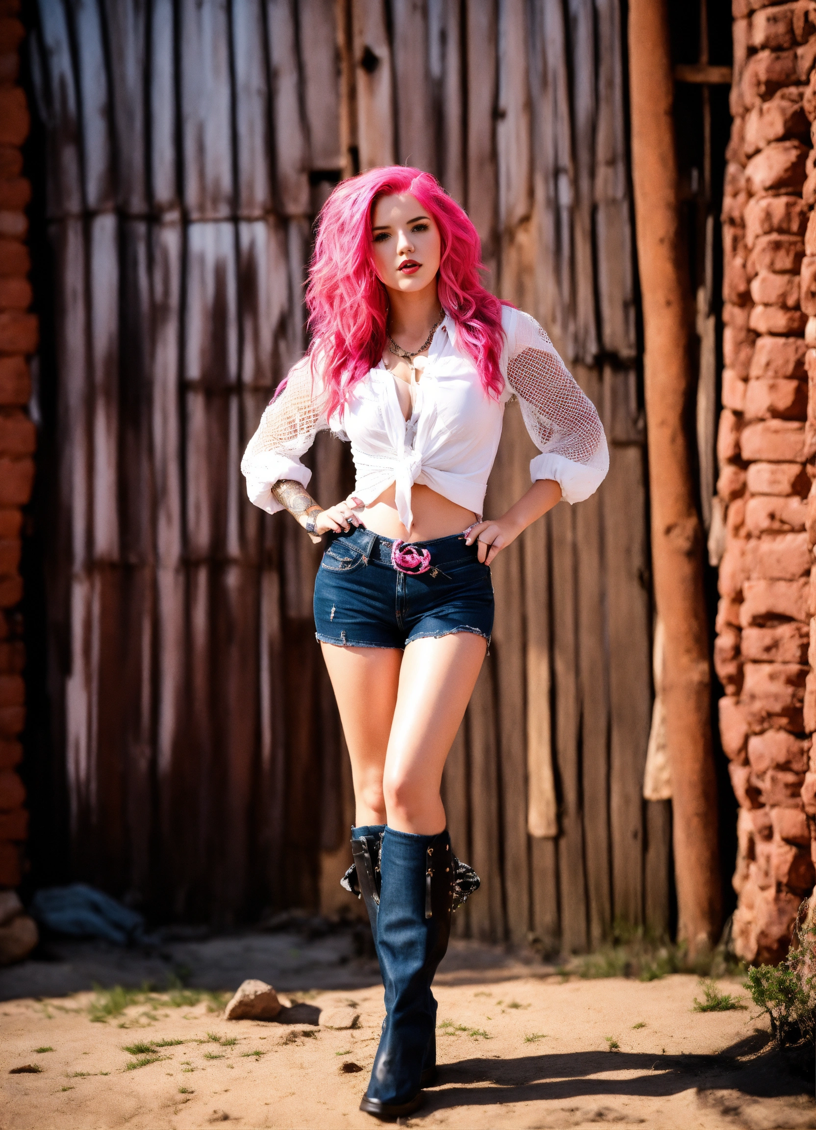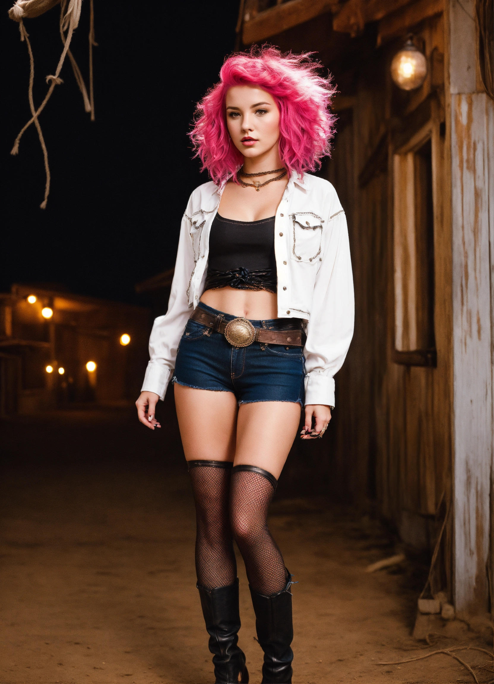 A real photo of a hot 25 year old cowgirl with bright pink hair. she is wearing a white knotted fishnet blouse, tight short black denim hotpants and a leather had. she stands in a very old western alien town