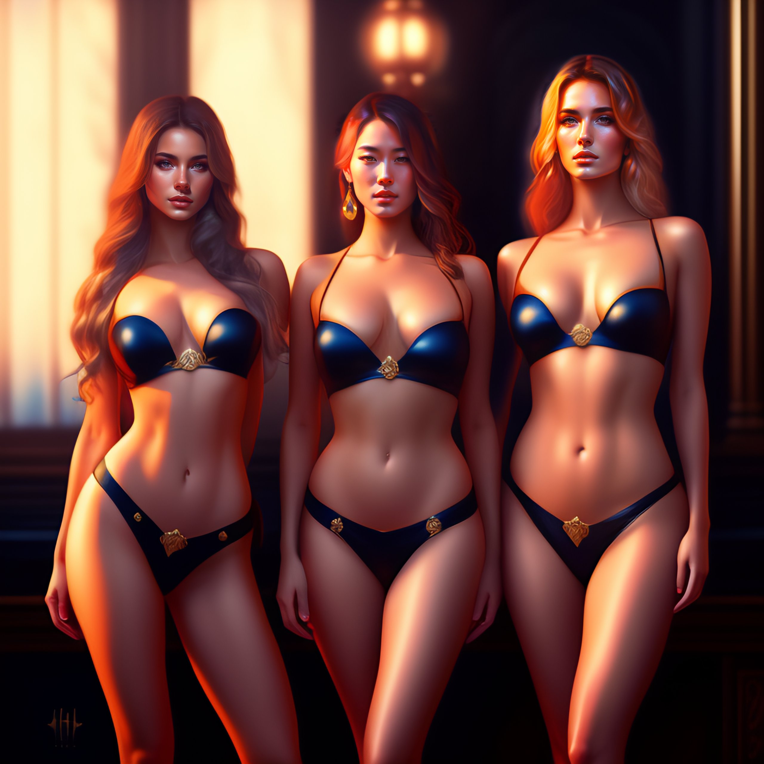 A group of four young half-naked women, not a portrait, intrincated details, oil on canvas, masterpiece, featured on pixiv, cinematic composition, dramatic pose, beautiful lighting, sharp, details, hyper-detailed, hd, hdr, 4k, 8k